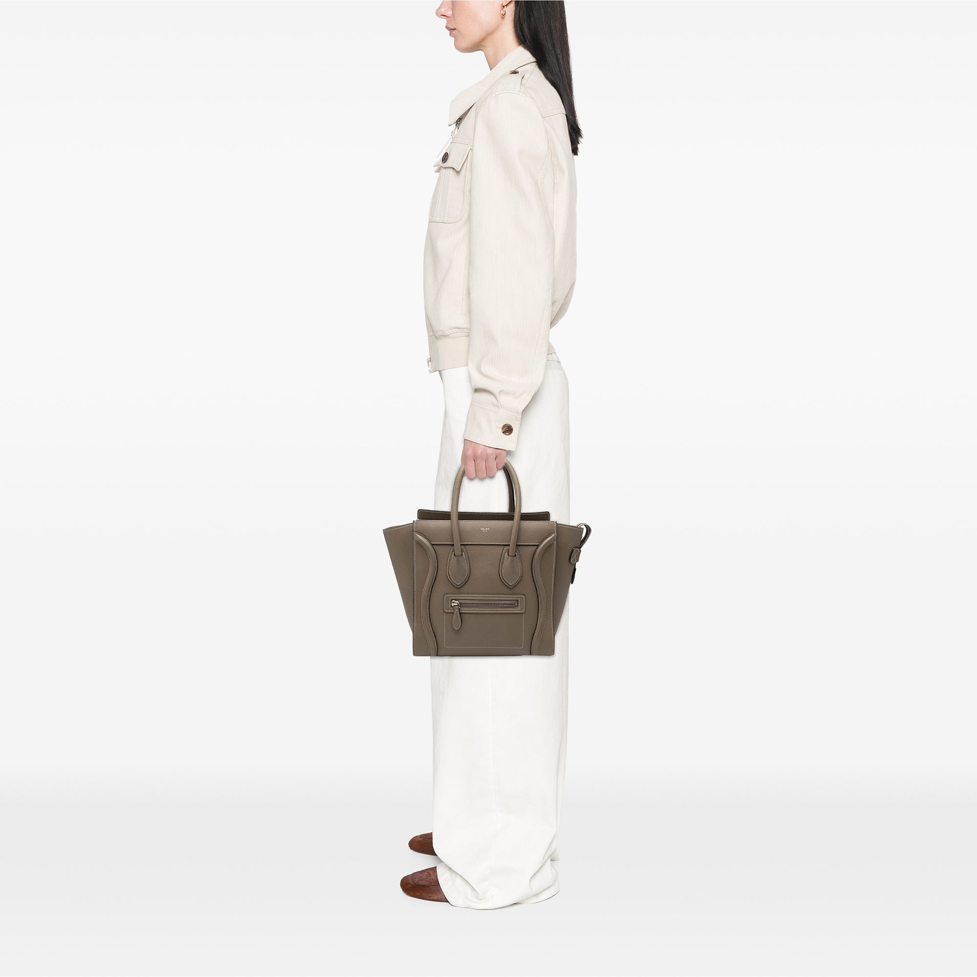 The Micro Luggage Tote features a leather body, rolled leather handles, a top zip closure, an exterior front zip pocket, and interior zip and slip pockets. Inclusion: Dust bag. Retail Price: 3300.00