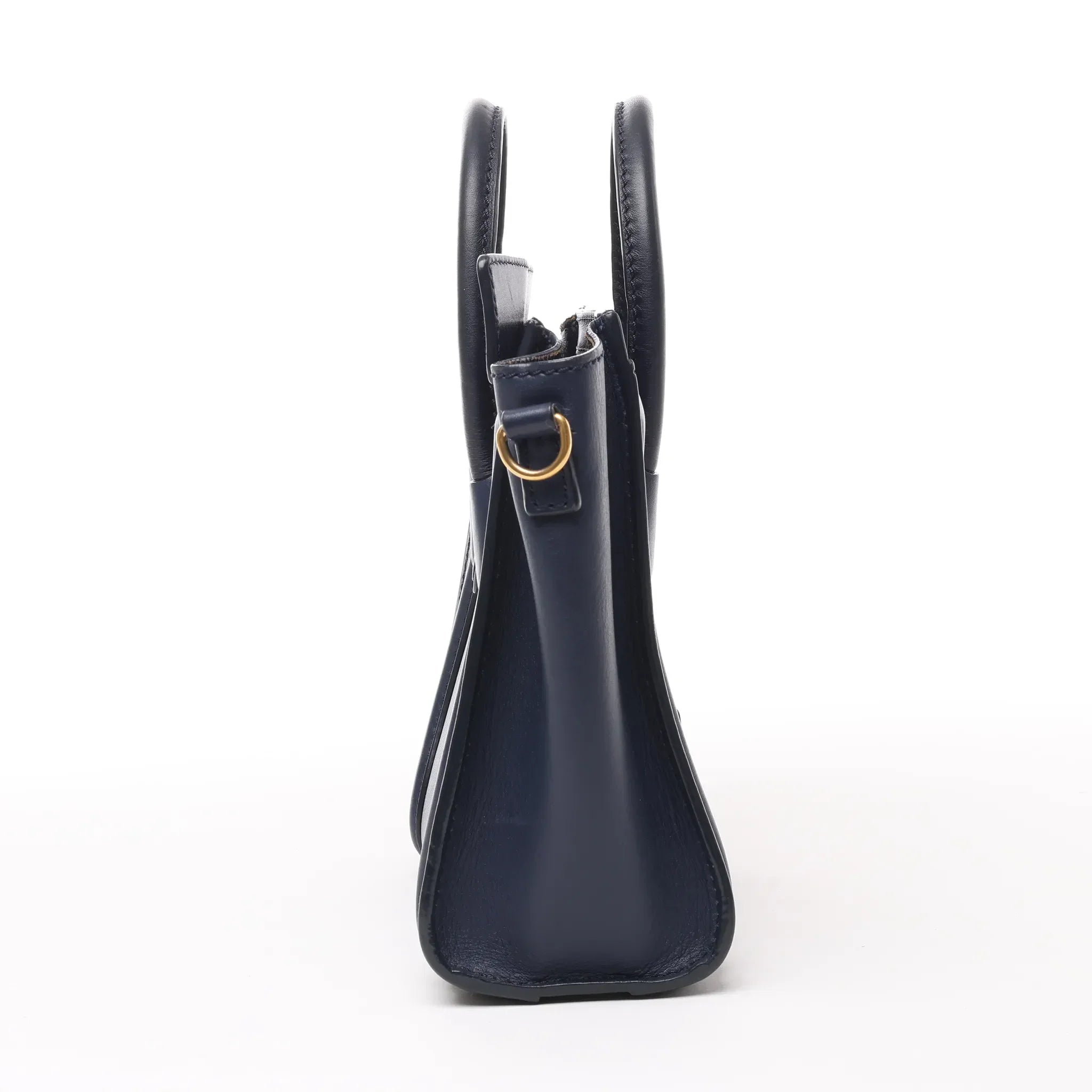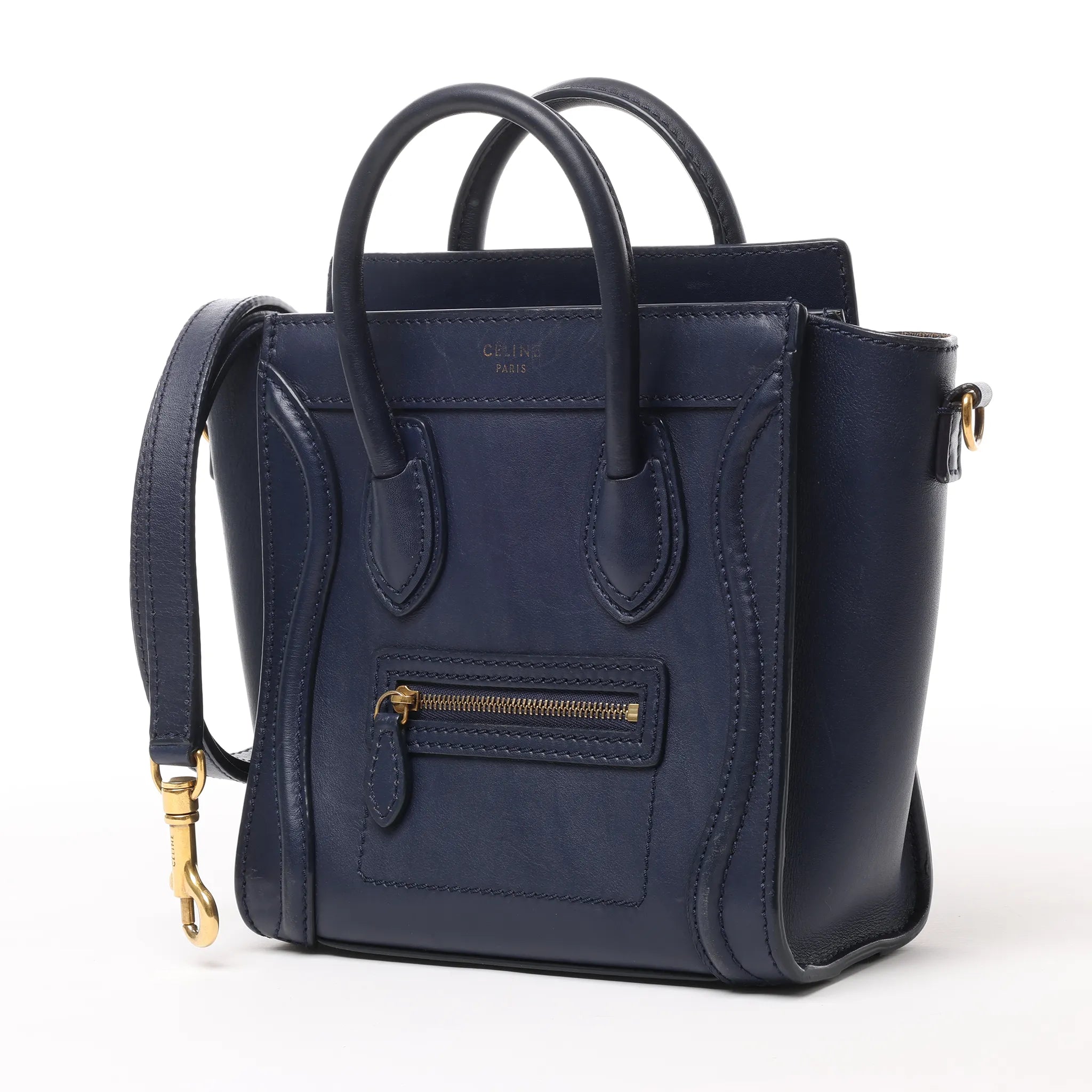 CELINE Nano Luggage 2Way Handbag in navy blue smooth leather, featuring a structured silhouette, dual top handles, detachable shoulder strap, and signature front zip pocket. A chic, versatile luxury bag for day-to-night style.