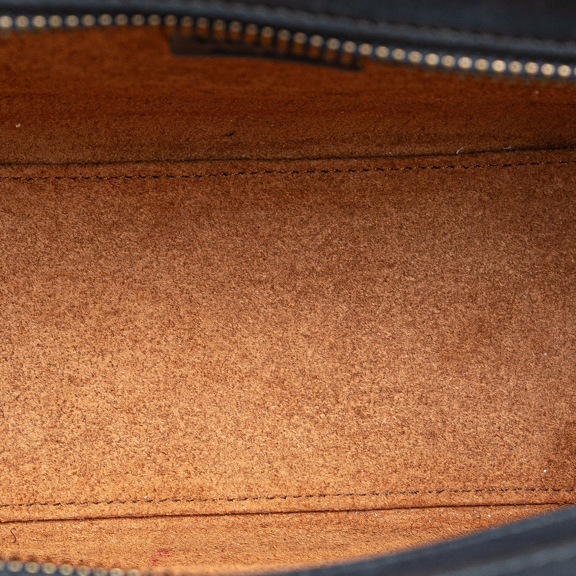 The Nano Luggage Tote features a leather body, rolled leather handles, a detachable flat leather shoulder strap, a top zip closure, an exterior front zip pocket, and interior slip pockets. Retail Price: 2800.00