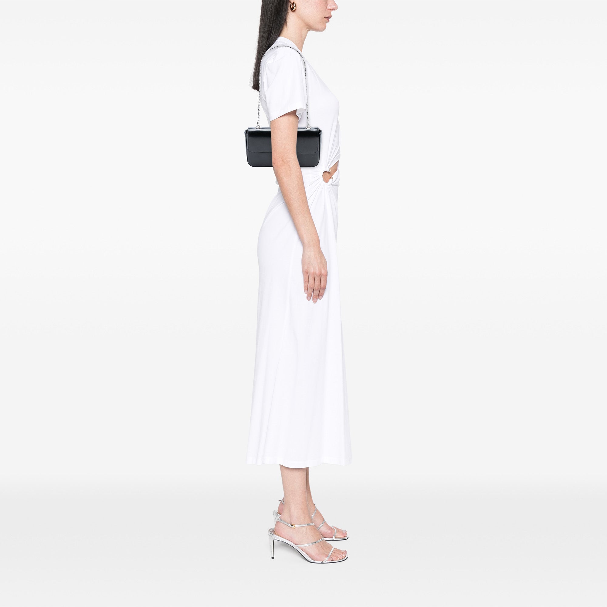 This shoulder bag features a leather body, a chain-link shoulder strap, a front flap with magnetic snap closure, and an interior slip pocket. Retail Price: 3450.00