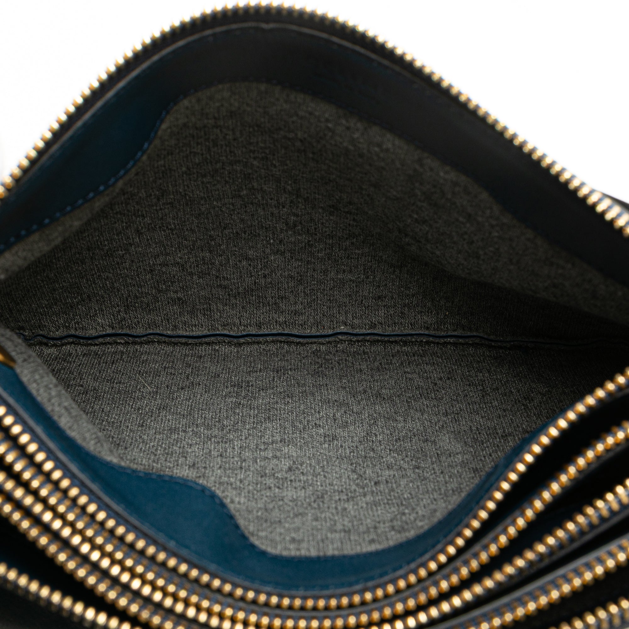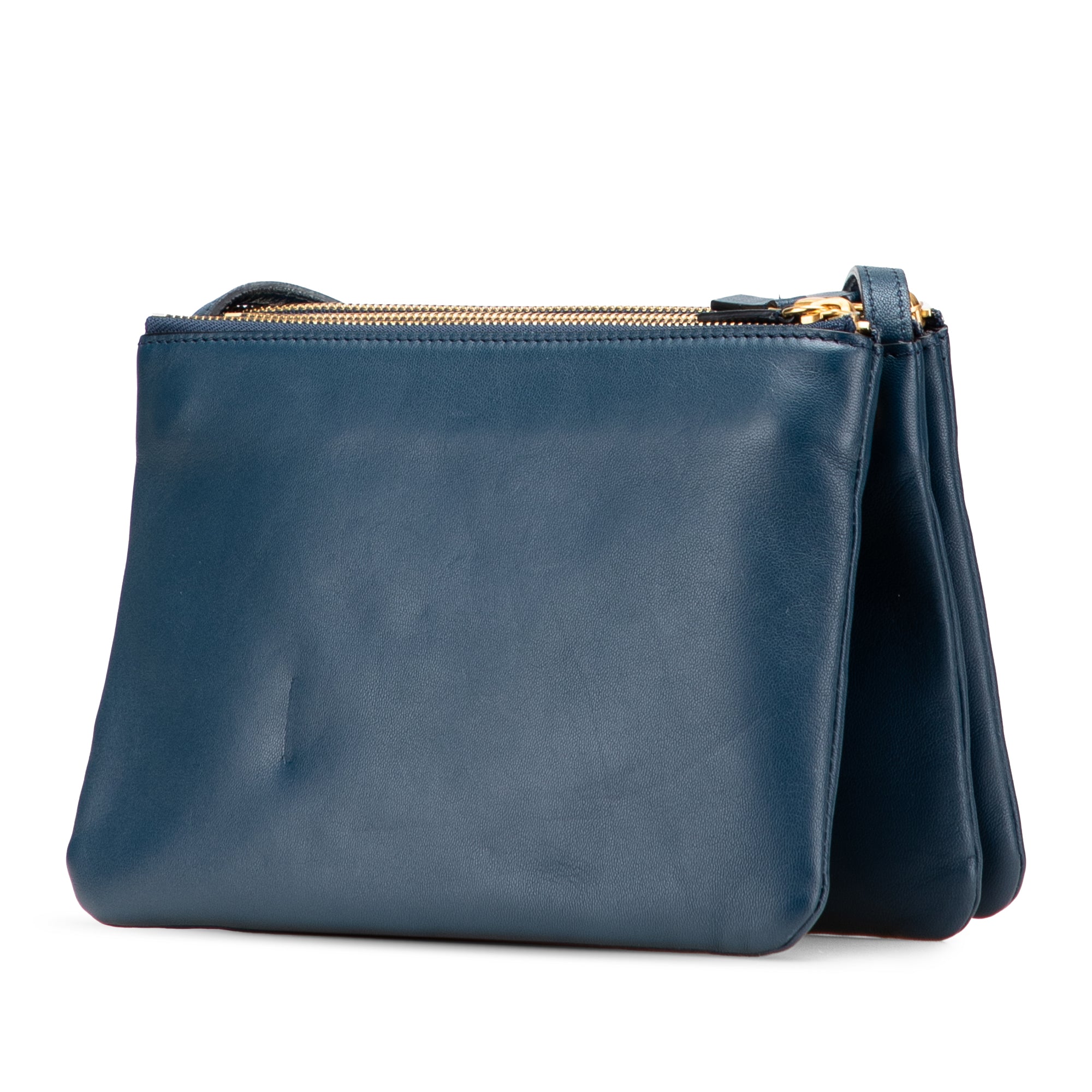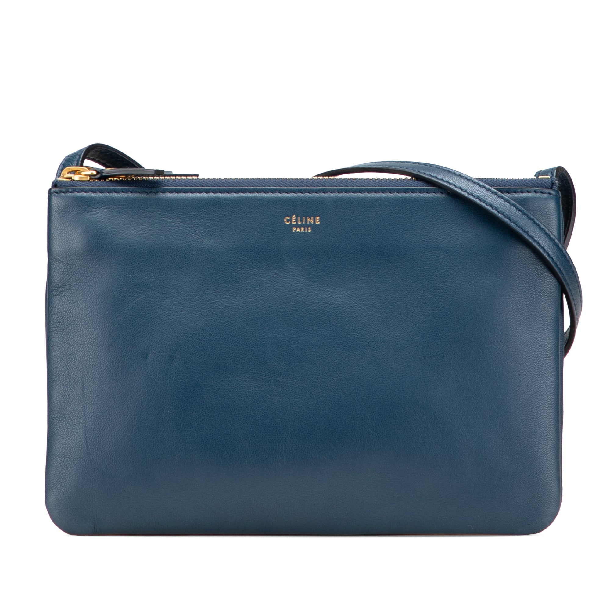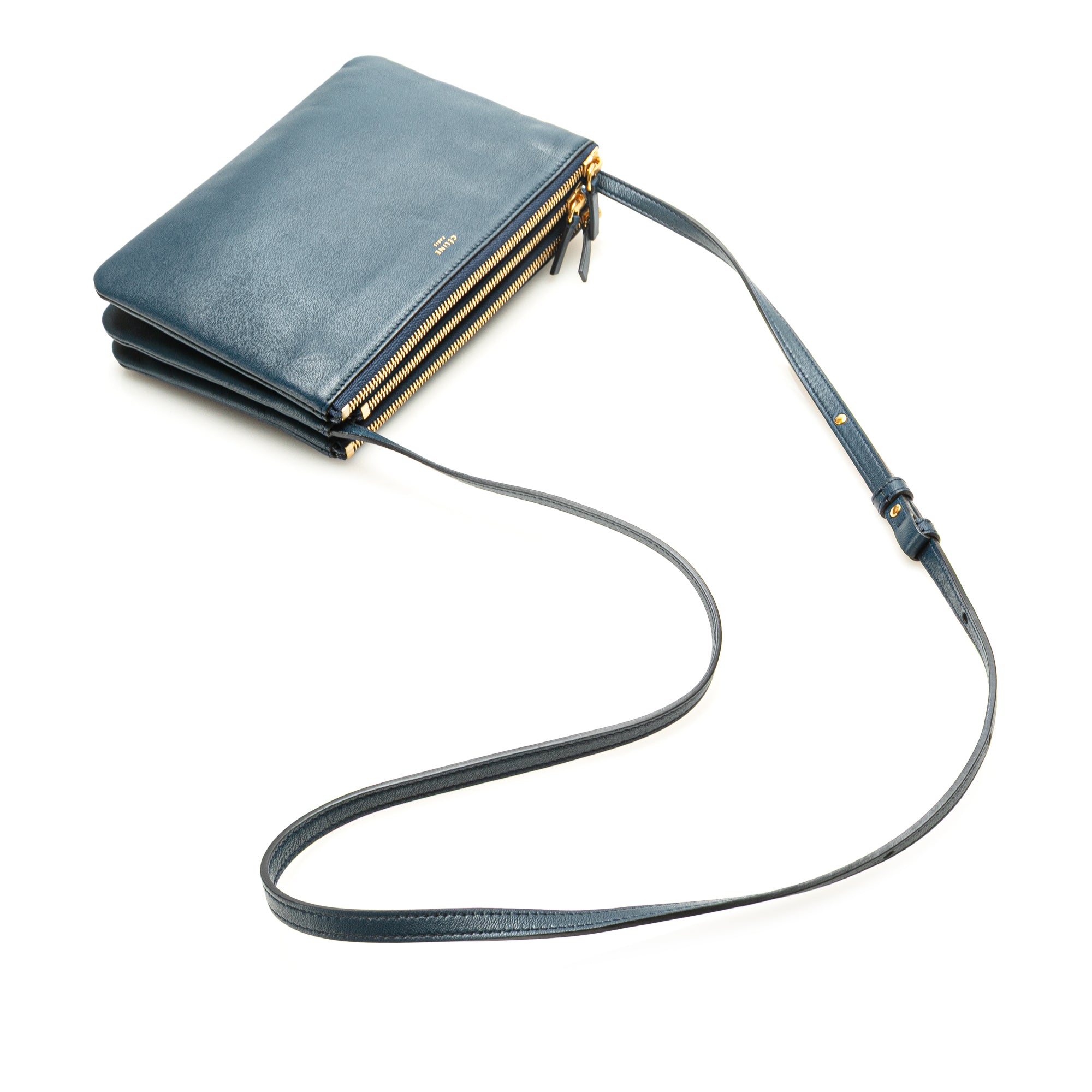 The Trio crossbody bag features a leather body, a flat strap, and three top zip closures. Retail Price: 1250.00