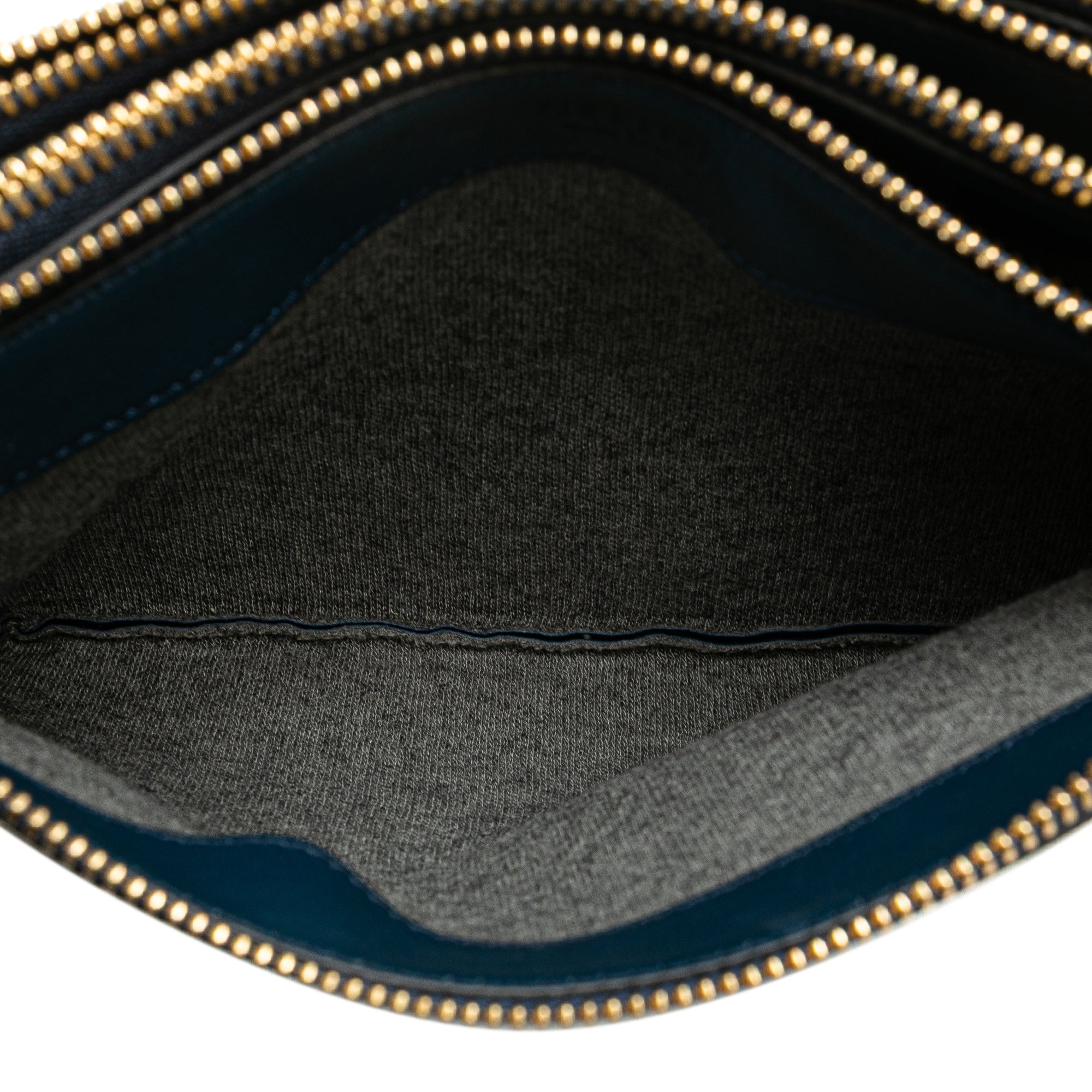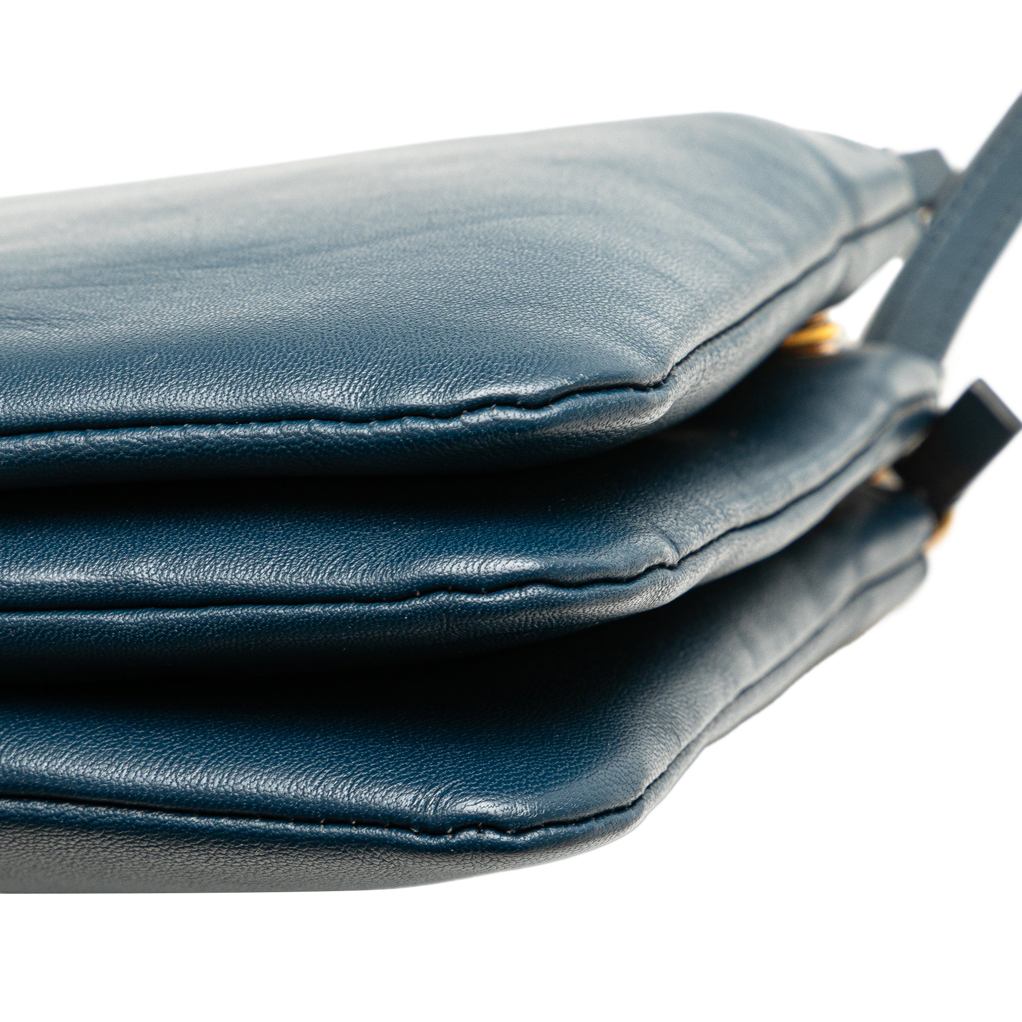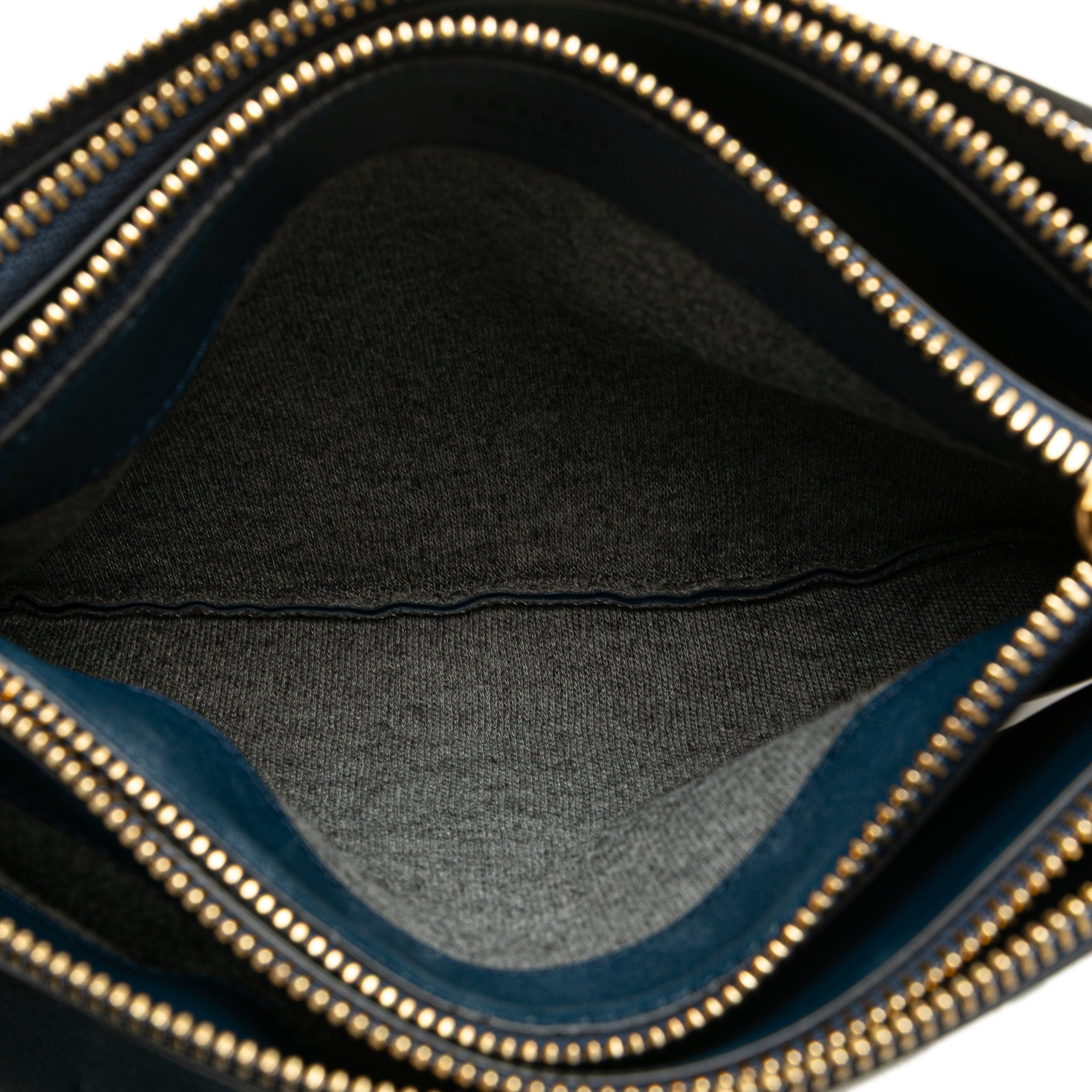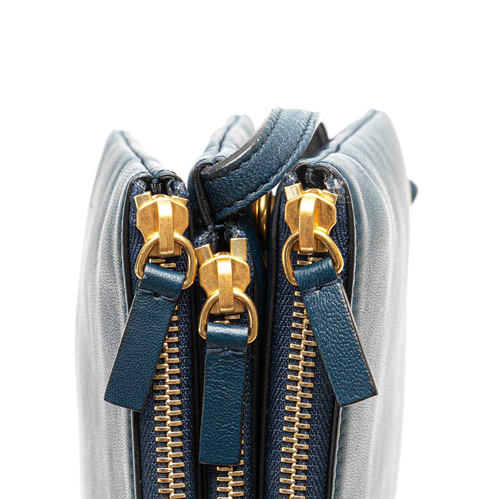 The Trio crossbody bag features a leather body, a flat strap, and three top zip closures. Retail Price: 1250.00