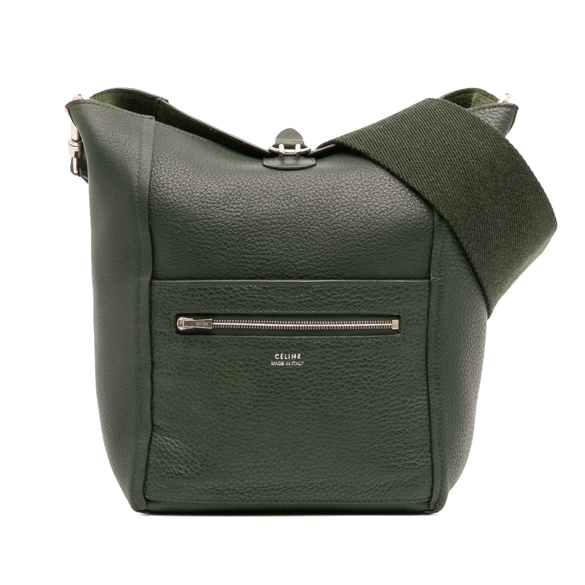 The Seau Sangle features a leather body, a detachable flat canvas strap, an open top with hook closure, and exterior zip and slip pockets. Retail Price: 2100.00