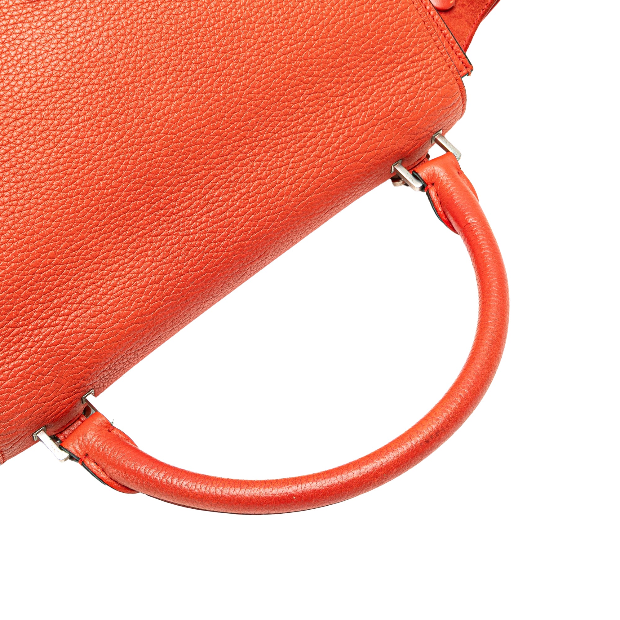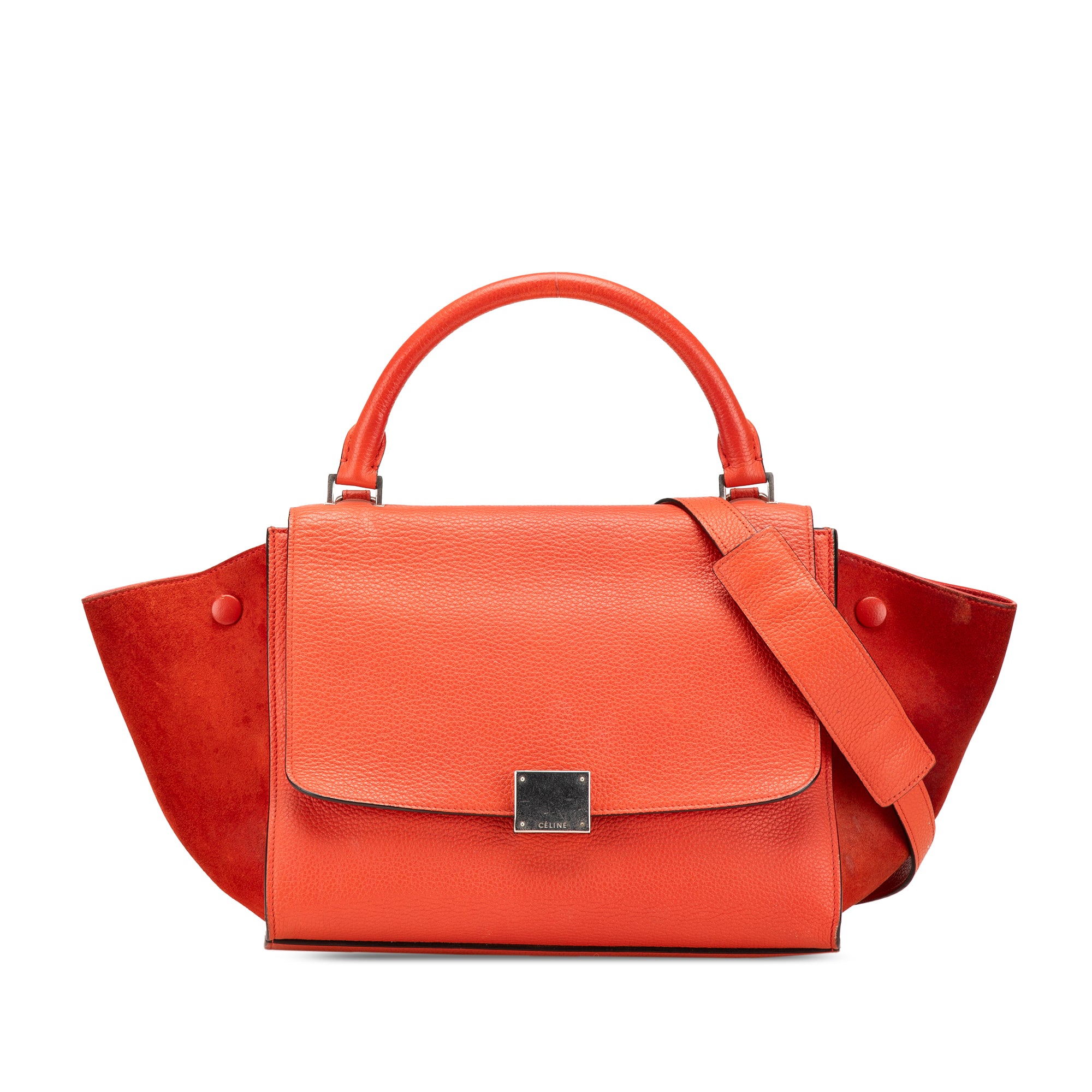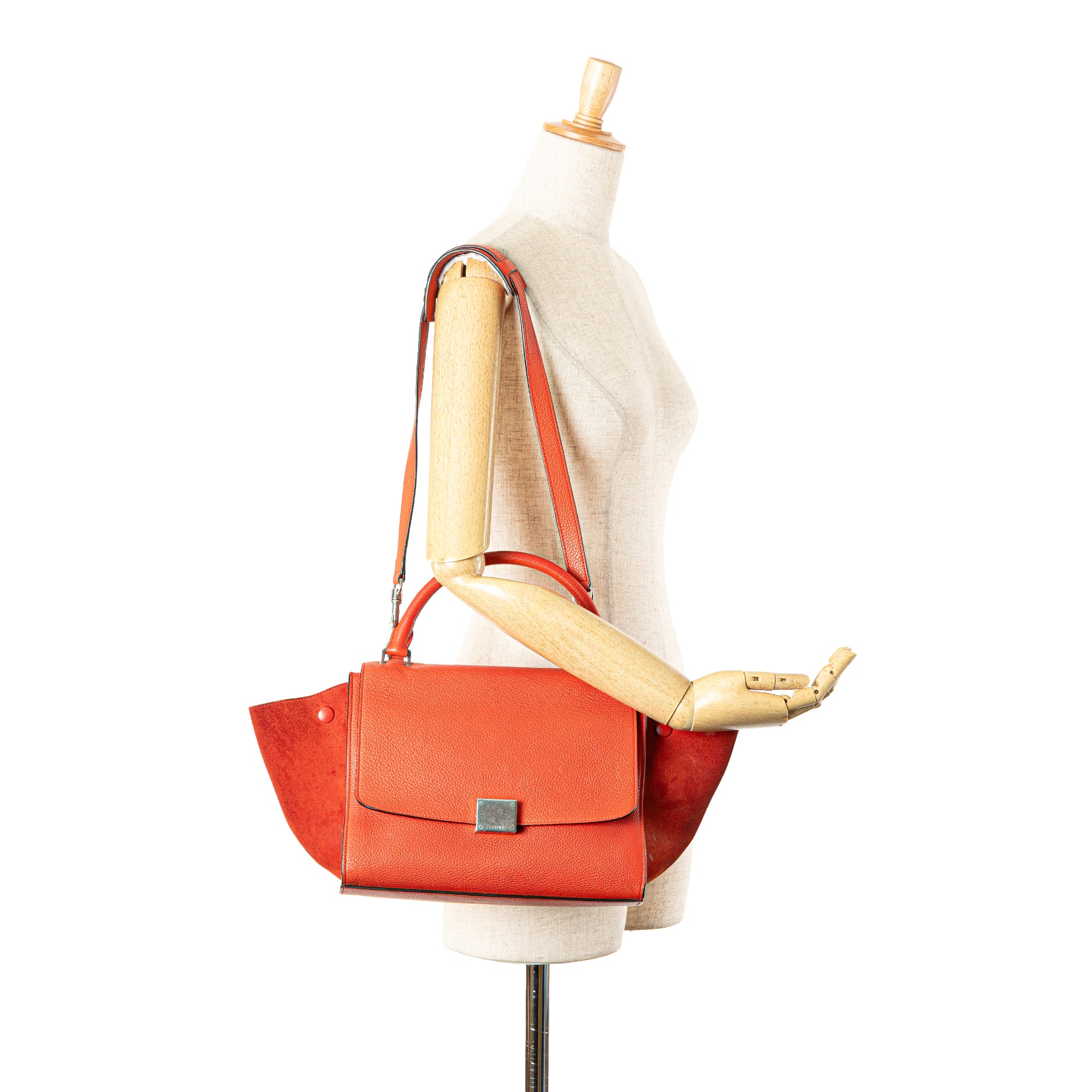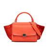 The Trapeze features a leather body with suede side panels, a rolled leather top handle, a detachable flat leather strap, a front flap with a clasp closure, a top zip closure, an exterior back zip pocket, and interior slip pockets. Retail Price: 2950.00