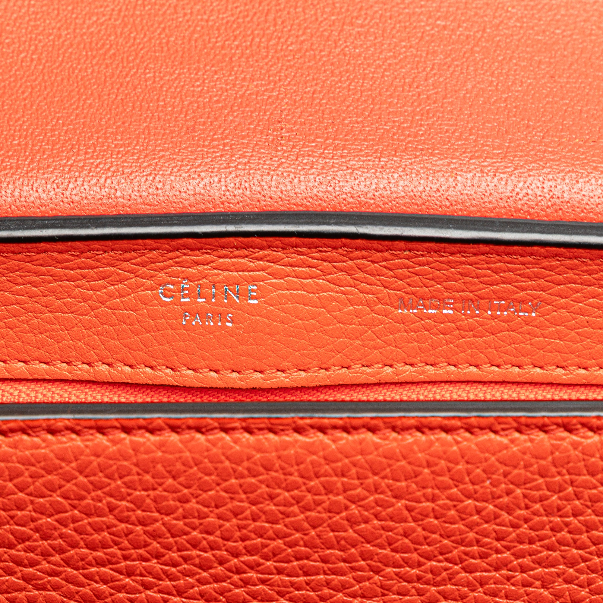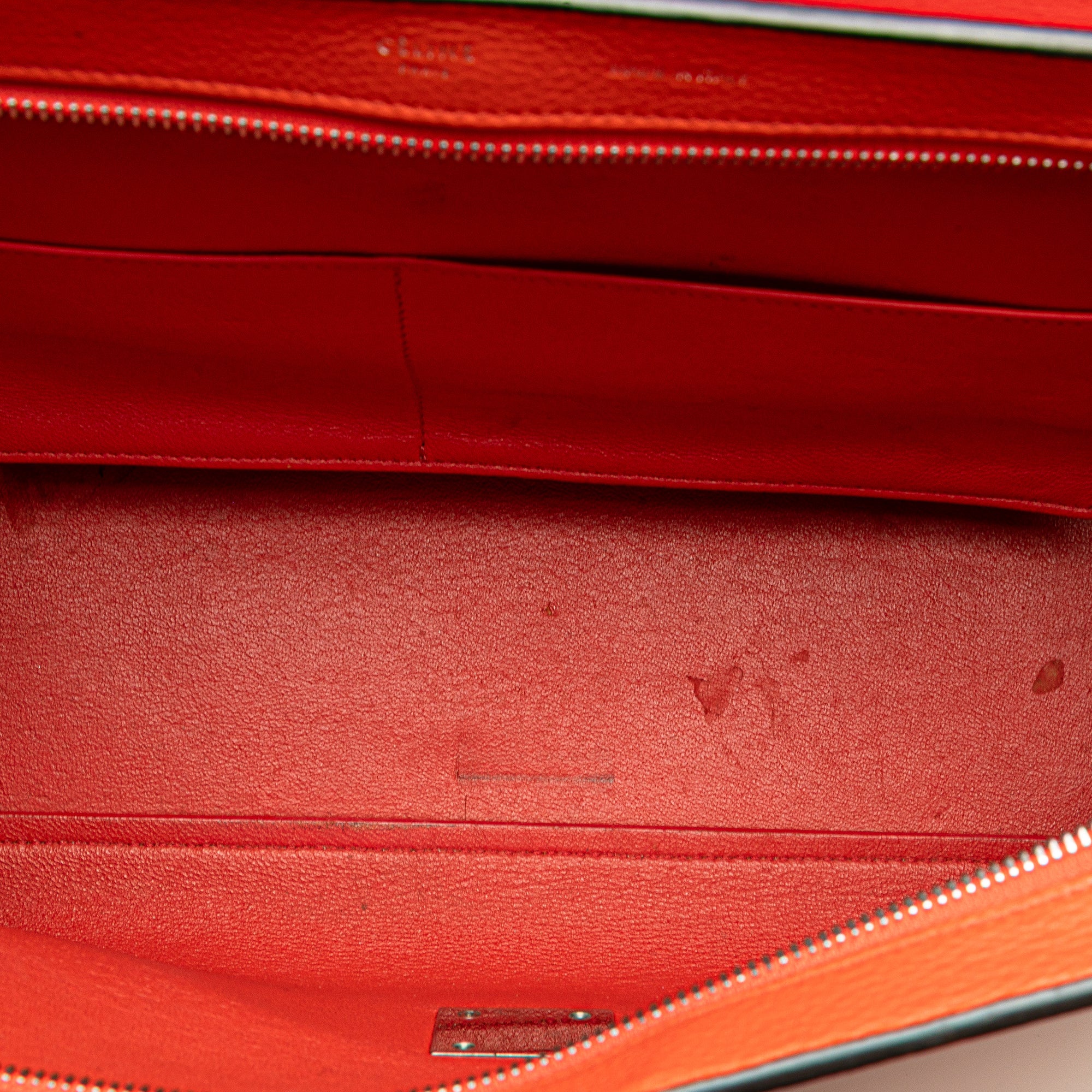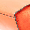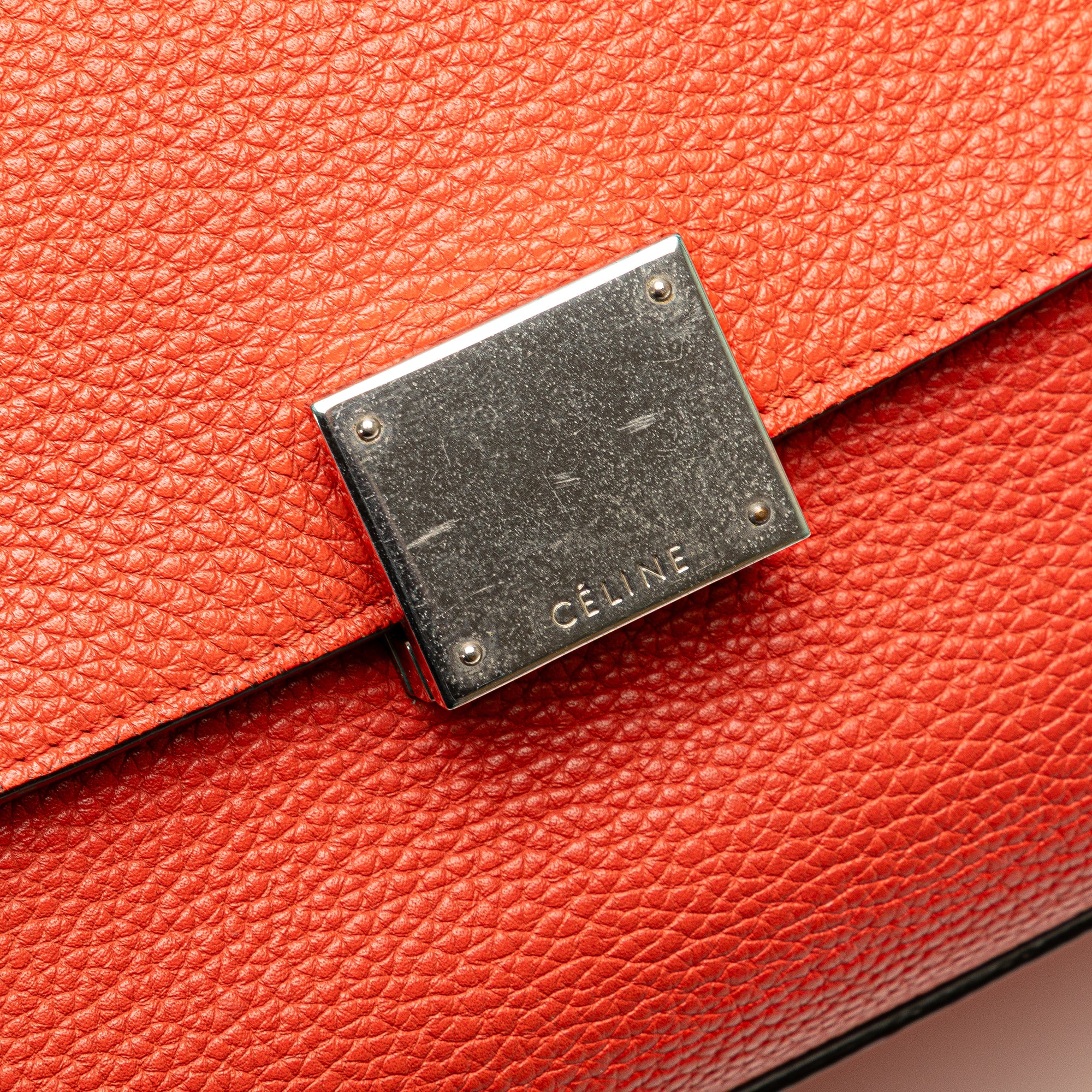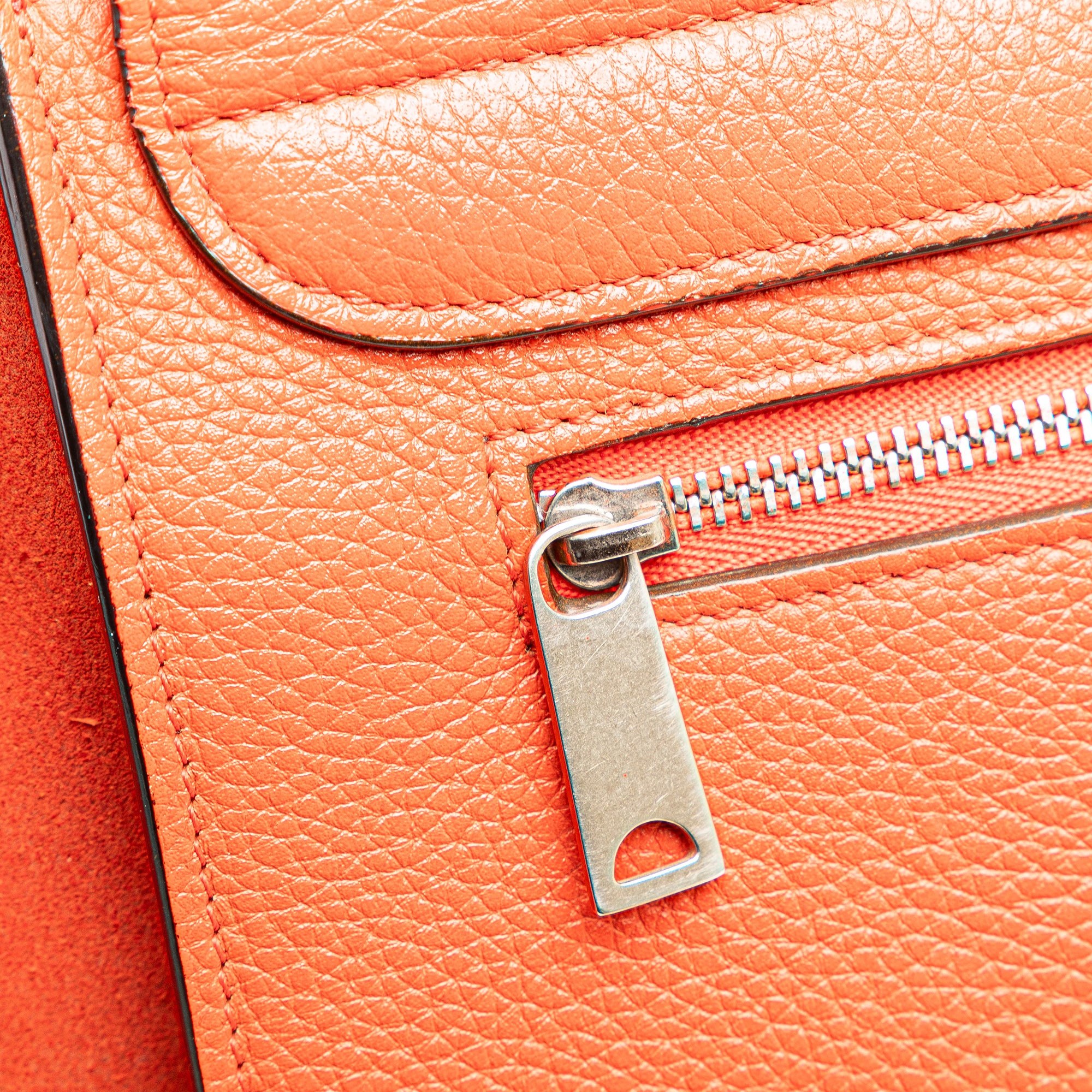 The Trapeze features a leather body with suede side panels, a rolled leather top handle, a detachable flat leather strap, a front flap with a clasp closure, a top zip closure, an exterior back zip pocket, and interior slip pockets. Retail Price: 2950.00