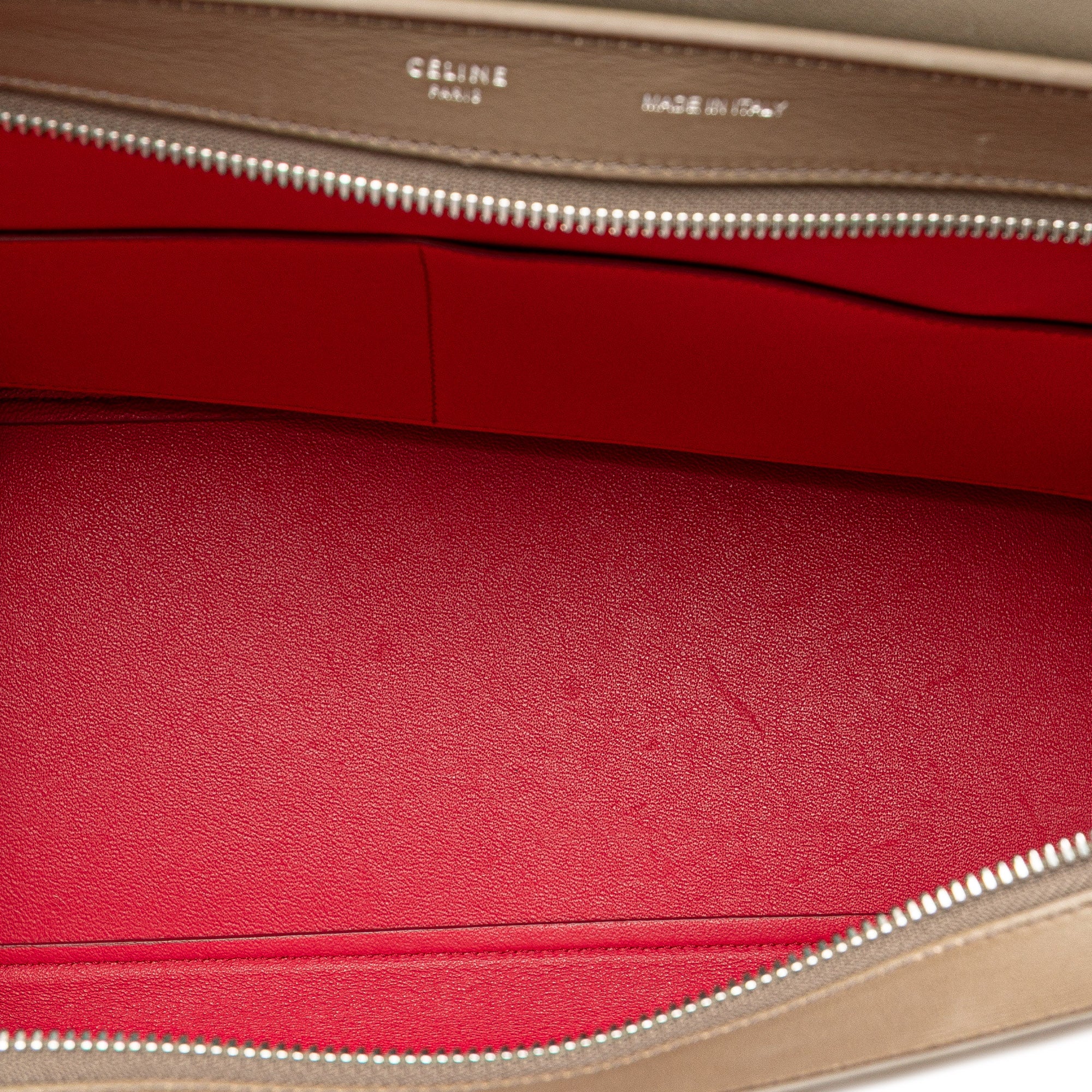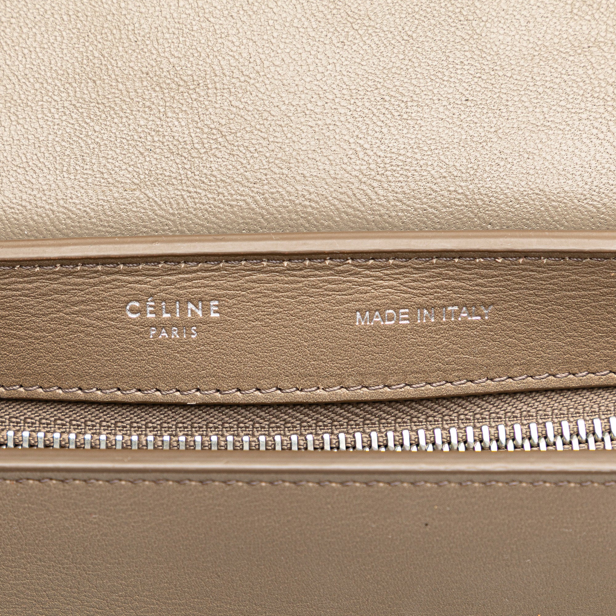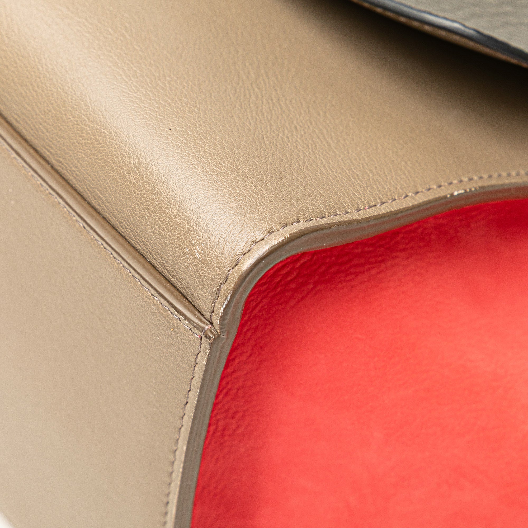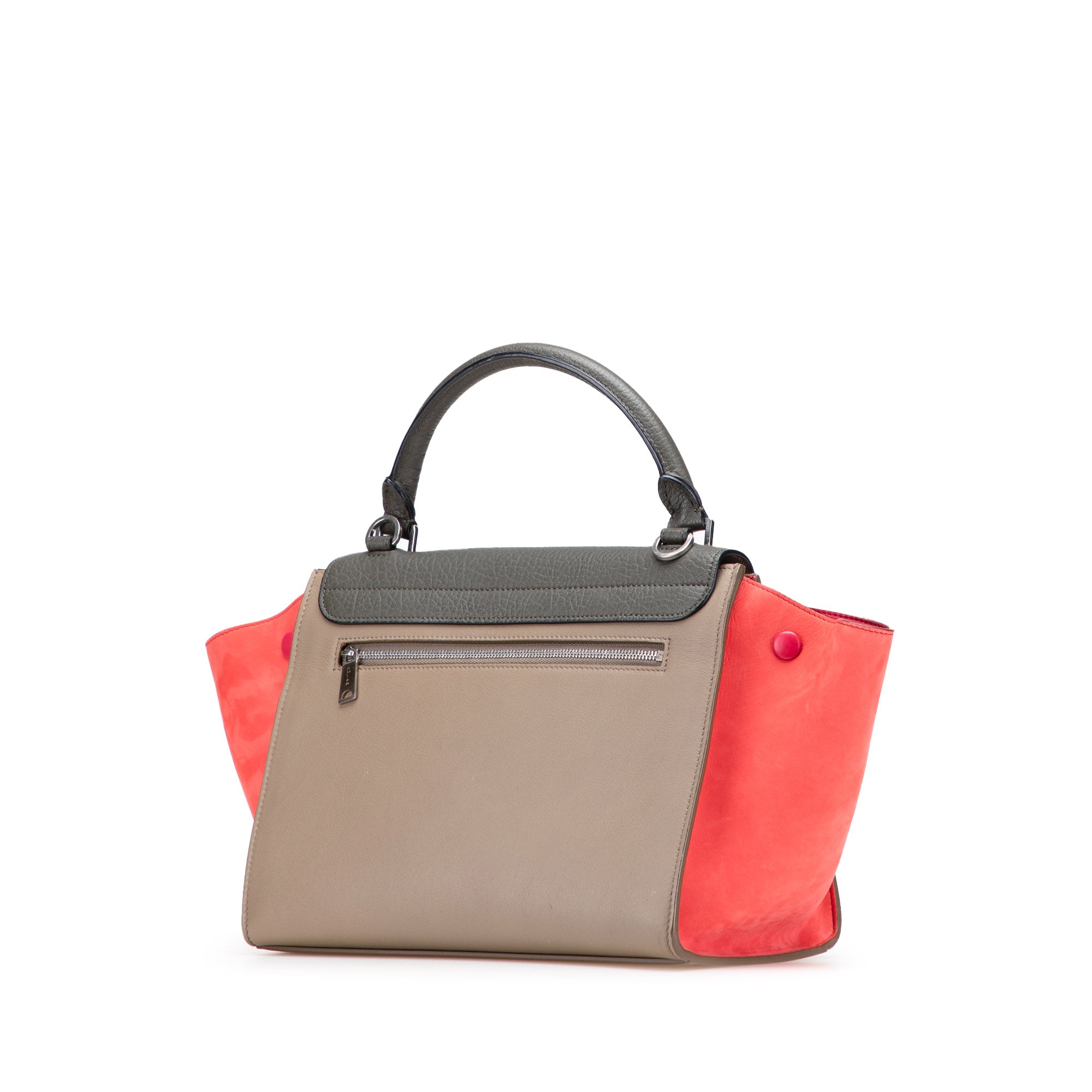 The Trapeze features a leather body with suede side panels, a rolled leather top handle, a detachable flat leather strap, a front flap with a clasp closure, a top zip closure, an exterior back zip pocket, and interior slip pockets. Inclusion: Dust bag. Retail Price: 1690.00