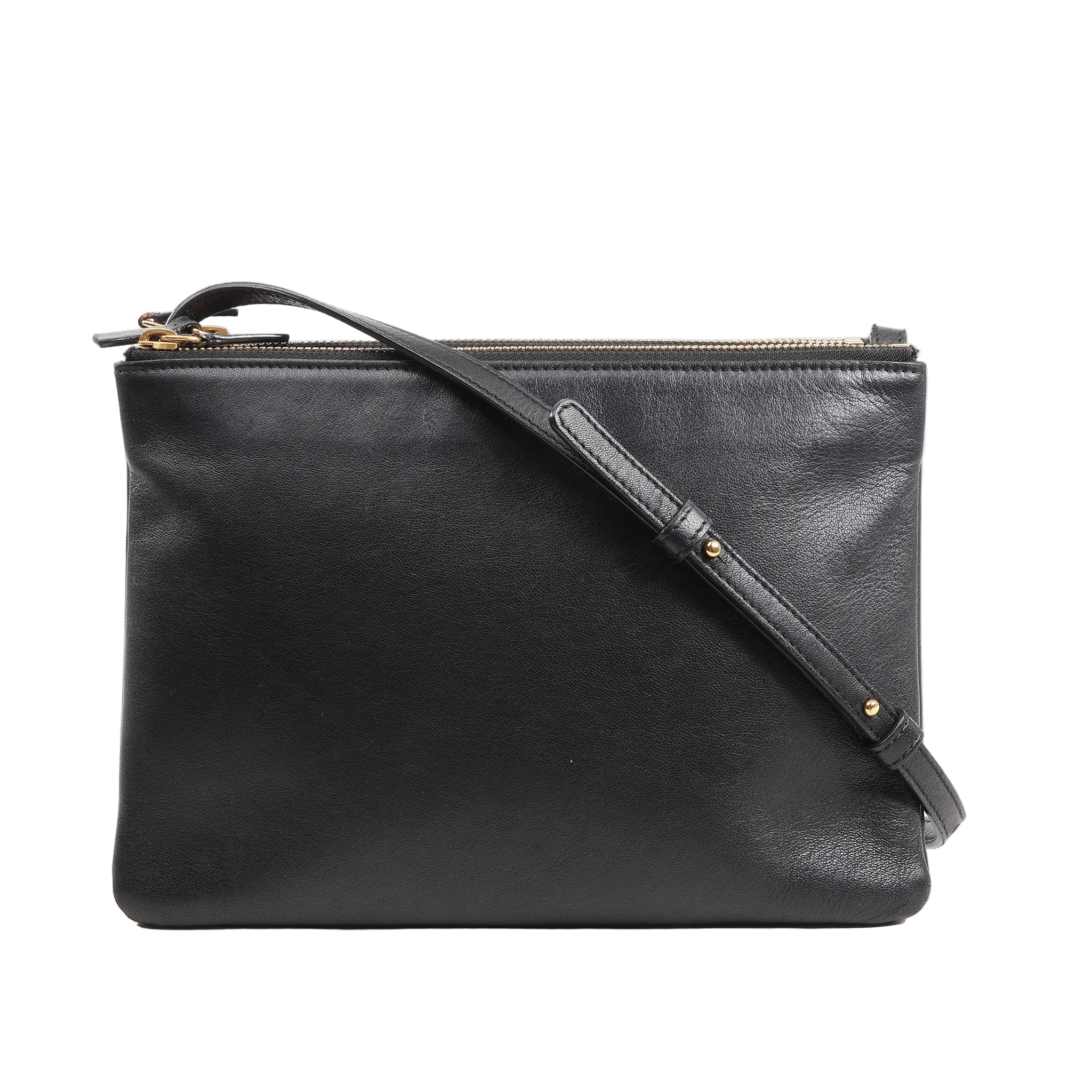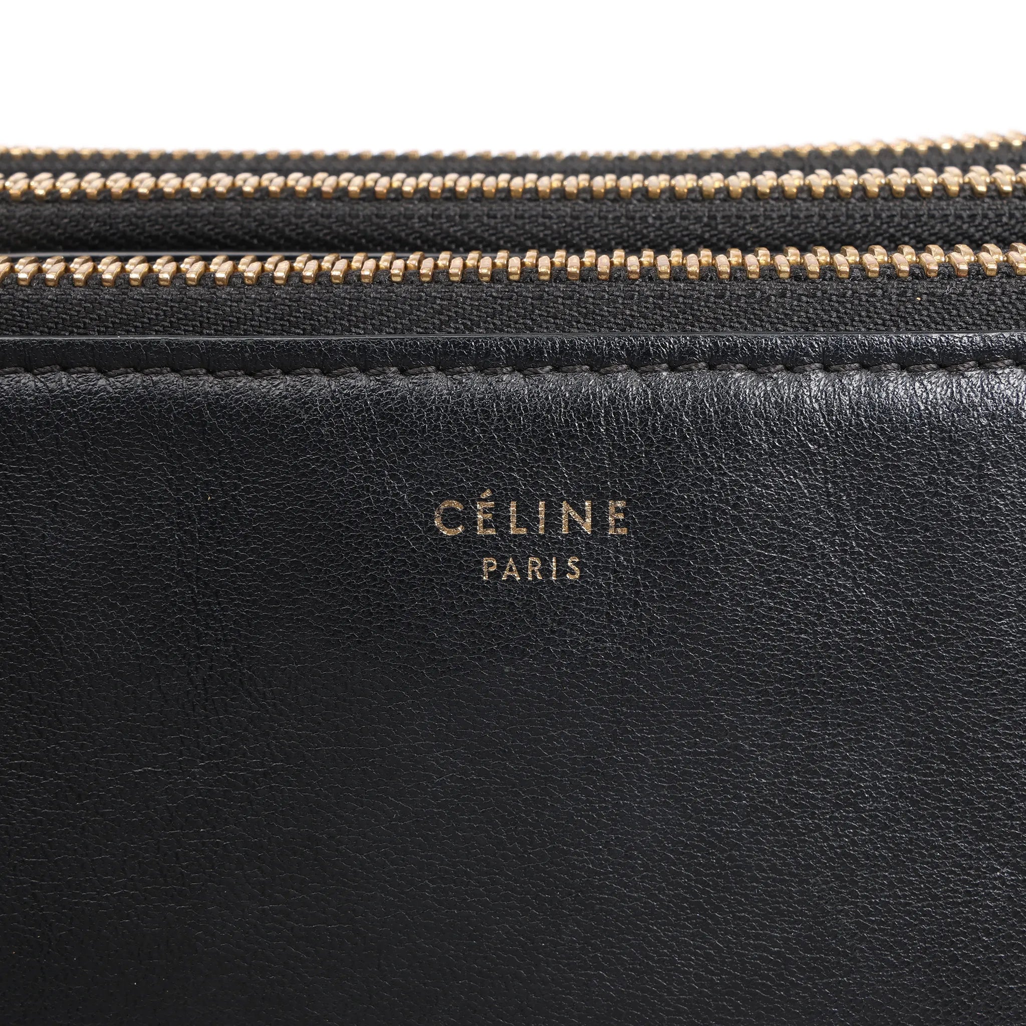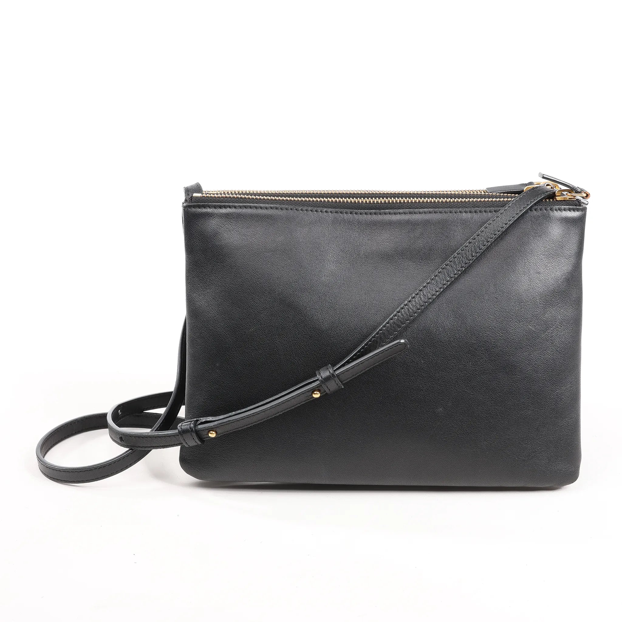 The Celine Trio Large Crossbody Bag in black leather offers minimalist sophistication with everyday practicality. Featuring three zip compartments and an adjustable strap, this sleek French-made piece is a go-to for modern elegance.