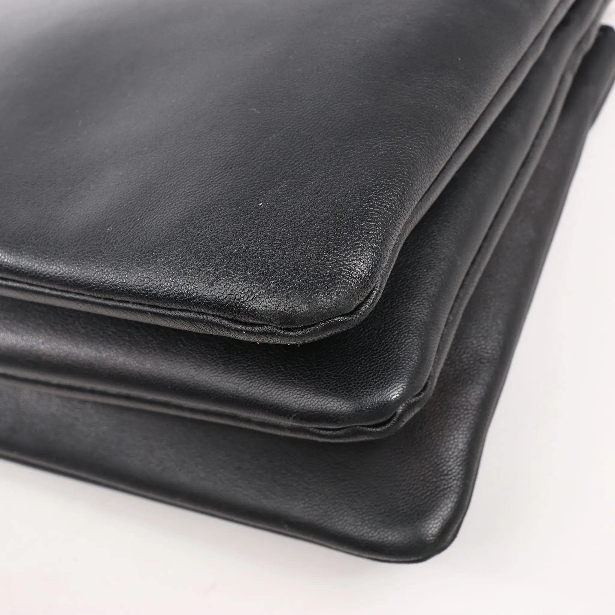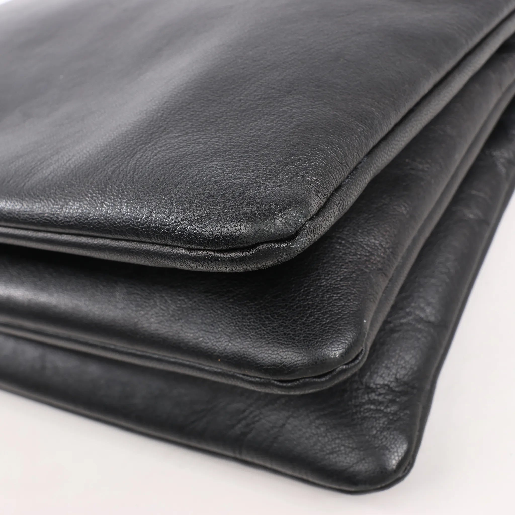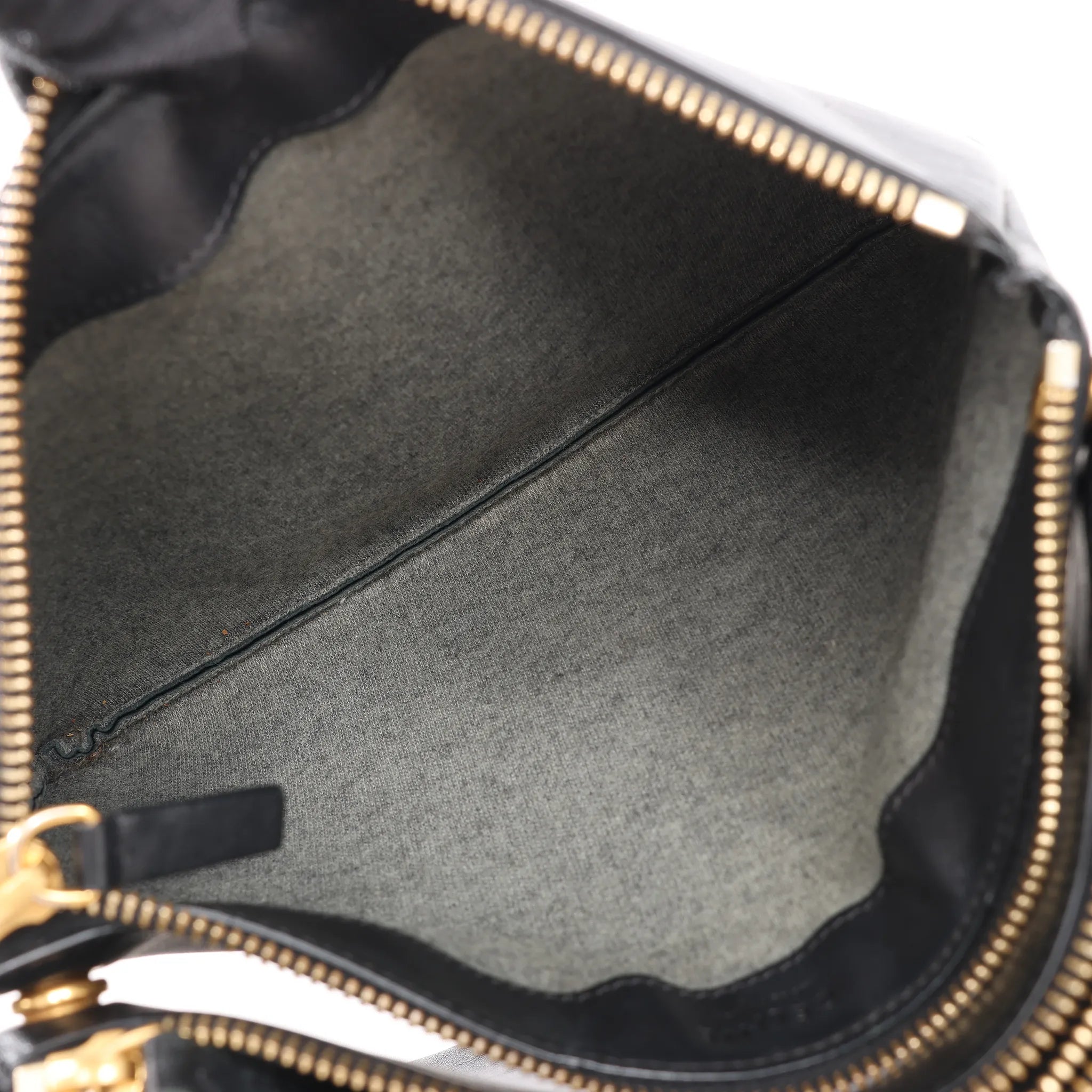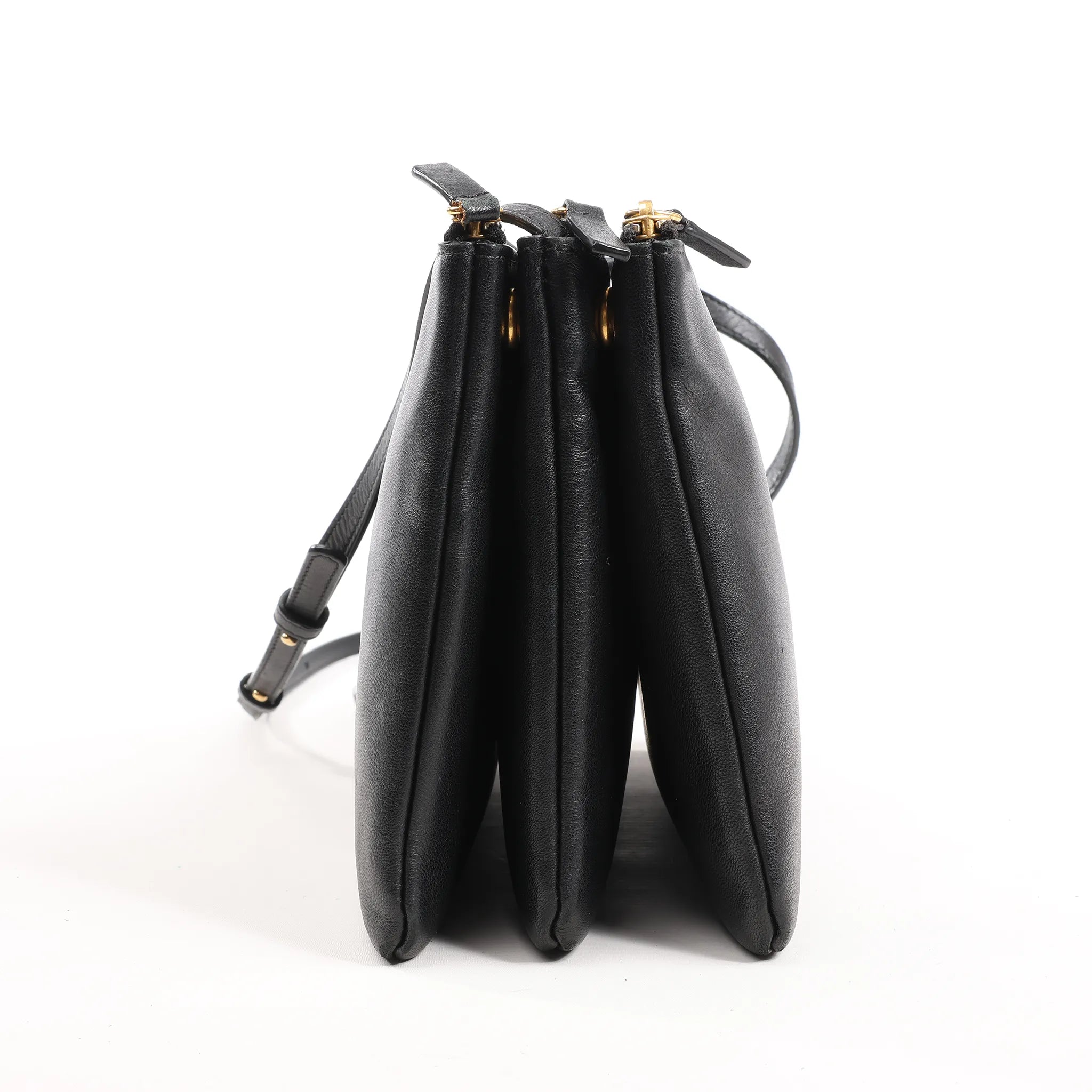 The Celine Trio Large Crossbody Bag in black leather offers minimalist sophistication with everyday practicality. Featuring three zip compartments and an adjustable strap, this sleek French-made piece is a go-to for modern elegance.