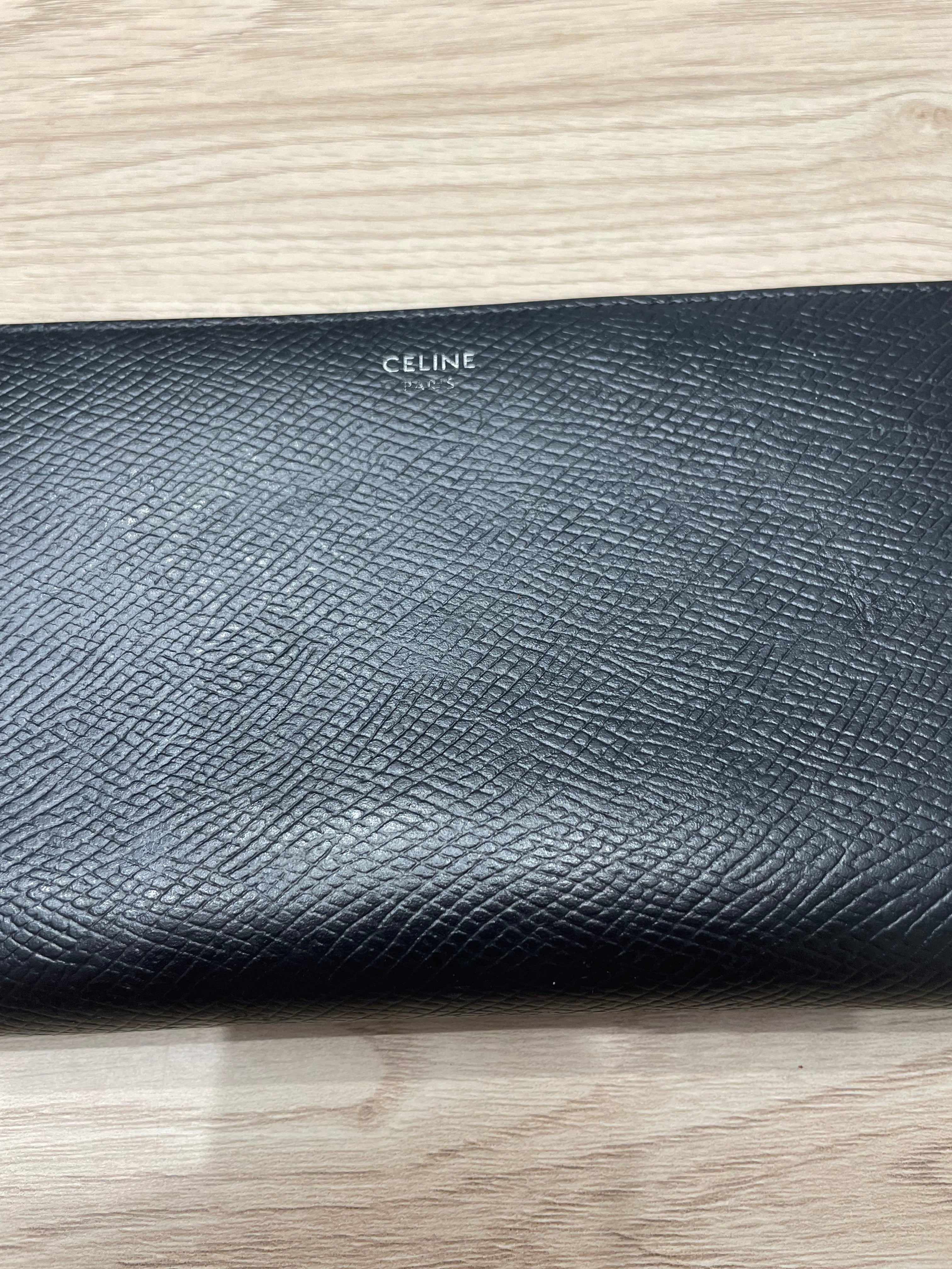 Céline black grained leather wallet. 19 X 10 X 2 CM (7 X 4 X 1 IN). IN VEAL. CALF LINING. SILVER FINISH. ZIPPER CLOSURE. TWO GUESSED COMPARTMENTS. TWELVE CREDIT CARD SLOTS. A ZIPPED POCKET. TWO FLAT POCKETS. Signed Céline Paris on the front (the Paris is slightly erased). very good general condition. With dustbag. shop value 570€