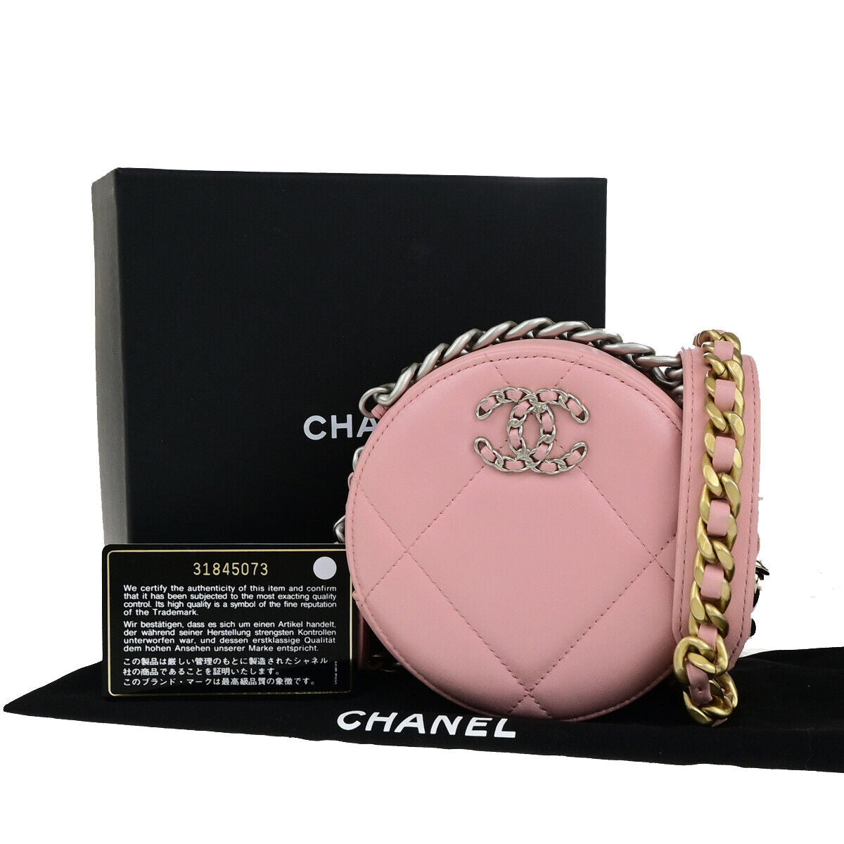 Brand : Chanel Model : 19 Round Clutch with Chain Style : Quilted Leather Serial number : 31845073 Inclusions : Dust bag,Box,Authenticity Seal,Authenticity Card