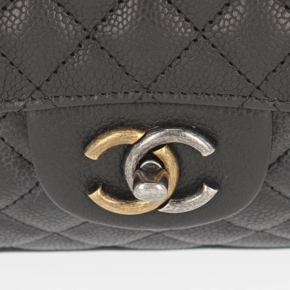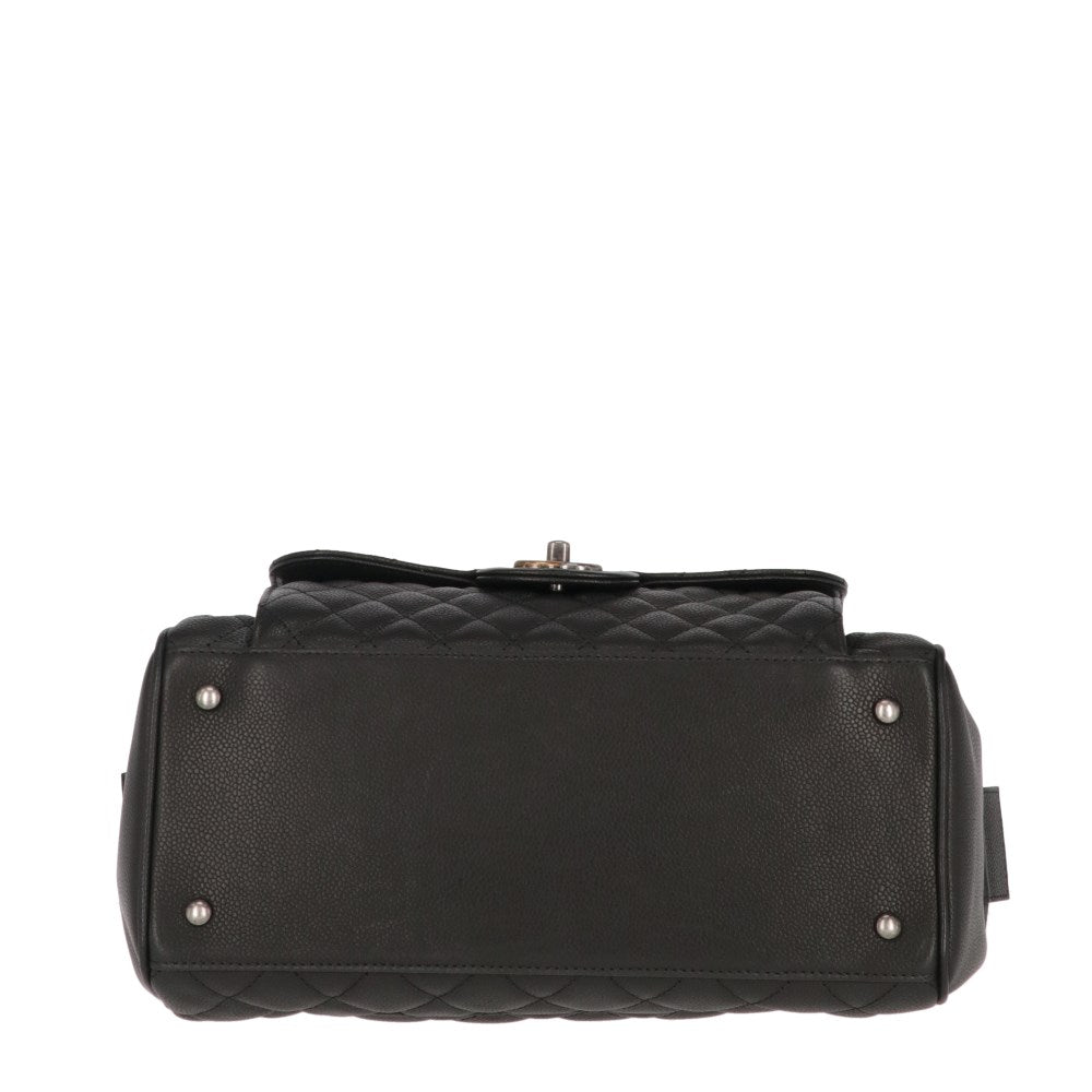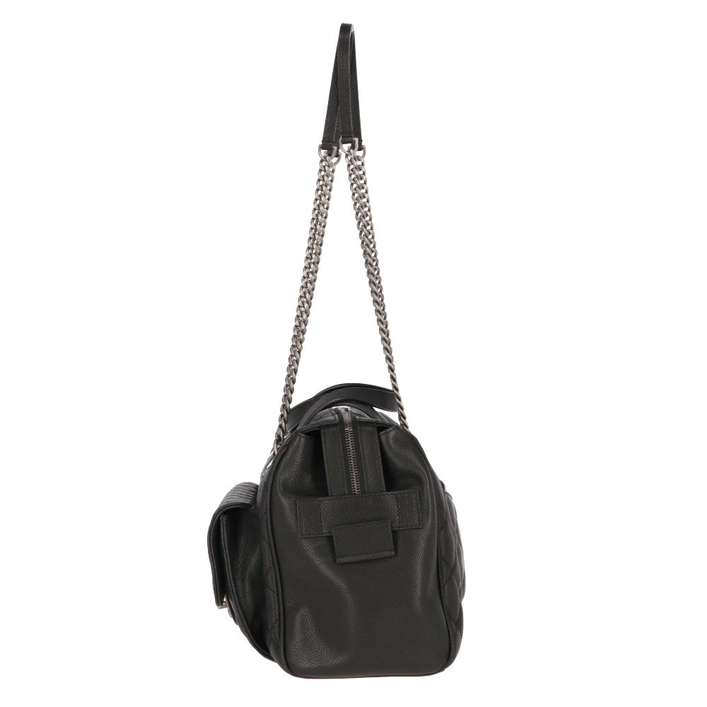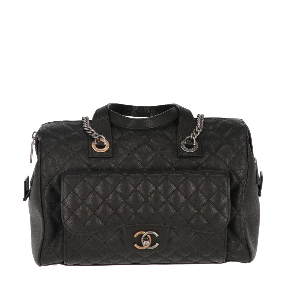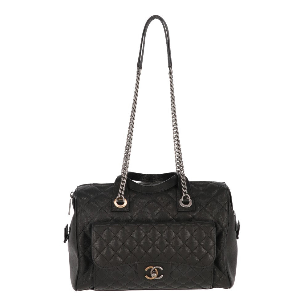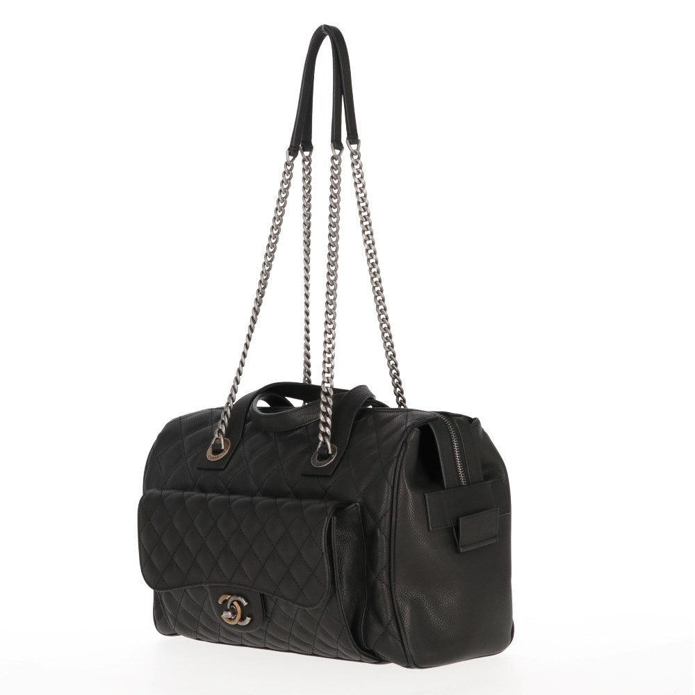 Chanel black matelassé pebbled leather 2010s shoulder bag. Trunk desing with double silver-tone metal chain shoulder straps and two leather handles, upper zip closure, one external patch pockets and one bellows pocket with flap and two-tone double C lock. Metal feet. - Year: 2017 - Serial number: 23340522