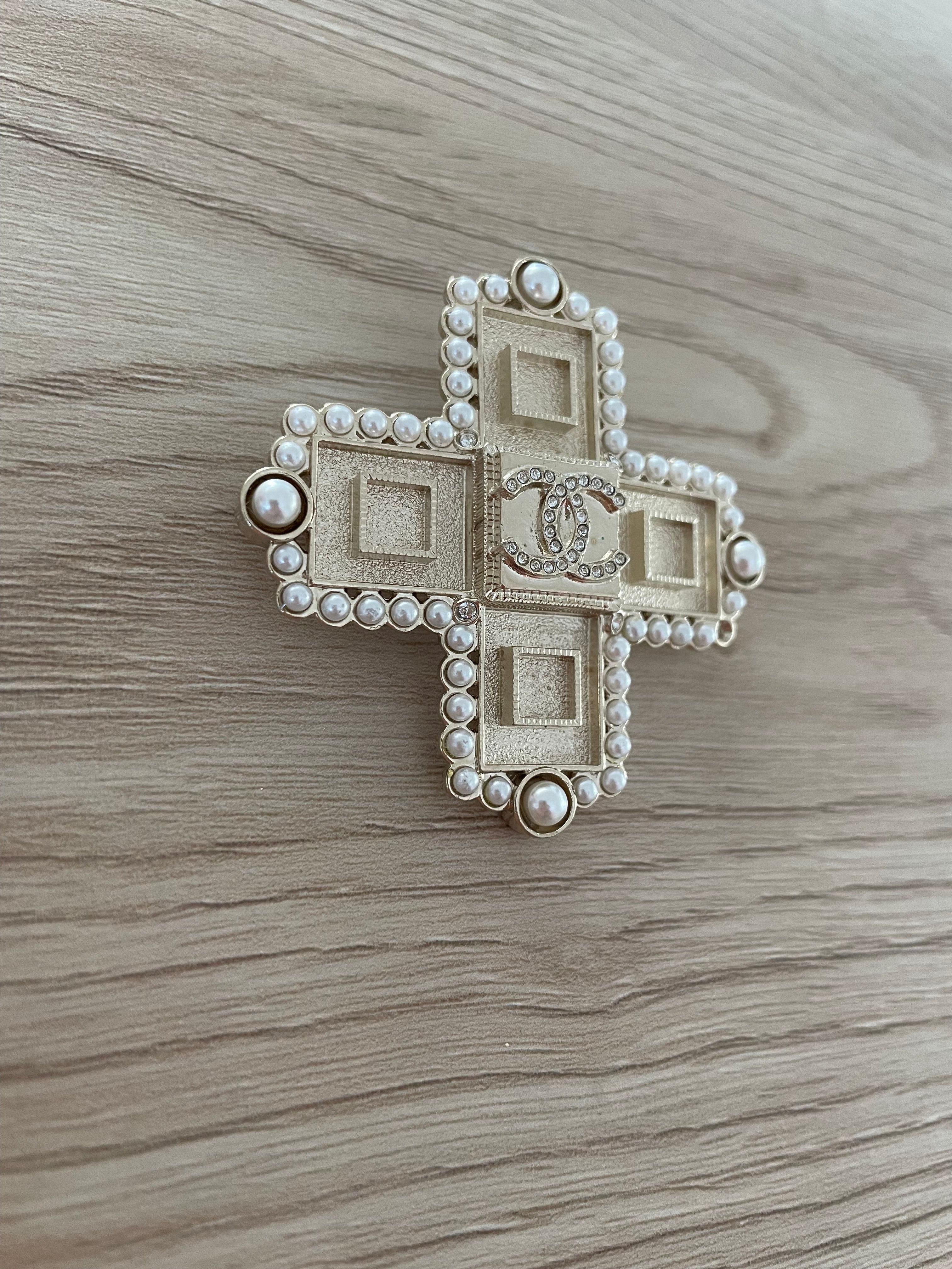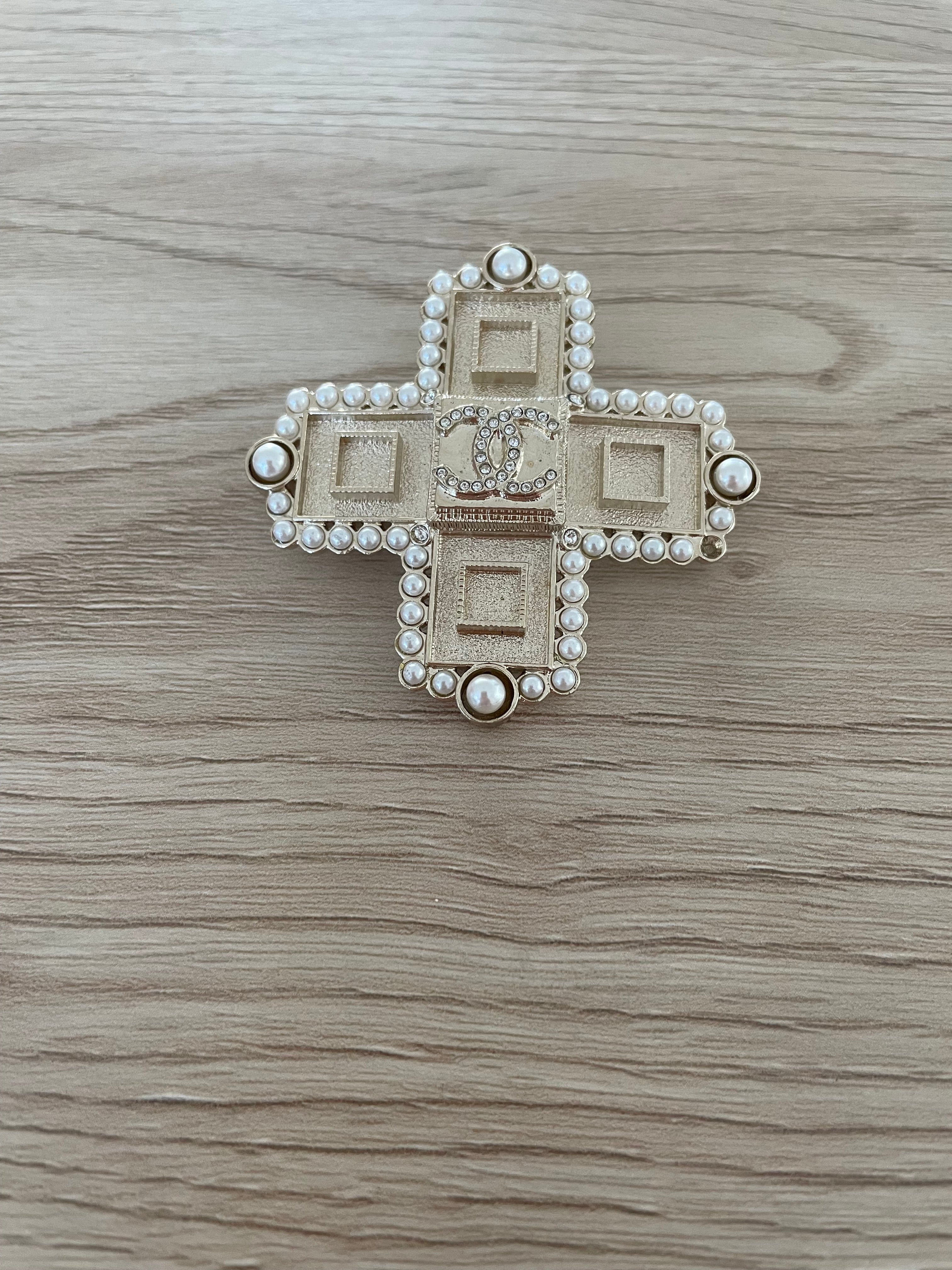 Chanel cross-shaped brooch. Champagne gold metal. Fancy beaded outlines. Rhinestone CV in the center. Hallmark present on the back. Sold in a neutral box. Very good condition