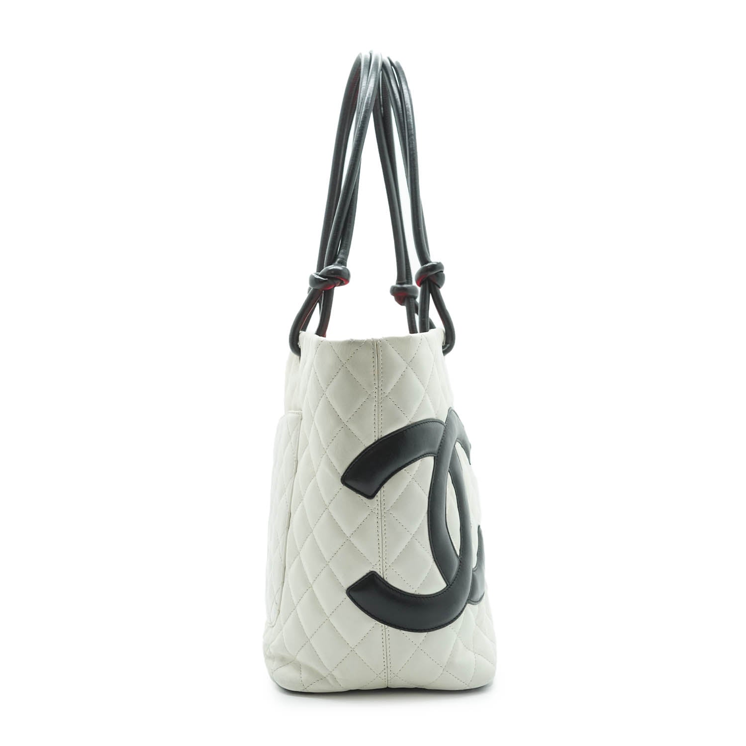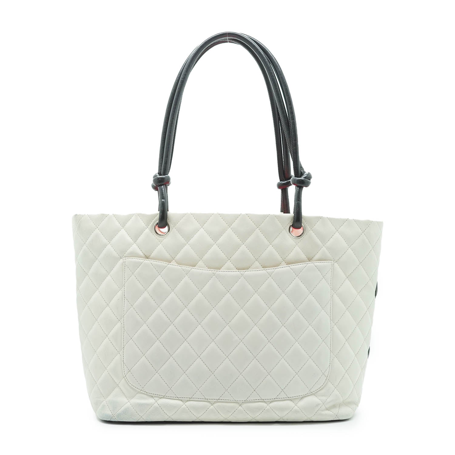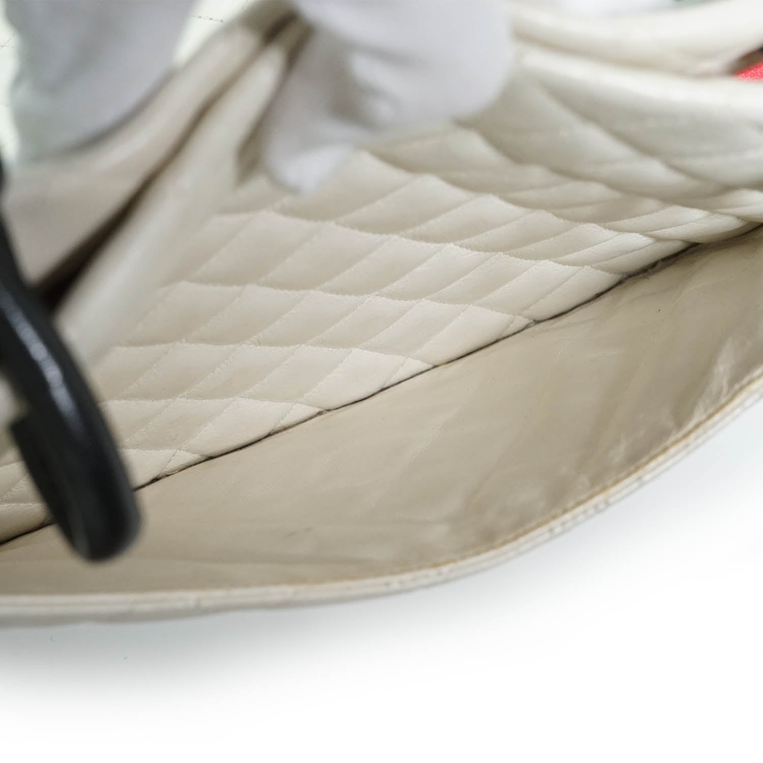 Cambon Lambskin Matelasse Large Tote White LeatherDepth: 14.5cmHeight: 25cmWidth: 29.5cmWidth at Top: 40cmHand Drop: 21.5cmStain: Some stains on the inside fabric overall, slight stains on the front sideDiscoloration: Some discoloration (blue marks) on the back side, minor hardware tarnishScratch: Slight scratches on the outsidePeeling: Overall leather cracking on the outsideTear: Small tear on one top cornerSerial code: 9024830