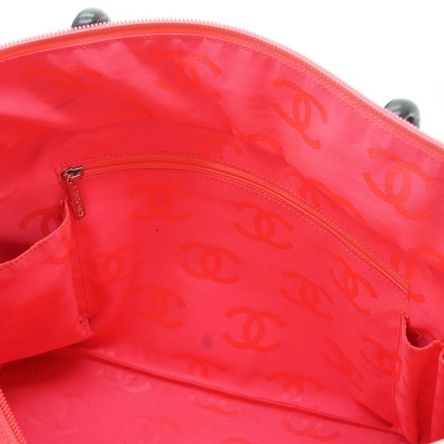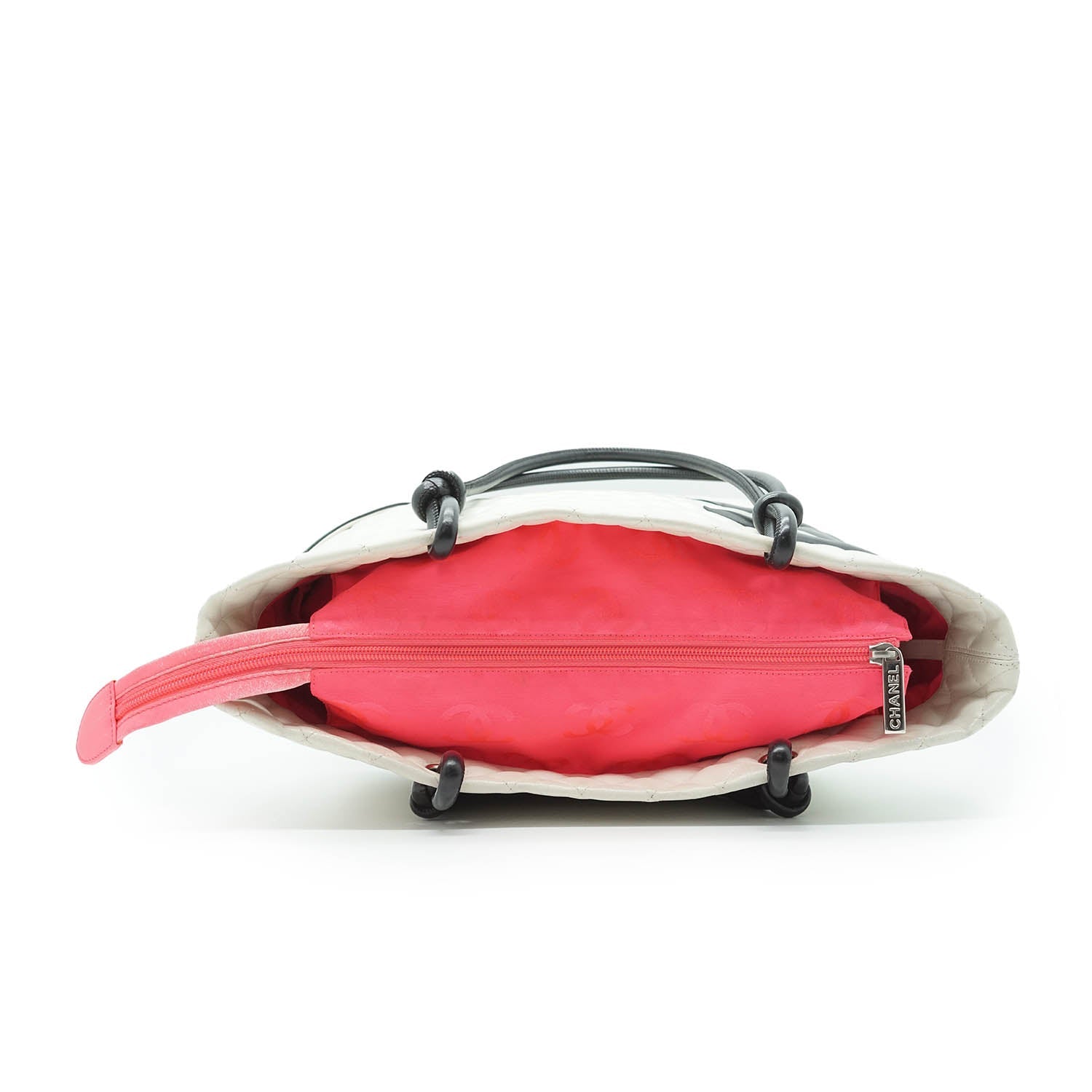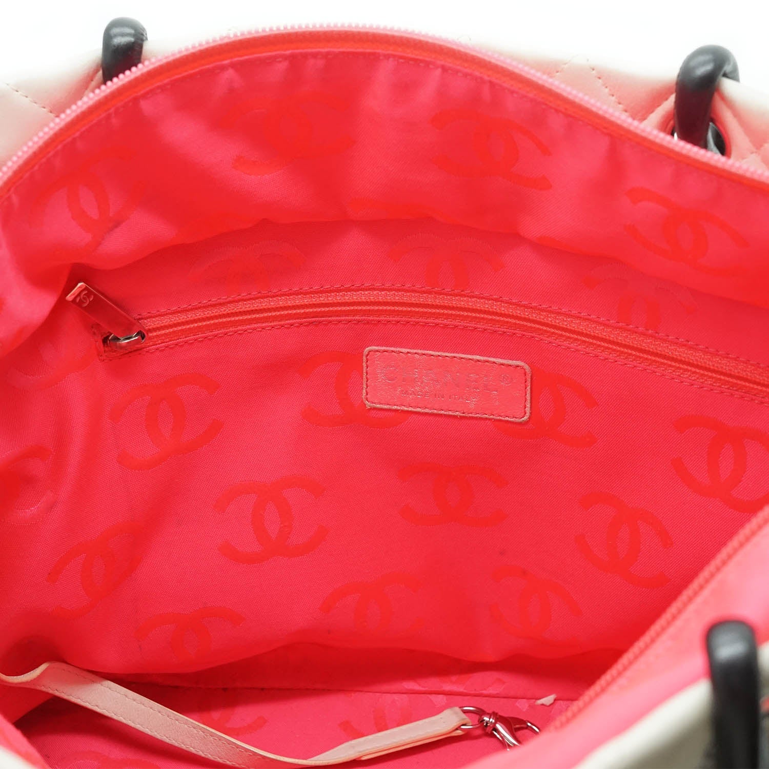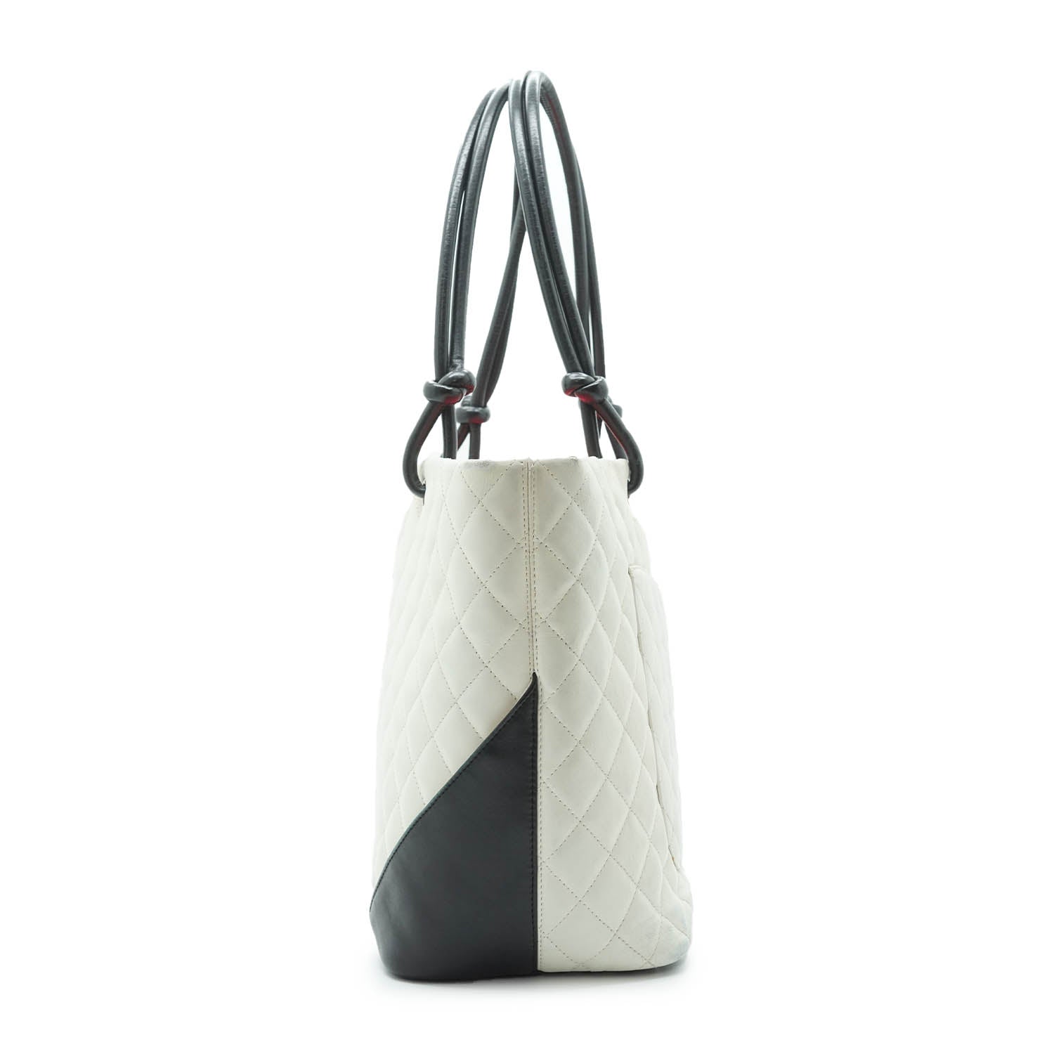 Cambon Lambskin Matelasse Large Tote White LeatherDepth: 14.5cmHeight: 25cmWidth: 29.5cmWidth at Top: 40cmHand Drop: 21.5cmStain: Some stains on the inside fabric overall, slight stains on the front sideDiscoloration: Some discoloration (blue marks) on the back side, minor hardware tarnishScratch: Slight scratches on the outsidePeeling: Overall leather cracking on the outsideTear: Small tear on one top cornerSerial code: 9024830