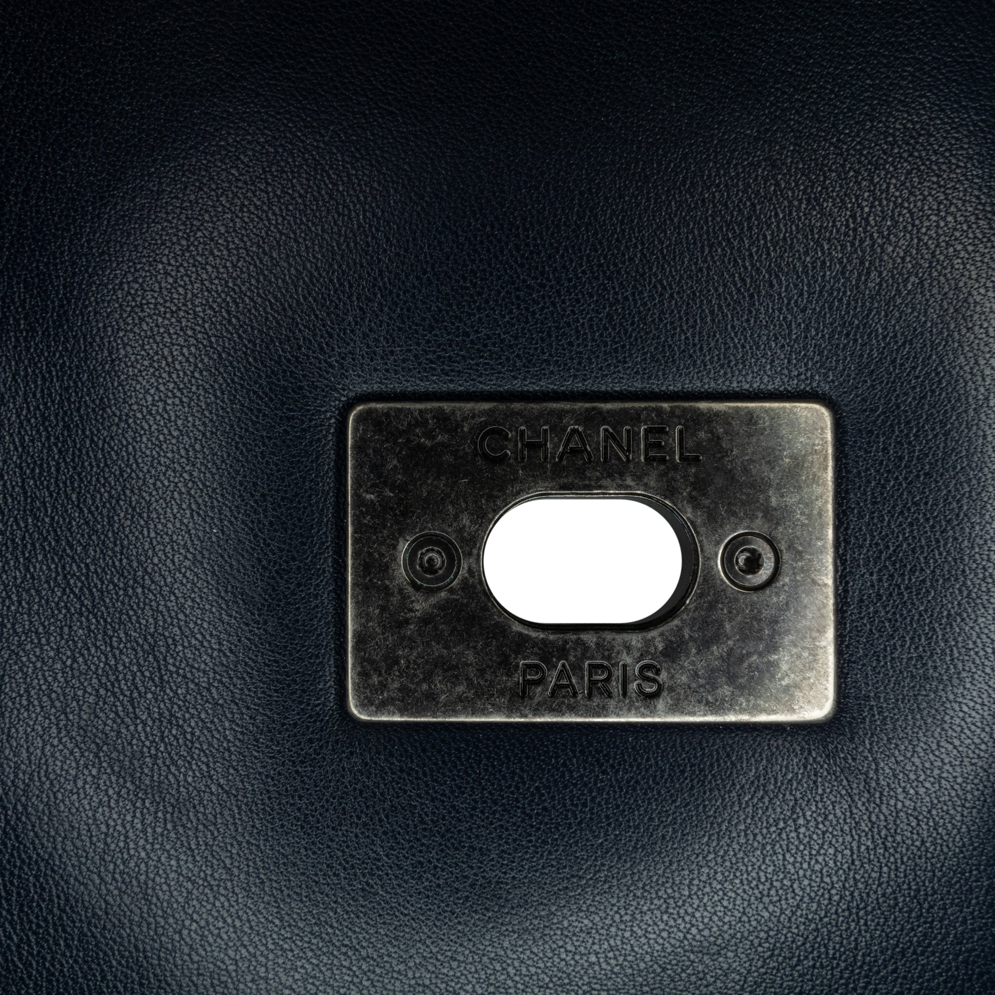 This shoulder bag features a canvas body, a leather woven chain link shoulder strap with leather guard, front flap and interlocking Cs with twist lock closure, and an interior zip pocket. Inclusion: authenticity card. Retail Price: 5500.00