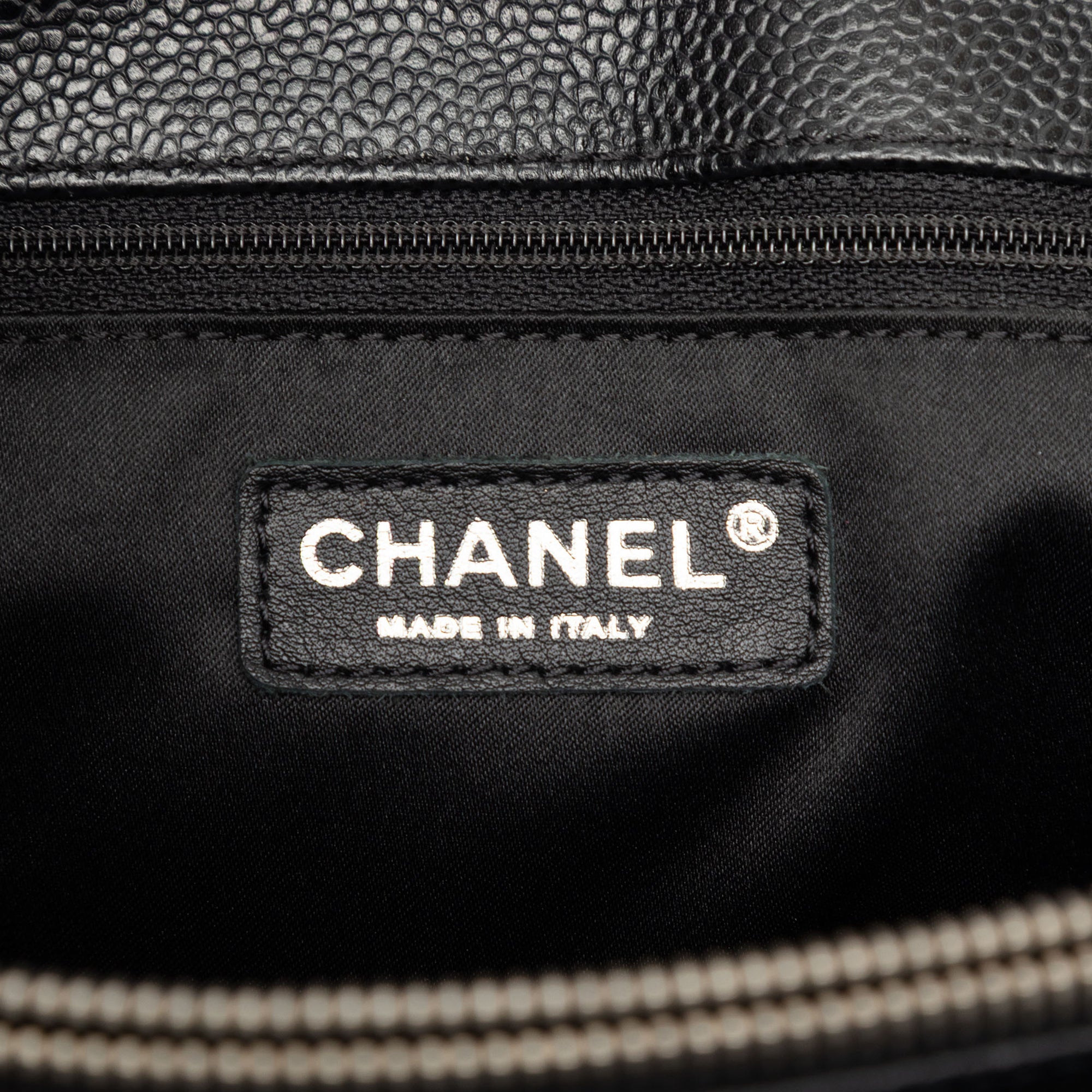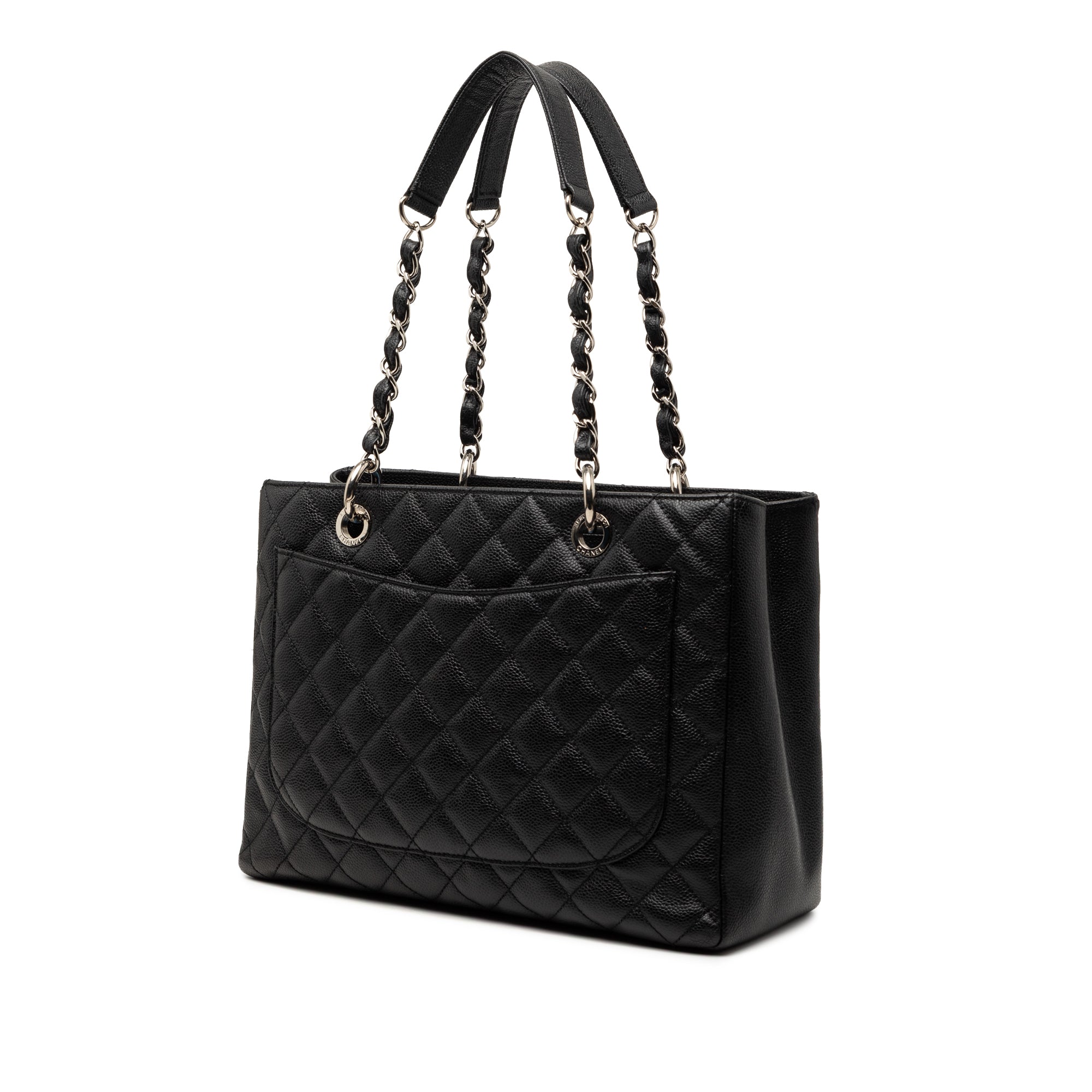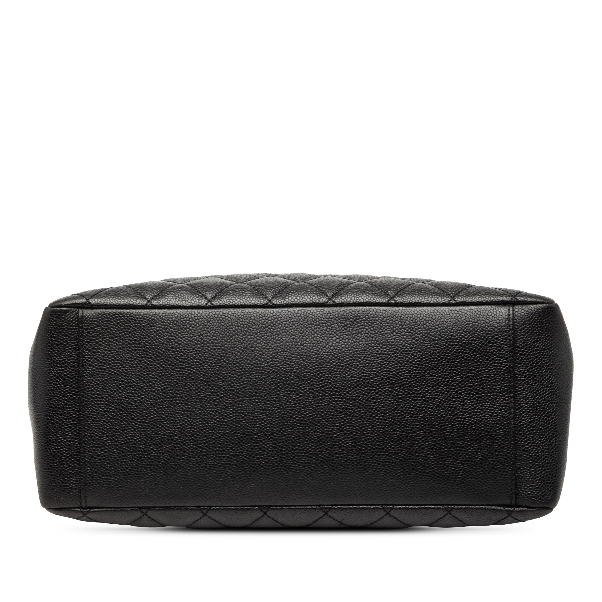 The Grand Shopping Tote features a quilted caviar leather body, leather woven chain shoulder straps, an open top, an interior zip compartment, an exterior back slip pocket, and interior zip and slip pockets. Retail Price: 3890.00
