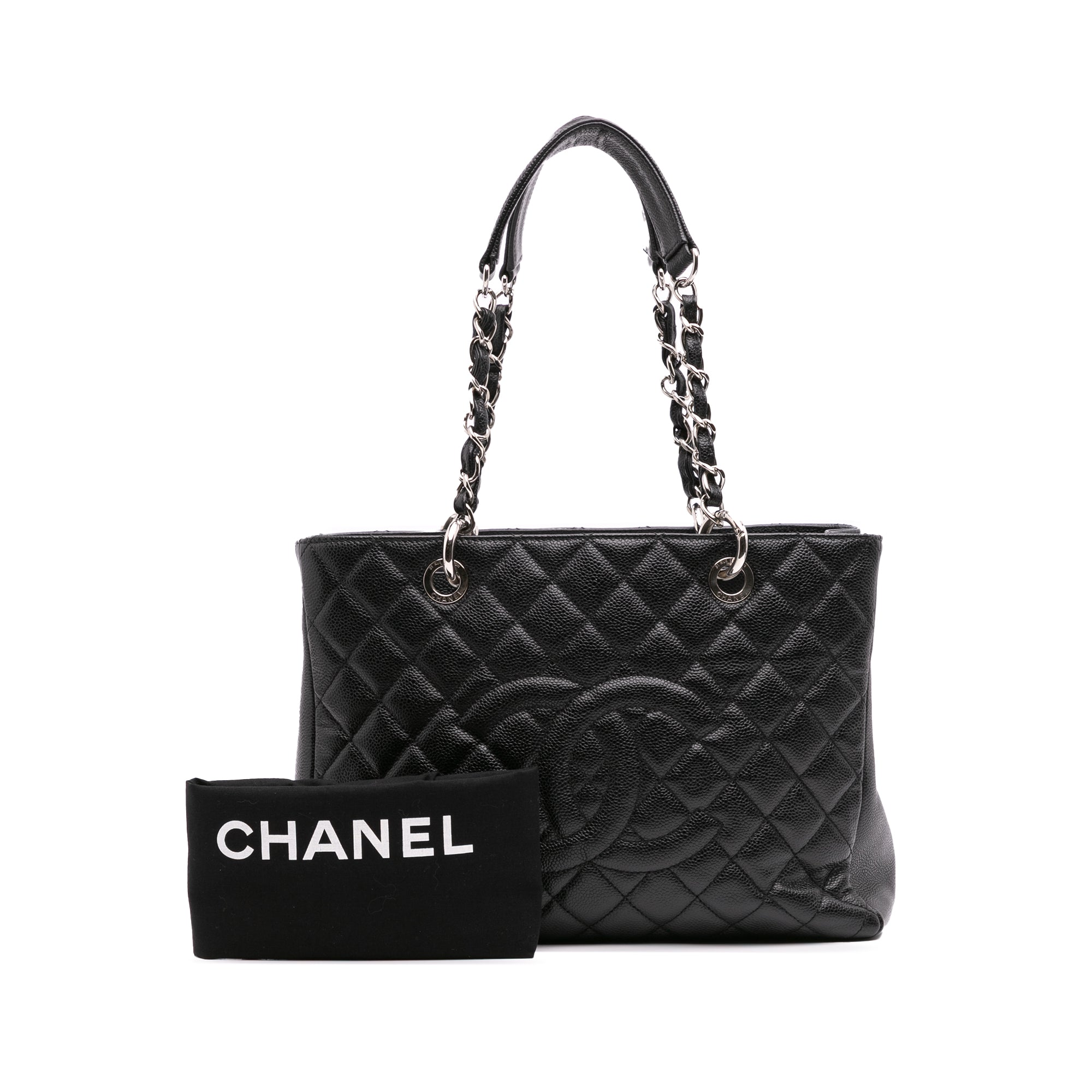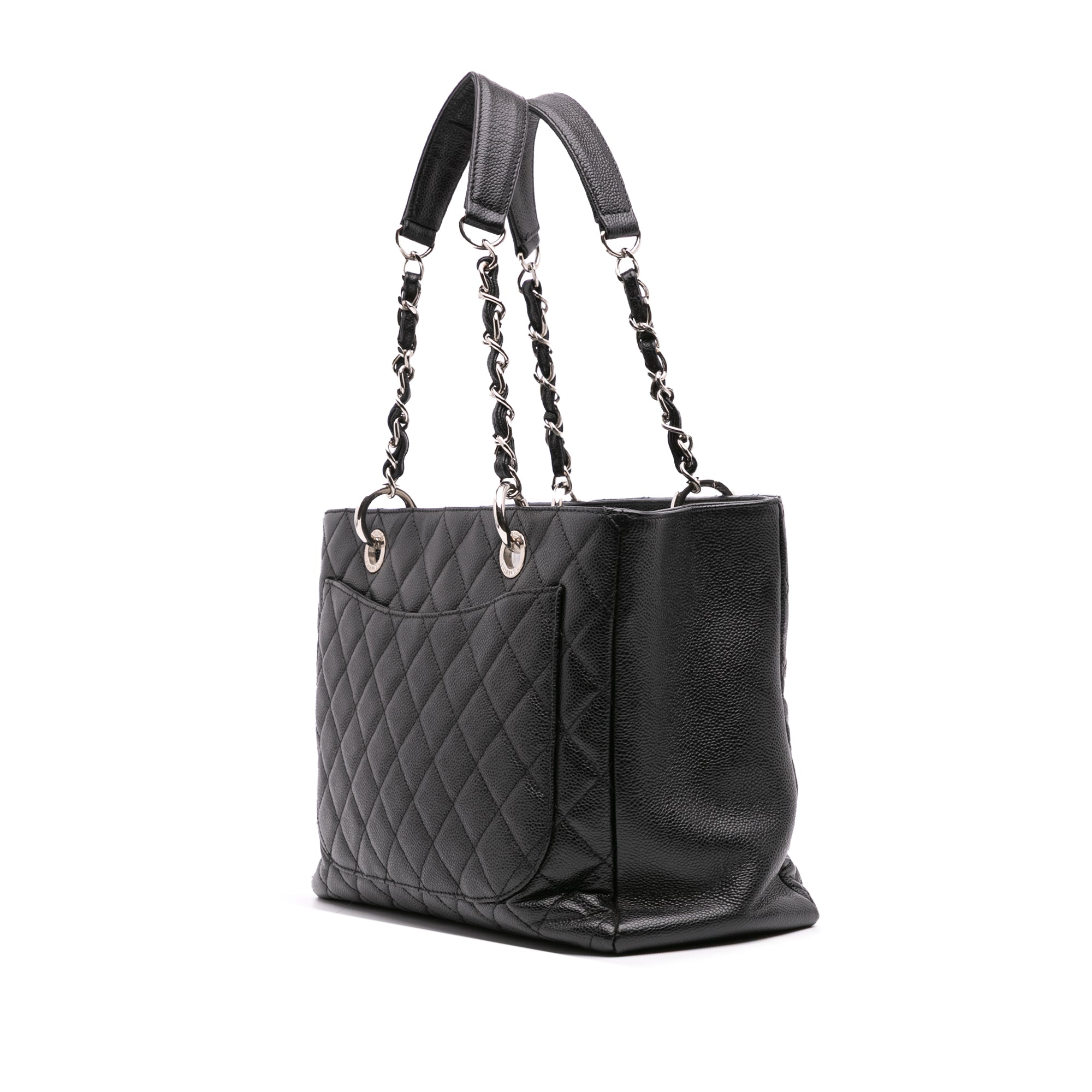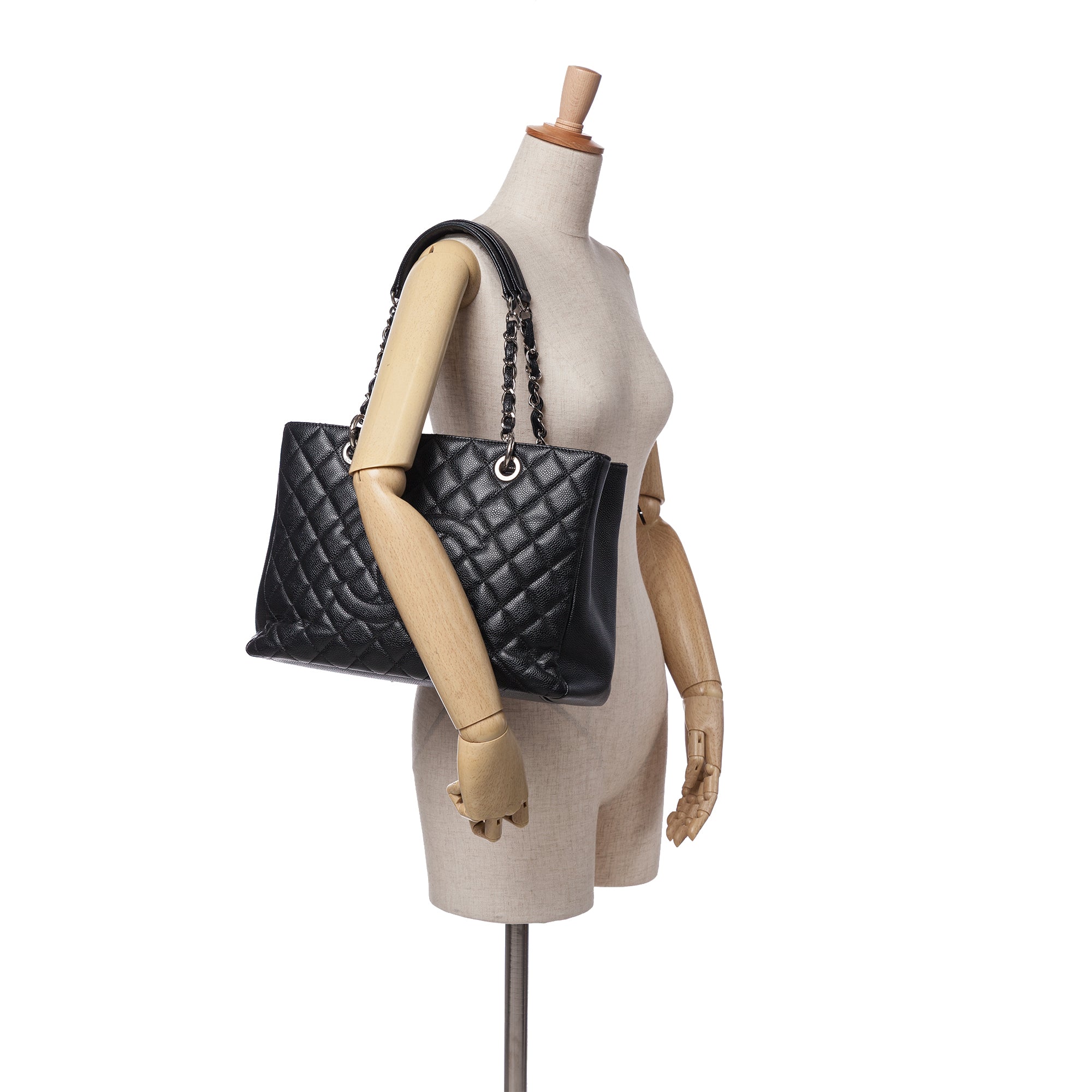 The Grand Shopping Tote features a quilted leather body, leather woven chain shoulder straps, an open top, an exterior back slip pocket, an interior zip compartment, and interior zip and slip pockets. Inclusion: Dust bag. Retail Price: 3890.00