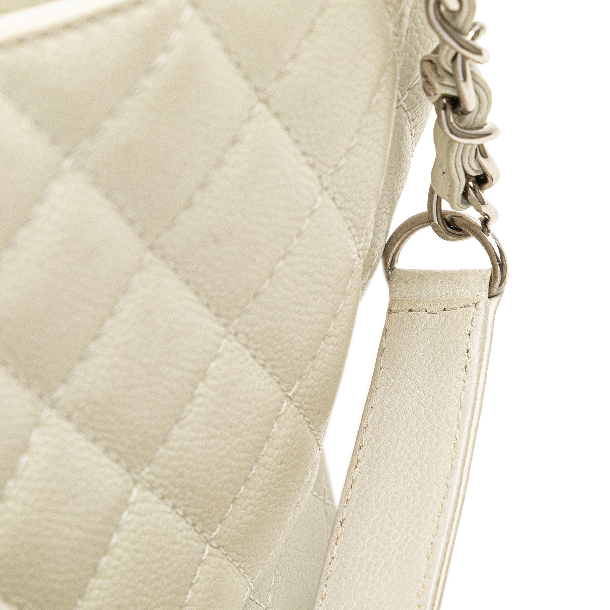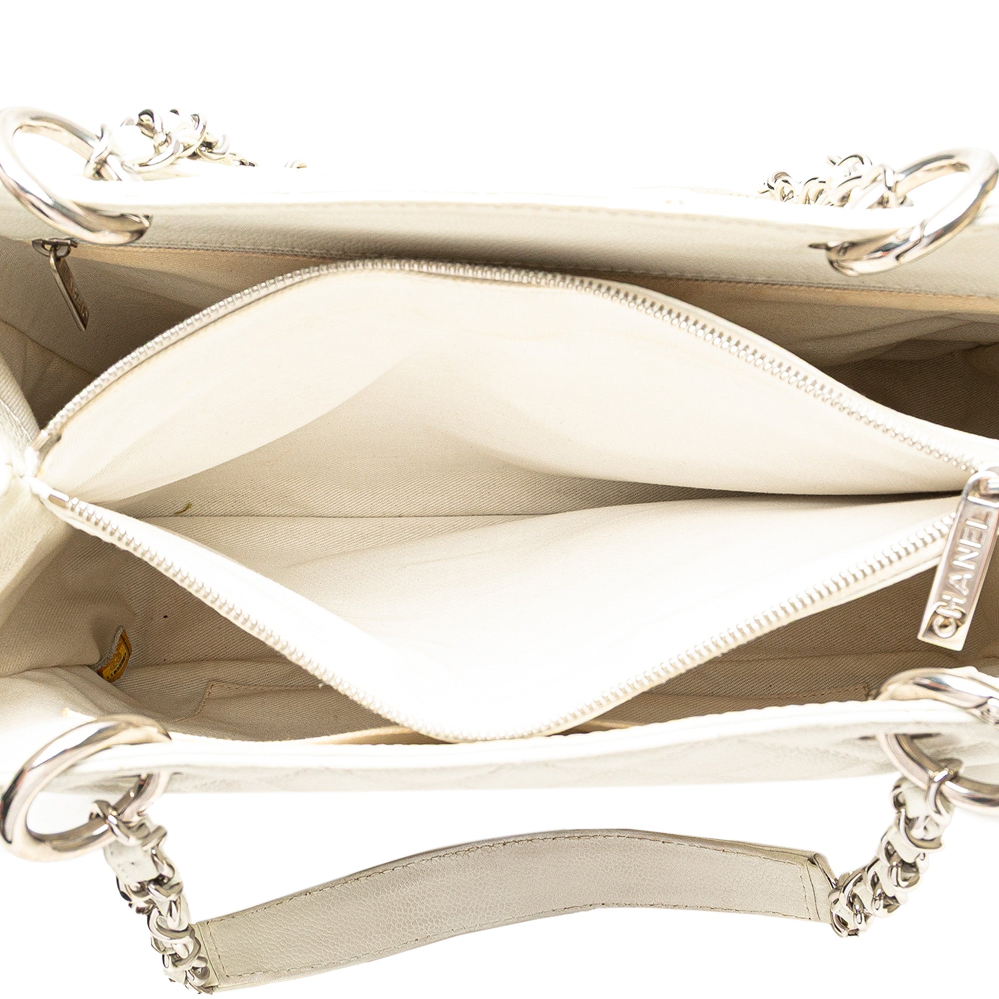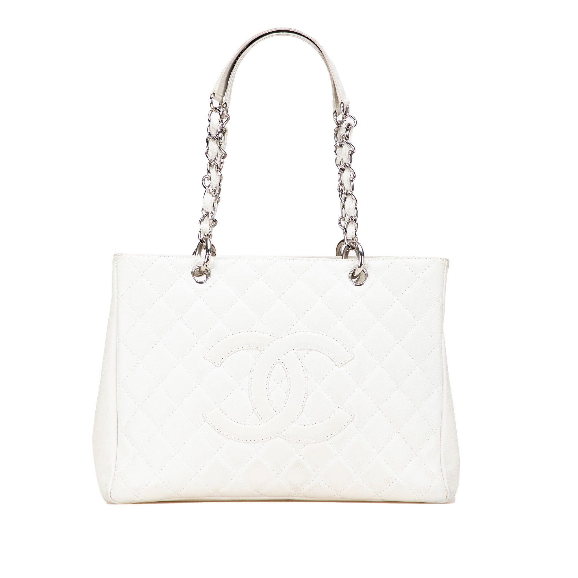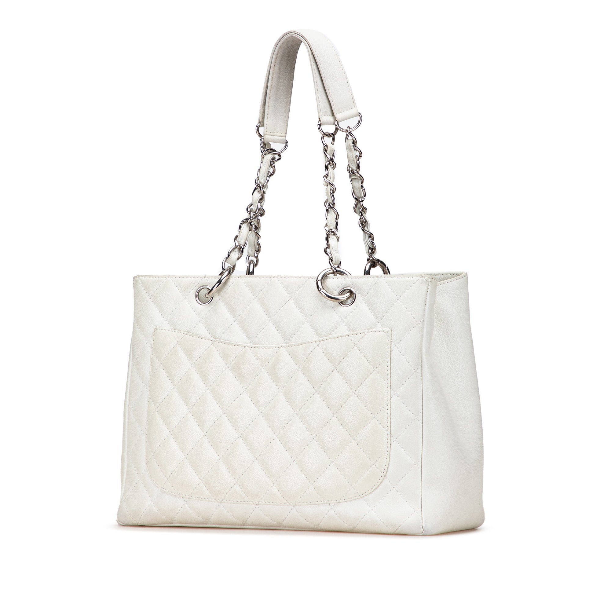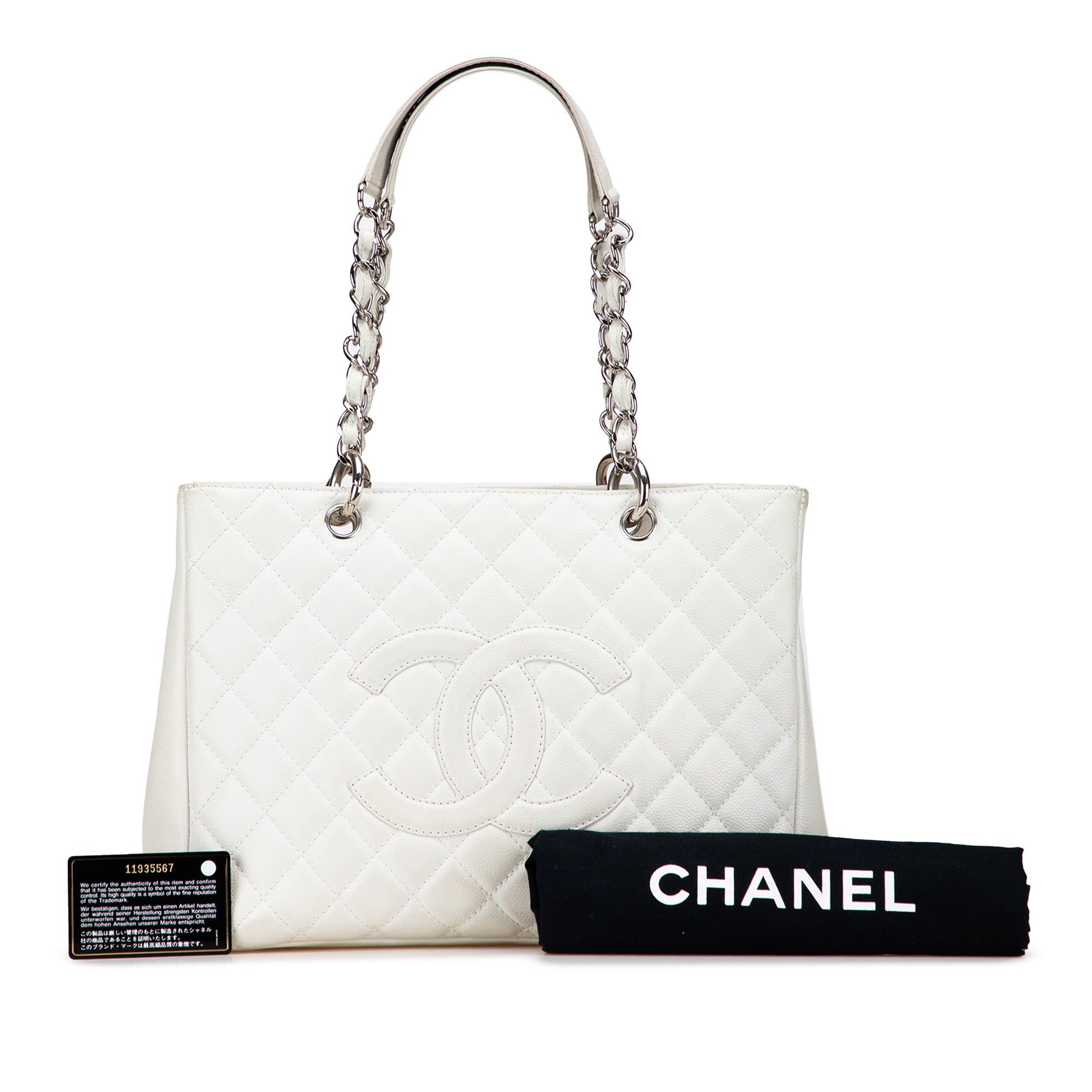 The Grand Shopping Tote features a quilted Caviar leather body, leather woven chain link shoulder straps, an open top, an interior zip compartment, an exterior back slip pocket, and interior zip and slip pockets. Inclusion: Dust bag, authenticity card. Retail Price: 2900.00