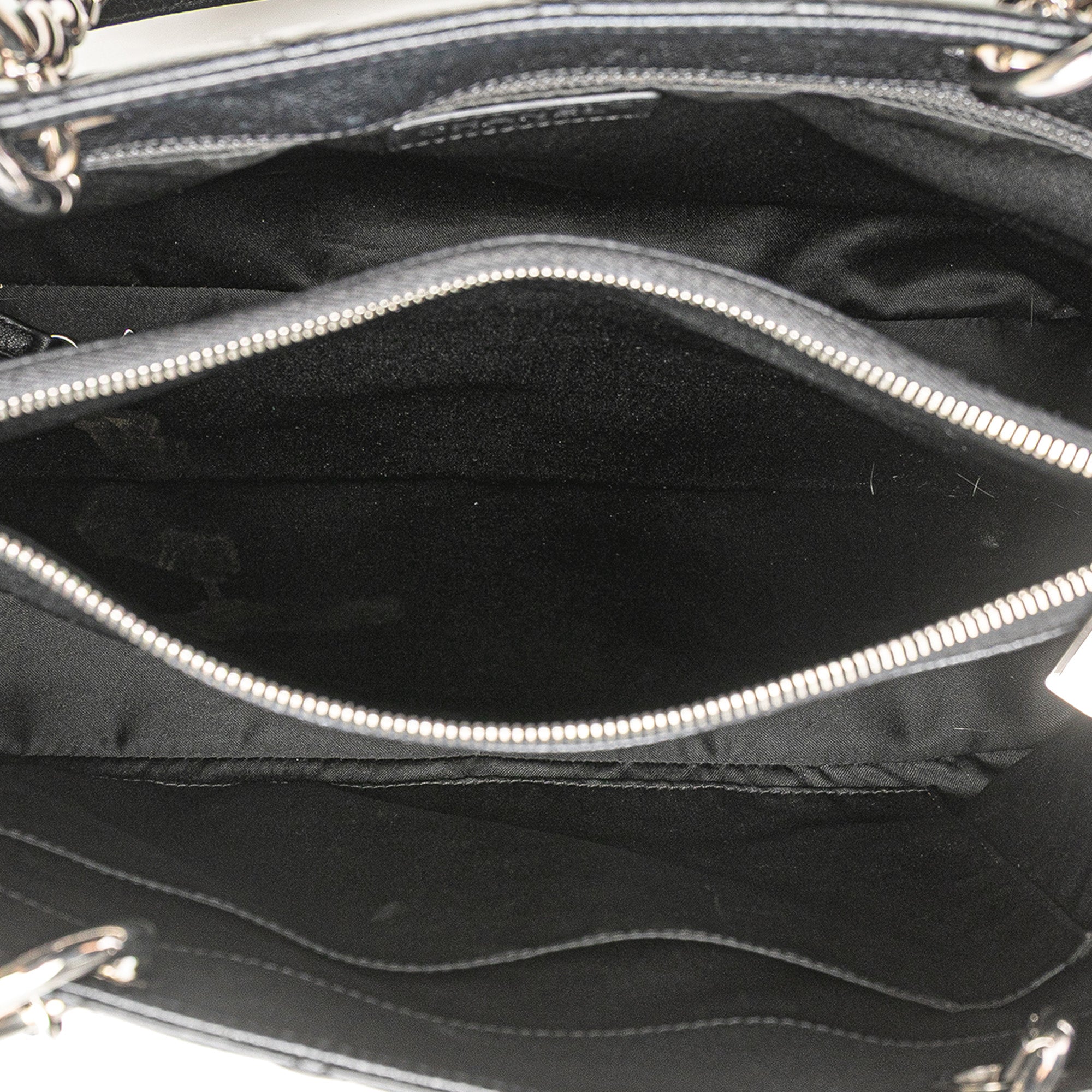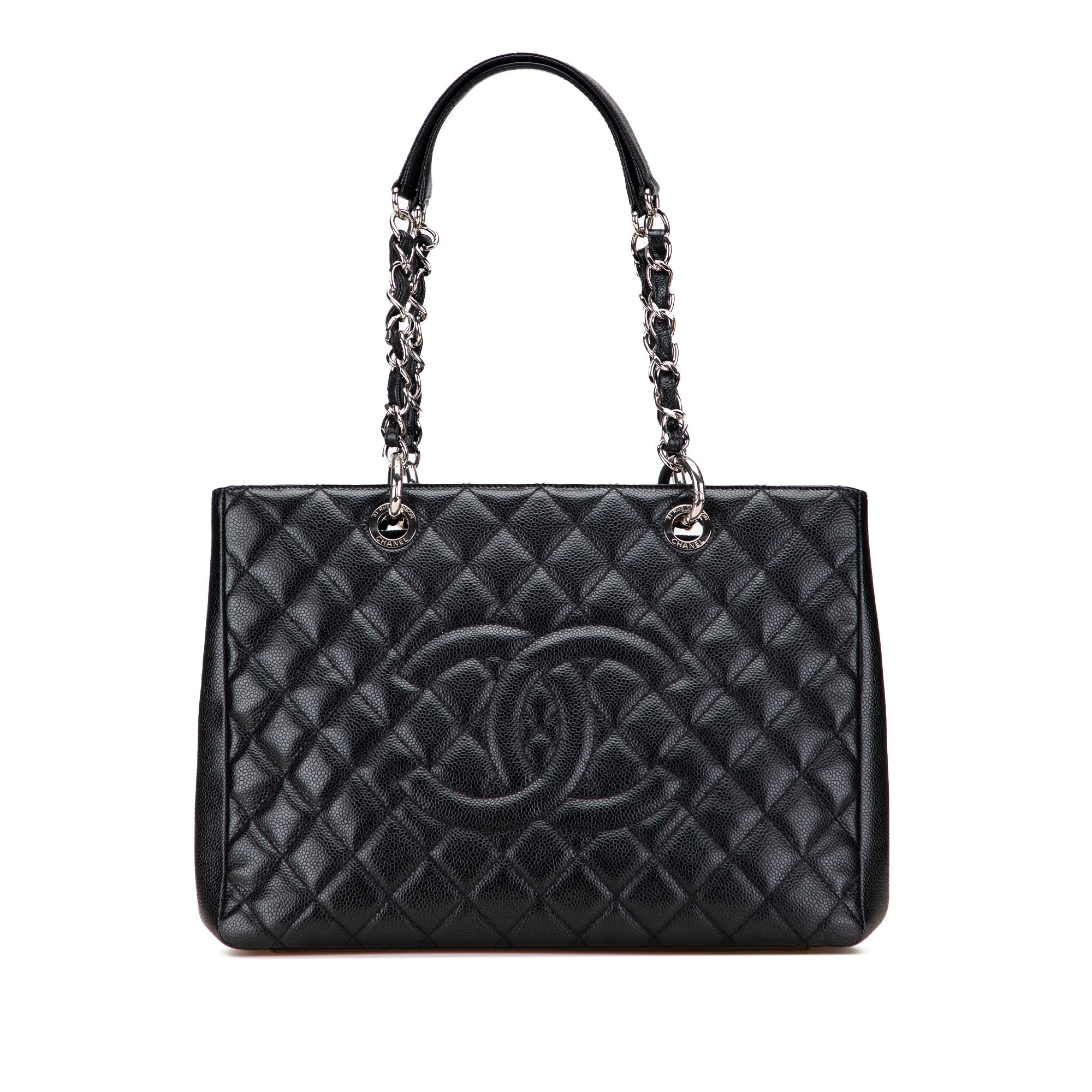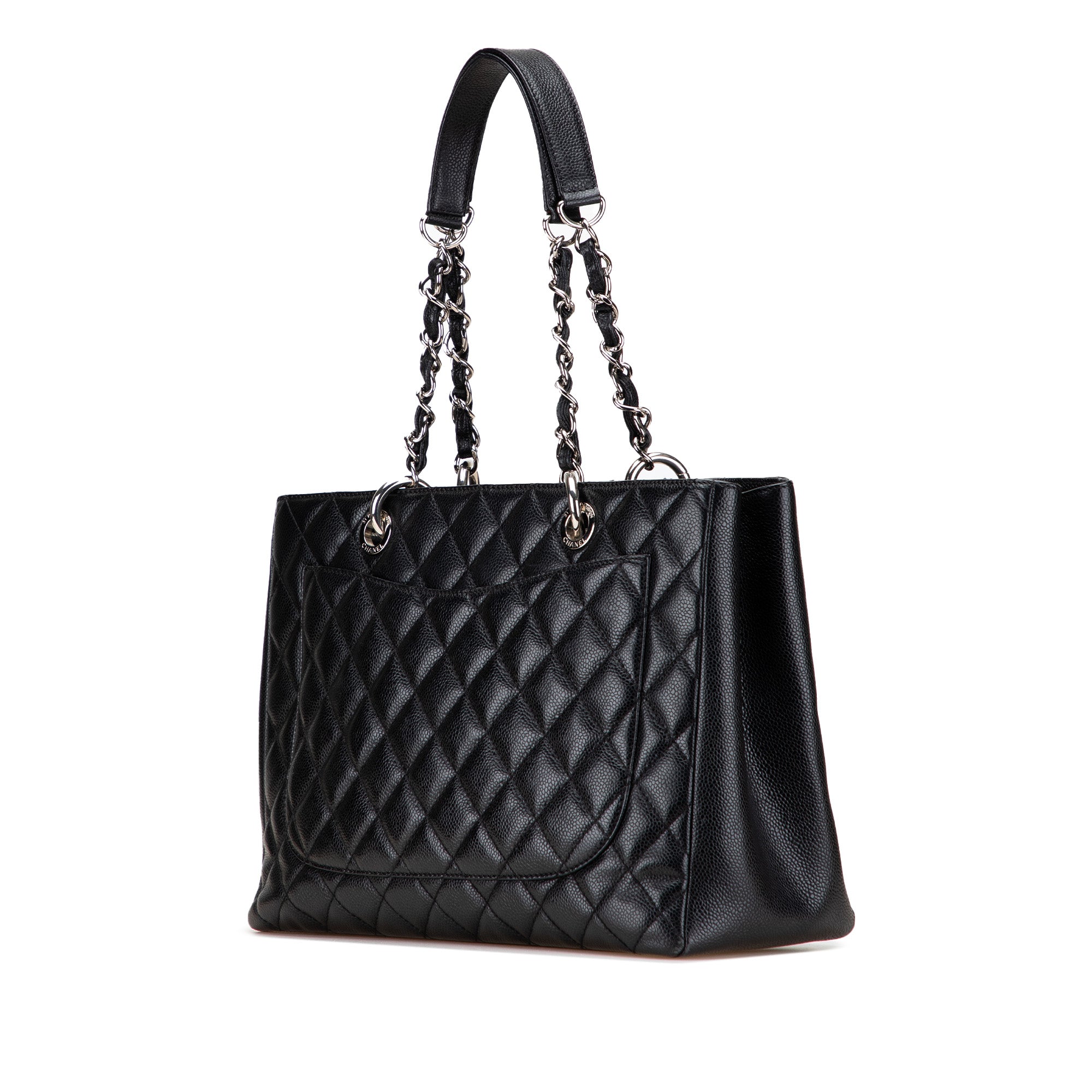 The Grand Shopping Tote features a quilted Caviar leather body, leather woven chain shoulder straps, an open top, an interior zip compartment, an exterior back slip pocket, and interior zip and slip pockets. Inclusion: Dust bag. Retail Price: 3890.00