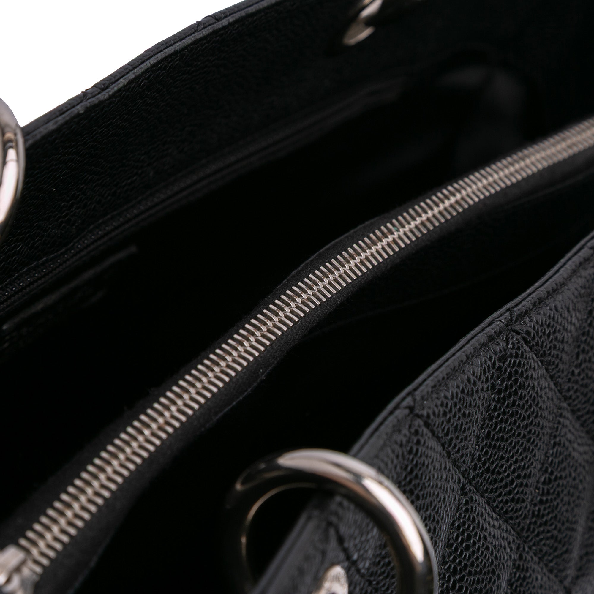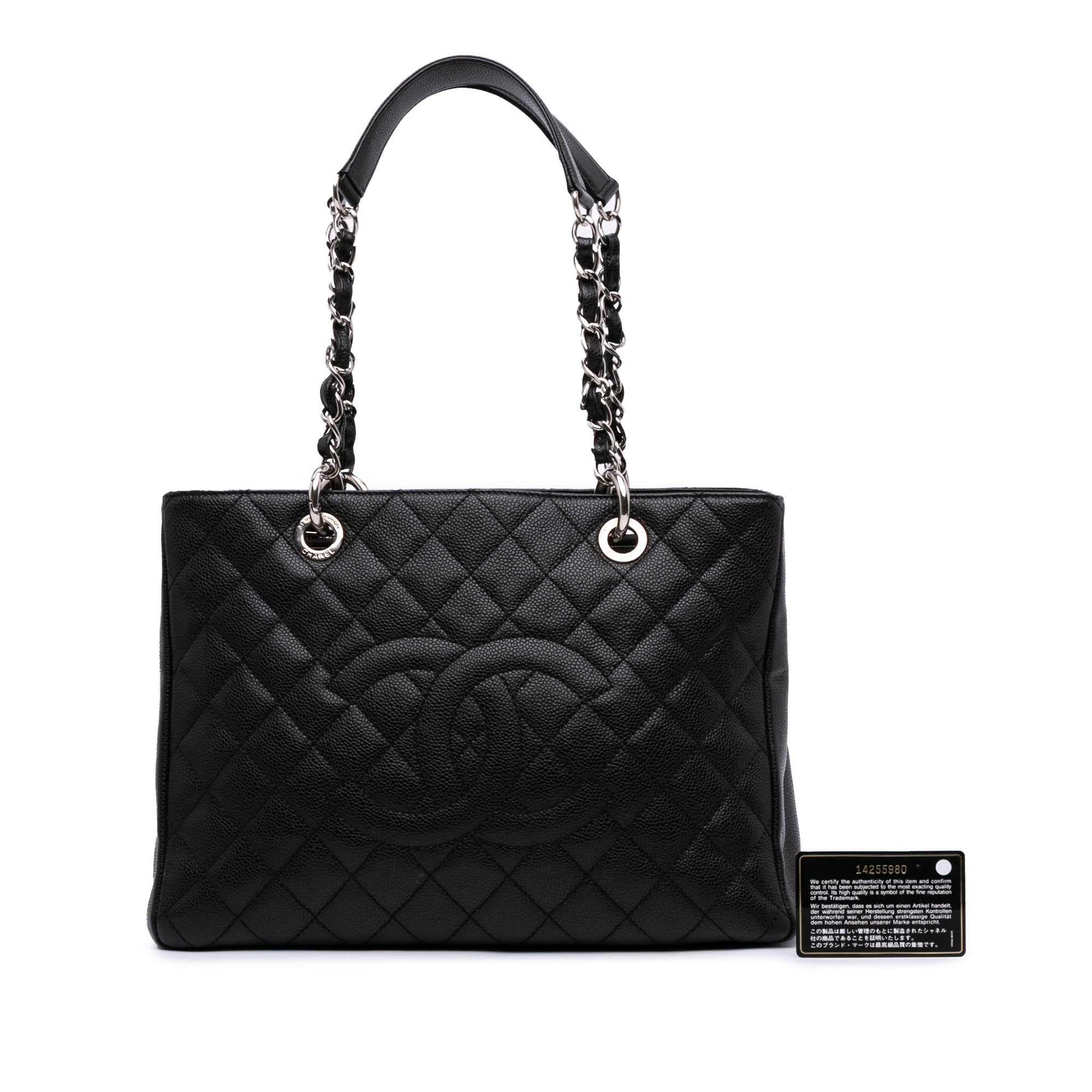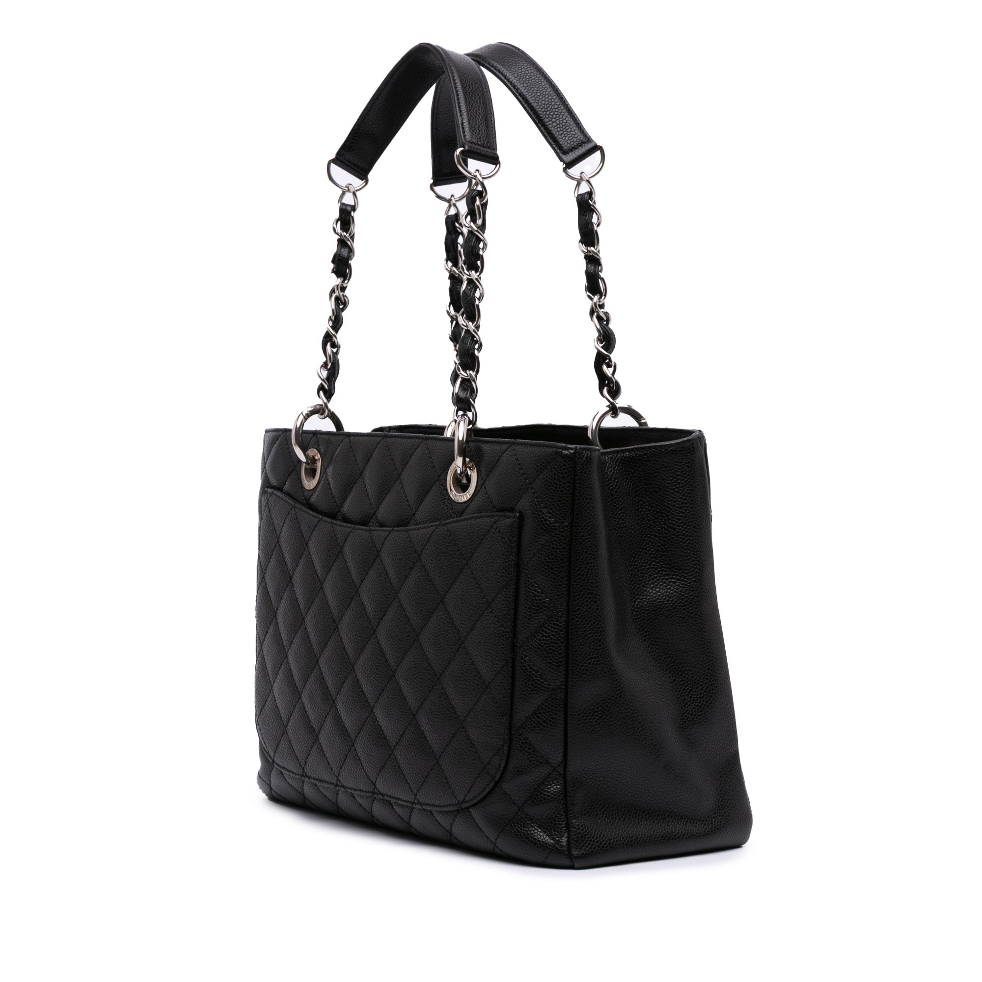 The Grand Shopping Tote features a quilted leather body, leather woven chain shoulder straps, an open top, an exterior slip pocket, and interior zip and slip pockets. Inclusion: authenticity card. Retail Price: 3890.00