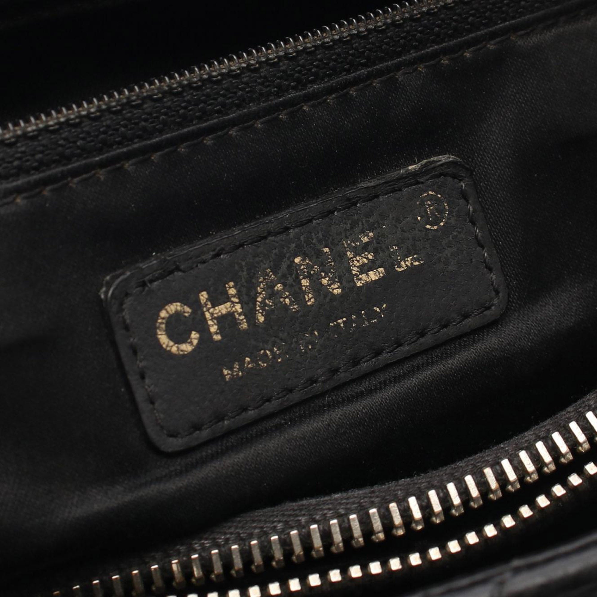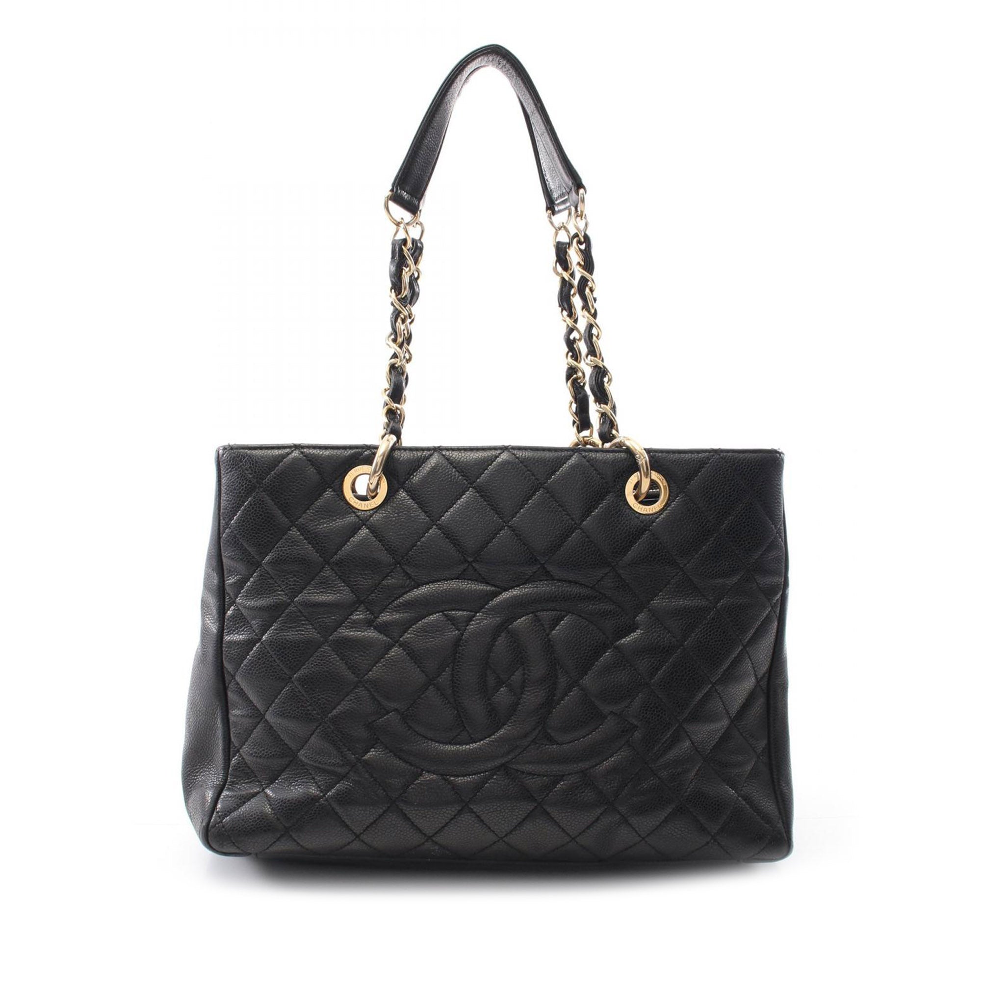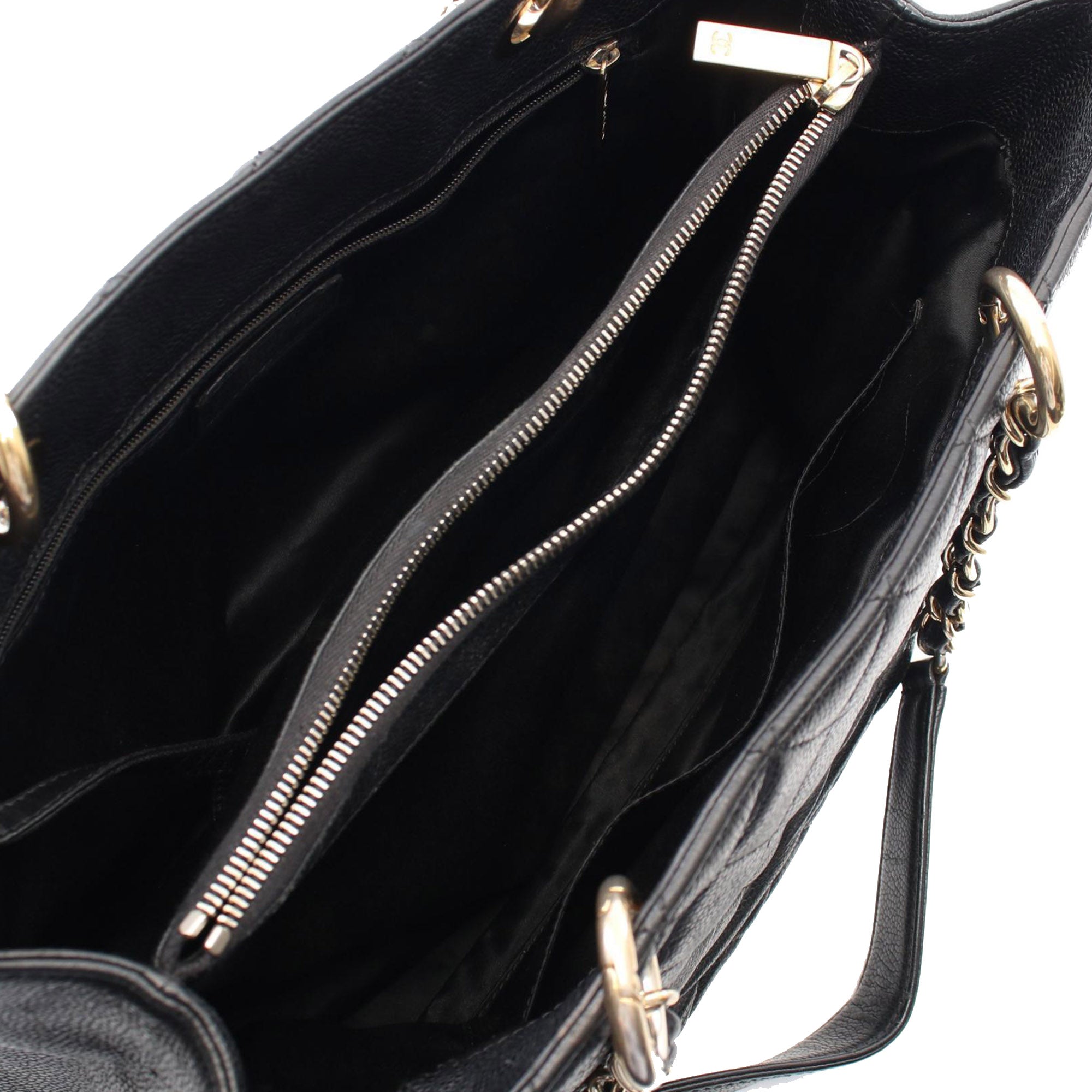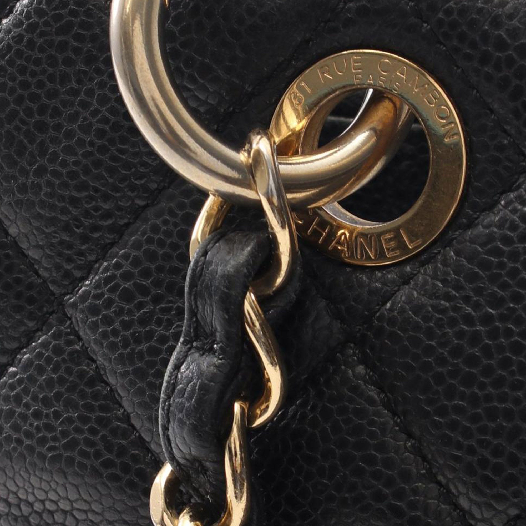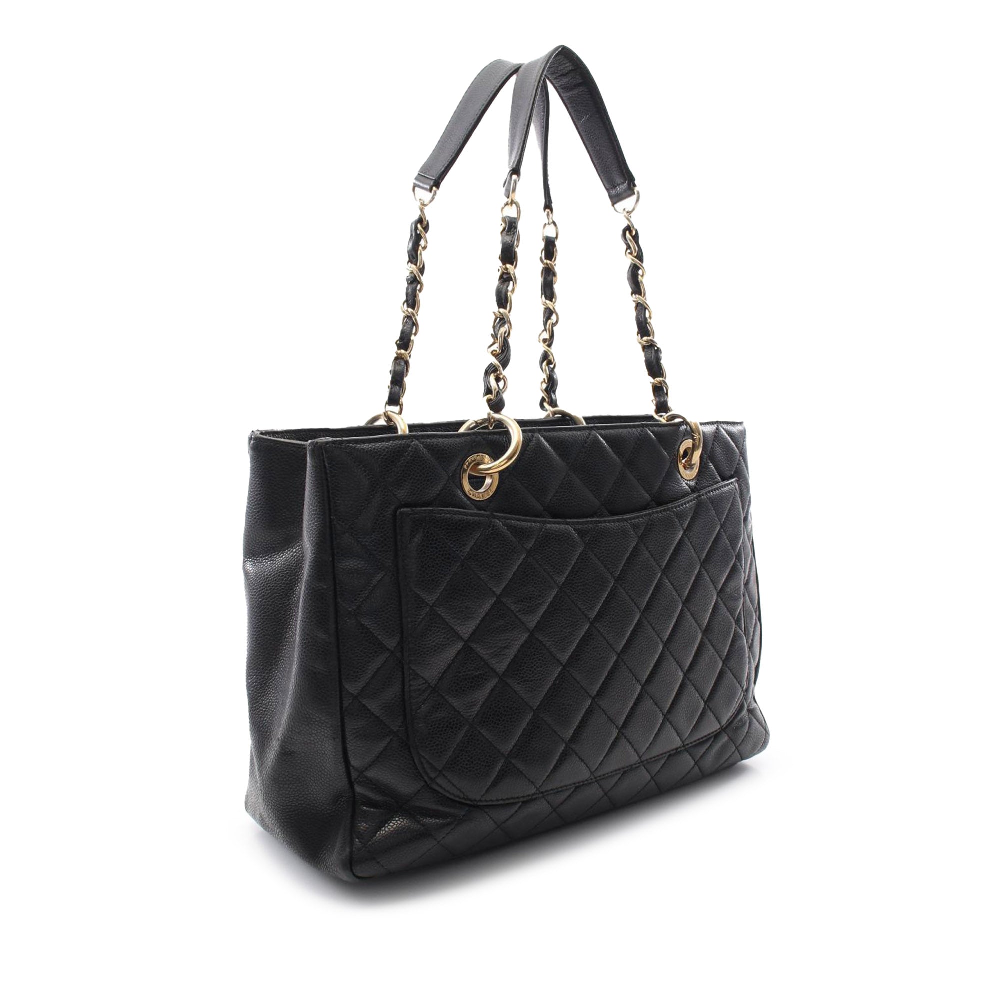 The Grand Shopping Tote features a quilted Caviar leather body, leather woven chain shoulder straps, an open top, an interior zip compartment, an exterior back slip pocket, and interior zip and slip pockets. Retail Price: 3890.00