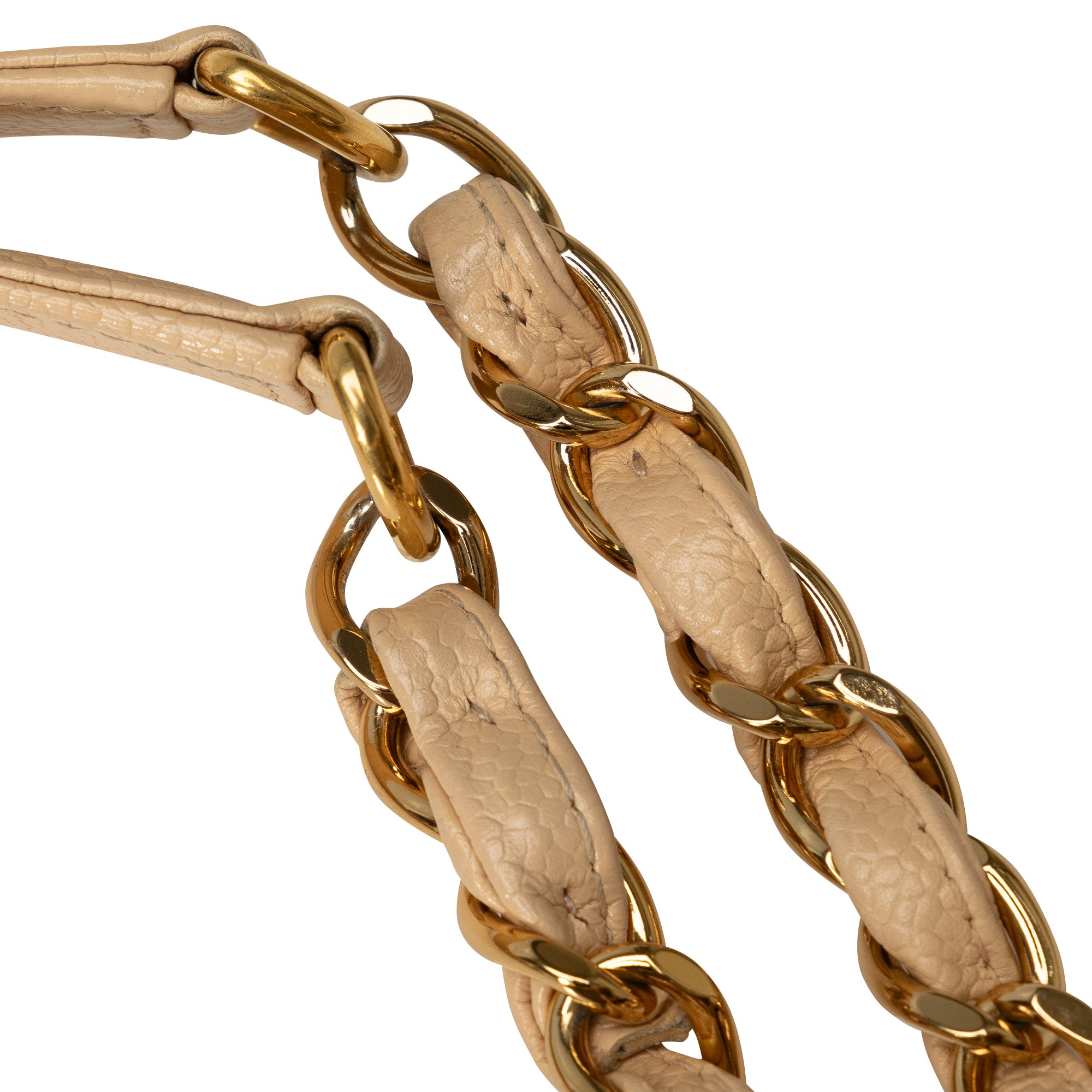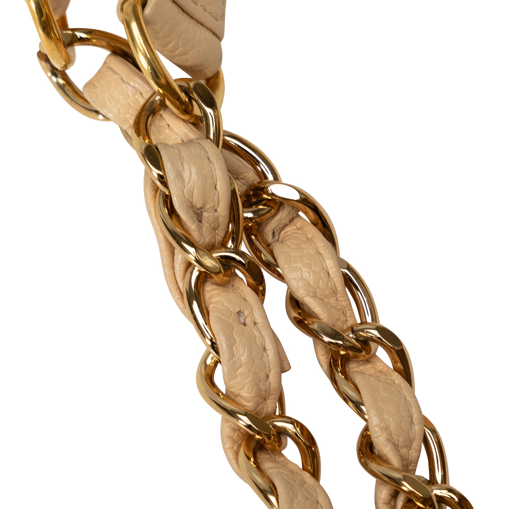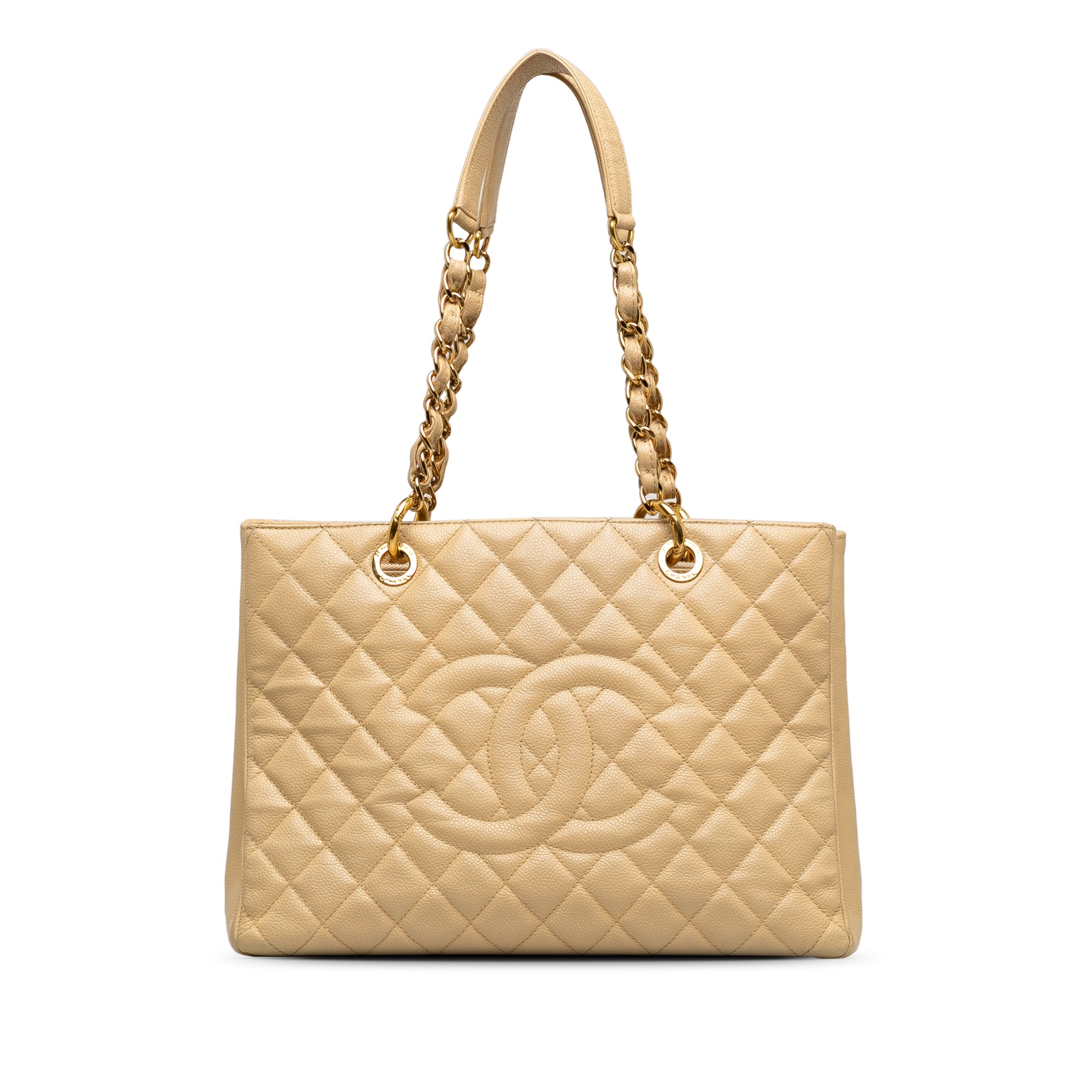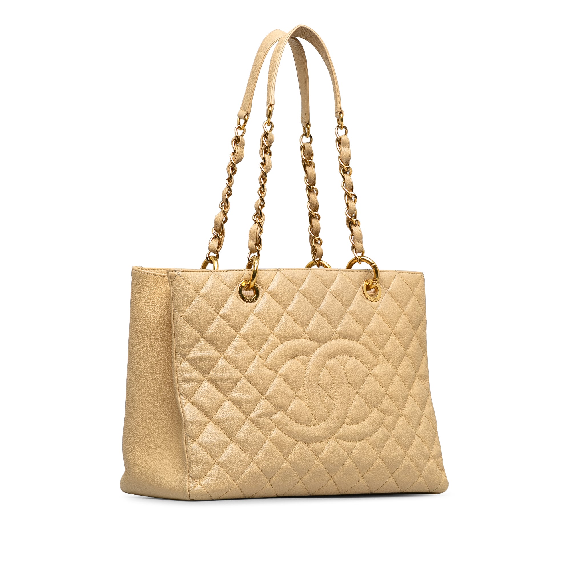 The Grand Shopping Tote features a quilted caviar leather body, leather woven chain shoulder straps, an open top, an exterior slip pocket, and interior zip and slip pockets. Retail Price: 2900.00
