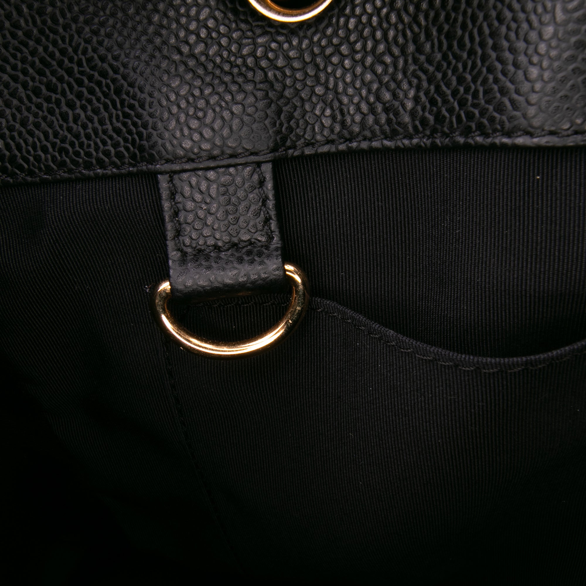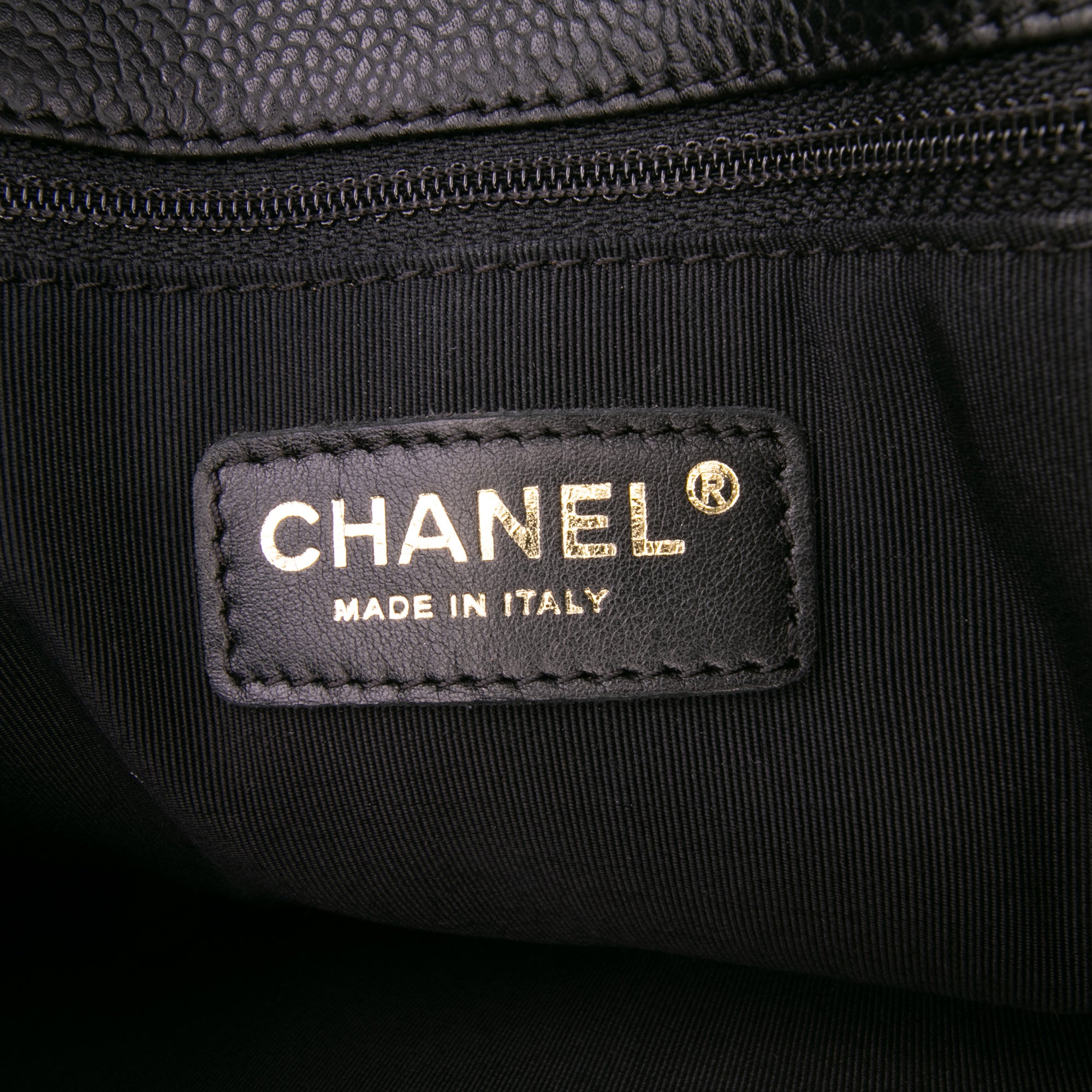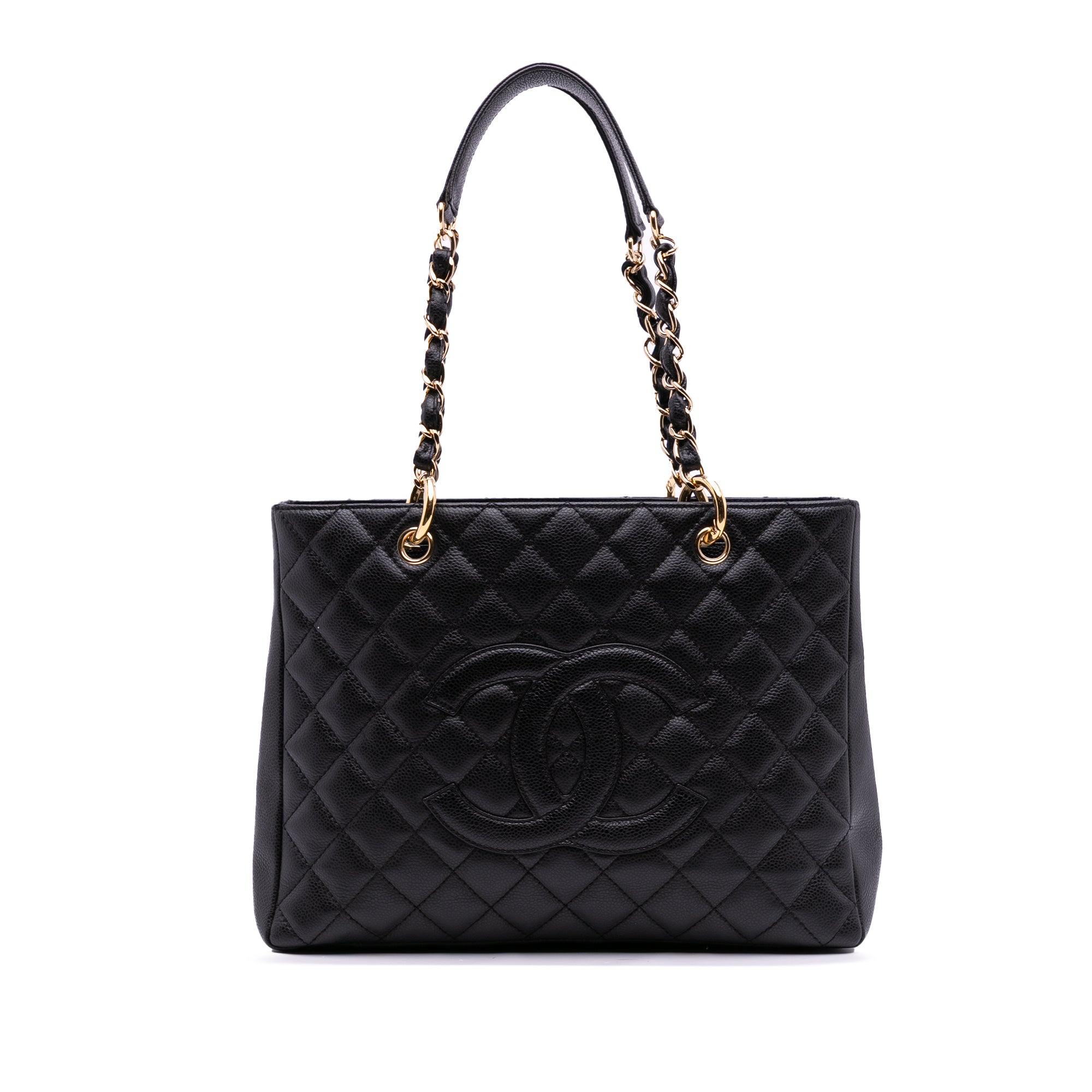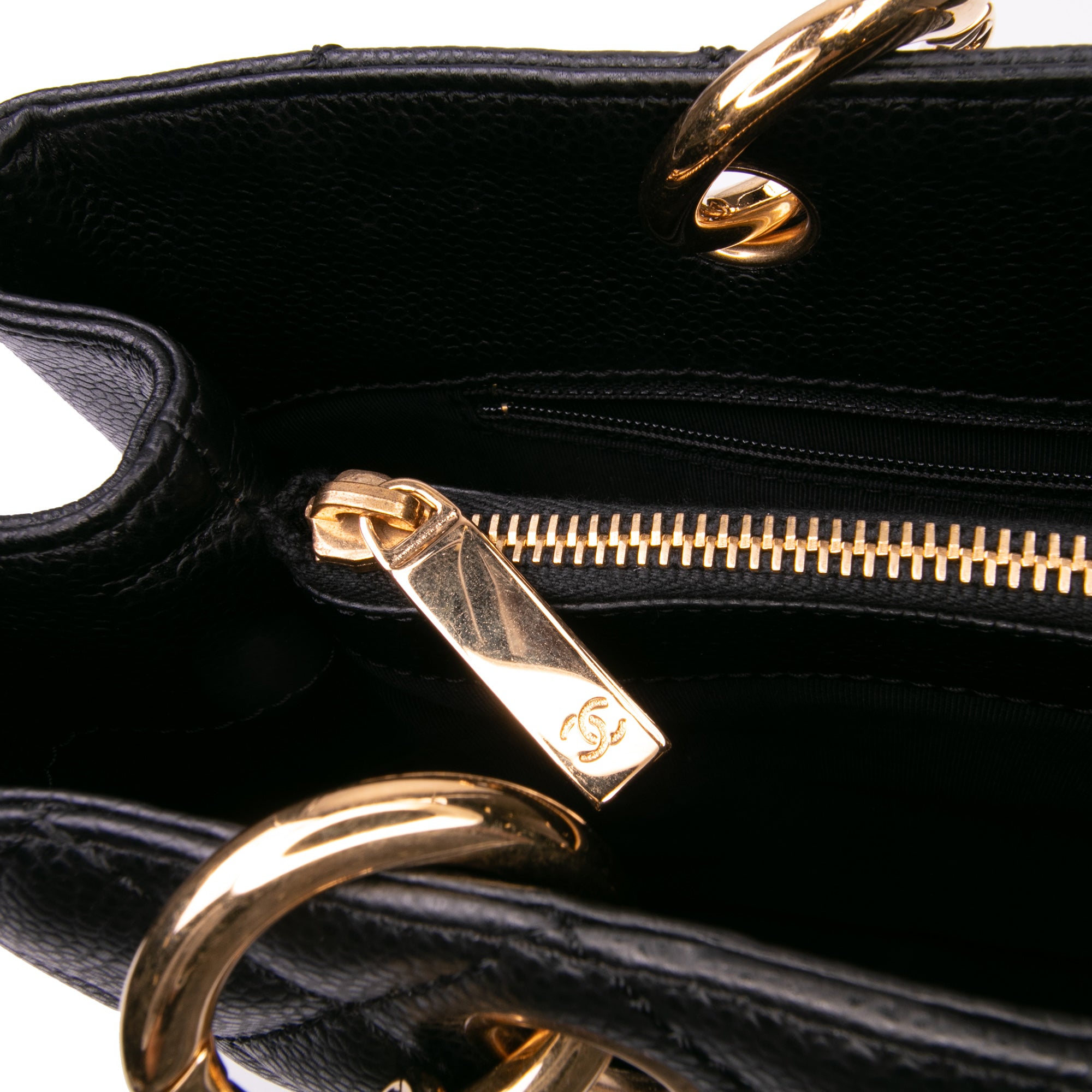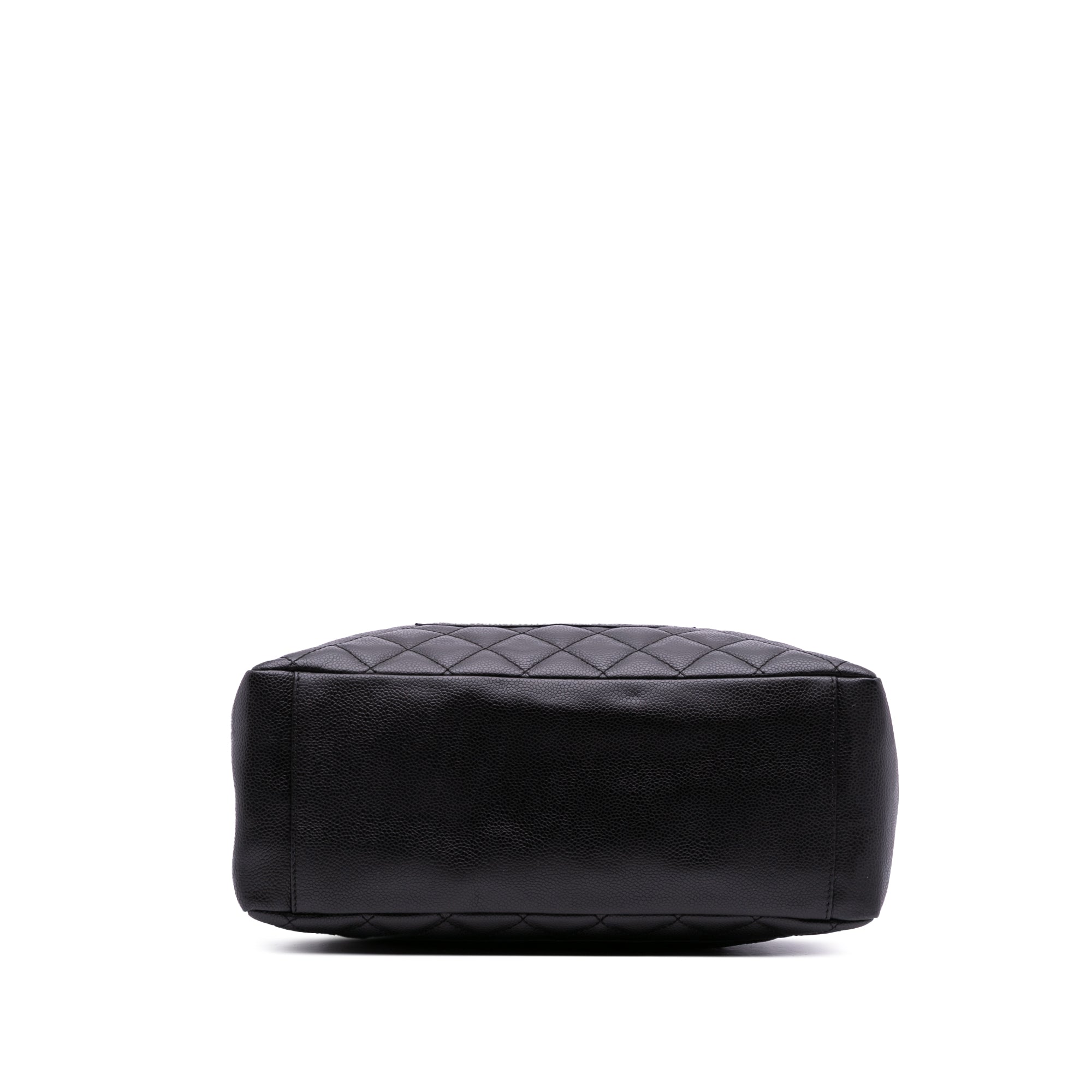 The Grand Shopping Tote features a quilted Caviar leather body, leather woven chain shoulder straps, an open top, an interior zip compartment, an exterior back slip pocket, and interior zip and slip pockets. Retail Price: 3890.00