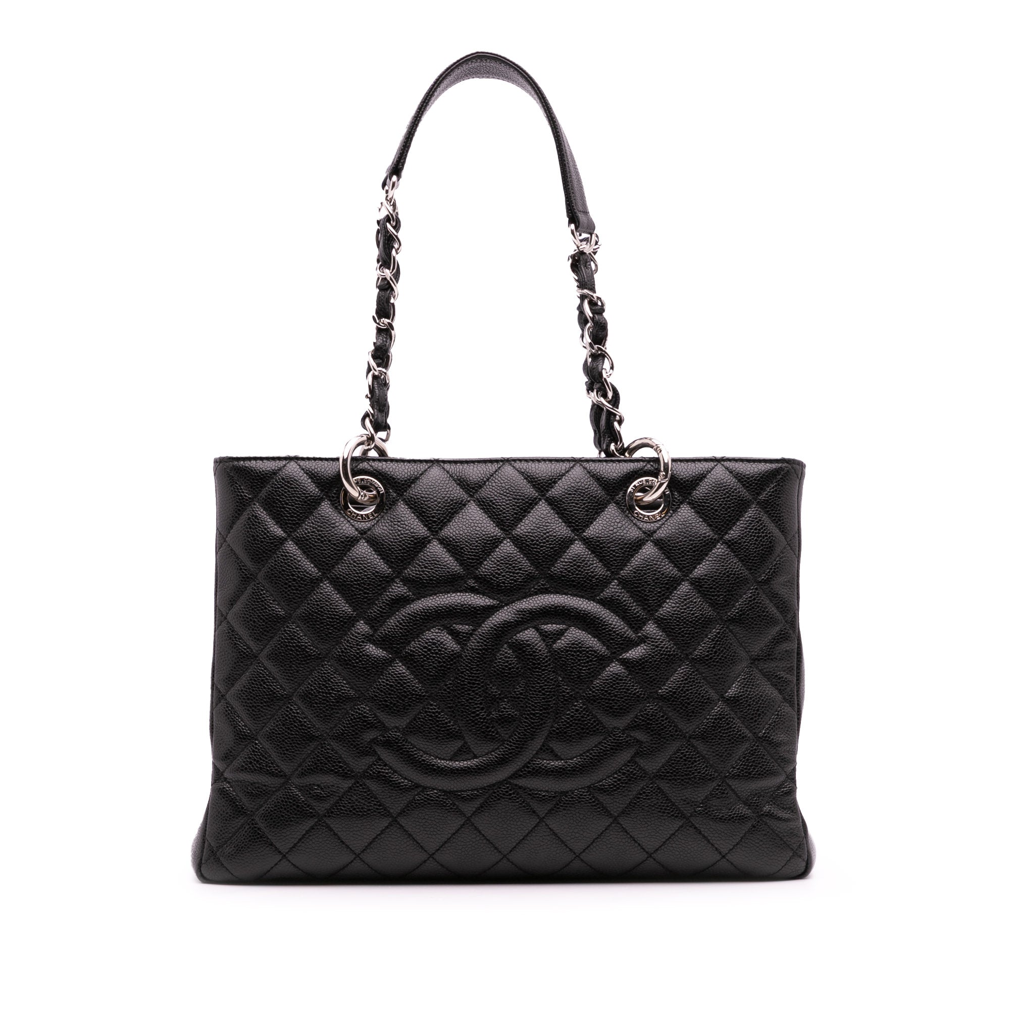 The Grand Shopping Tote features a quilted caviar leather body, leather woven chain shoulder straps, an open top, an interior zip compartment, an exterior back slip pocket, and interior zip and slip pockets. Retail Price: 3890.00