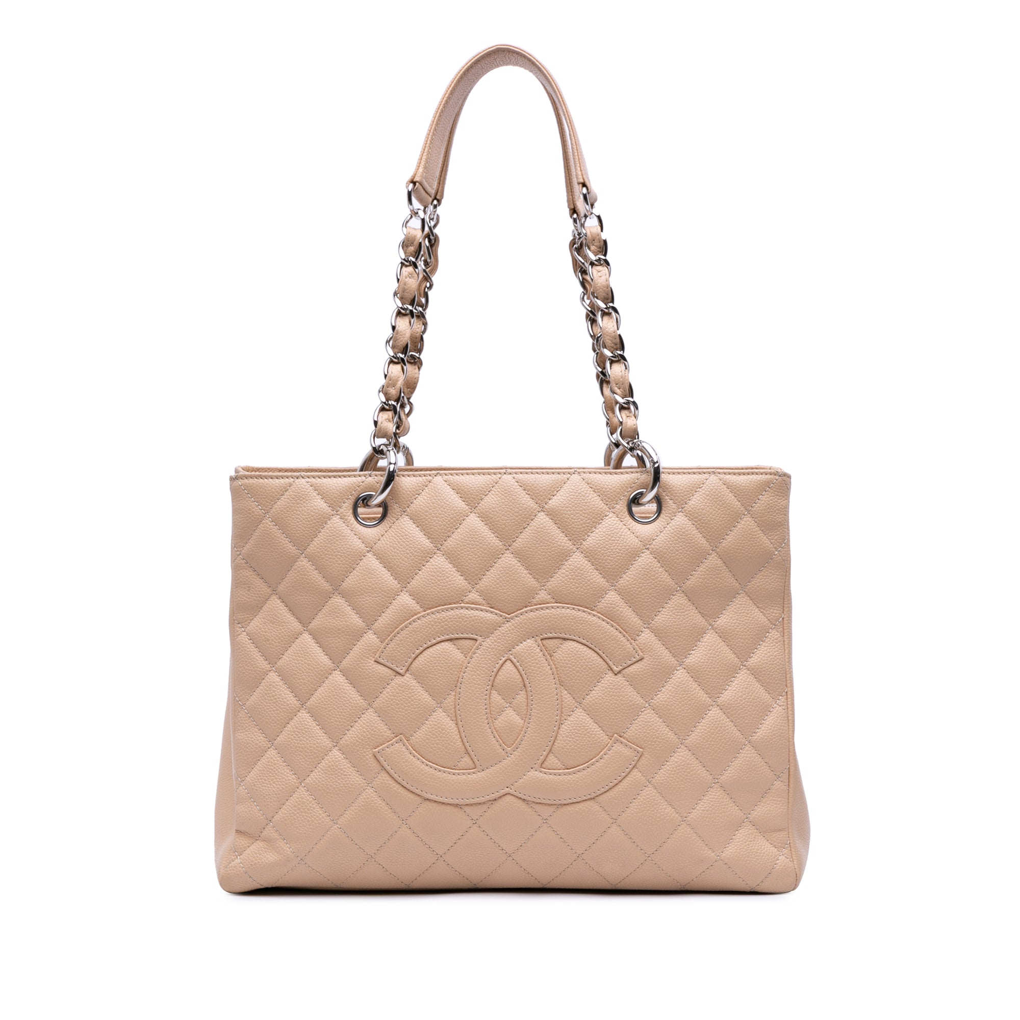 The Grand Shopping Tote features a quilted caviar leather body, leather woven chain shoulder straps, an open top, an exterior slip pocket, and interior zip and slip pockets. Inclusion: authenticity card. Retail Price: 3463.00