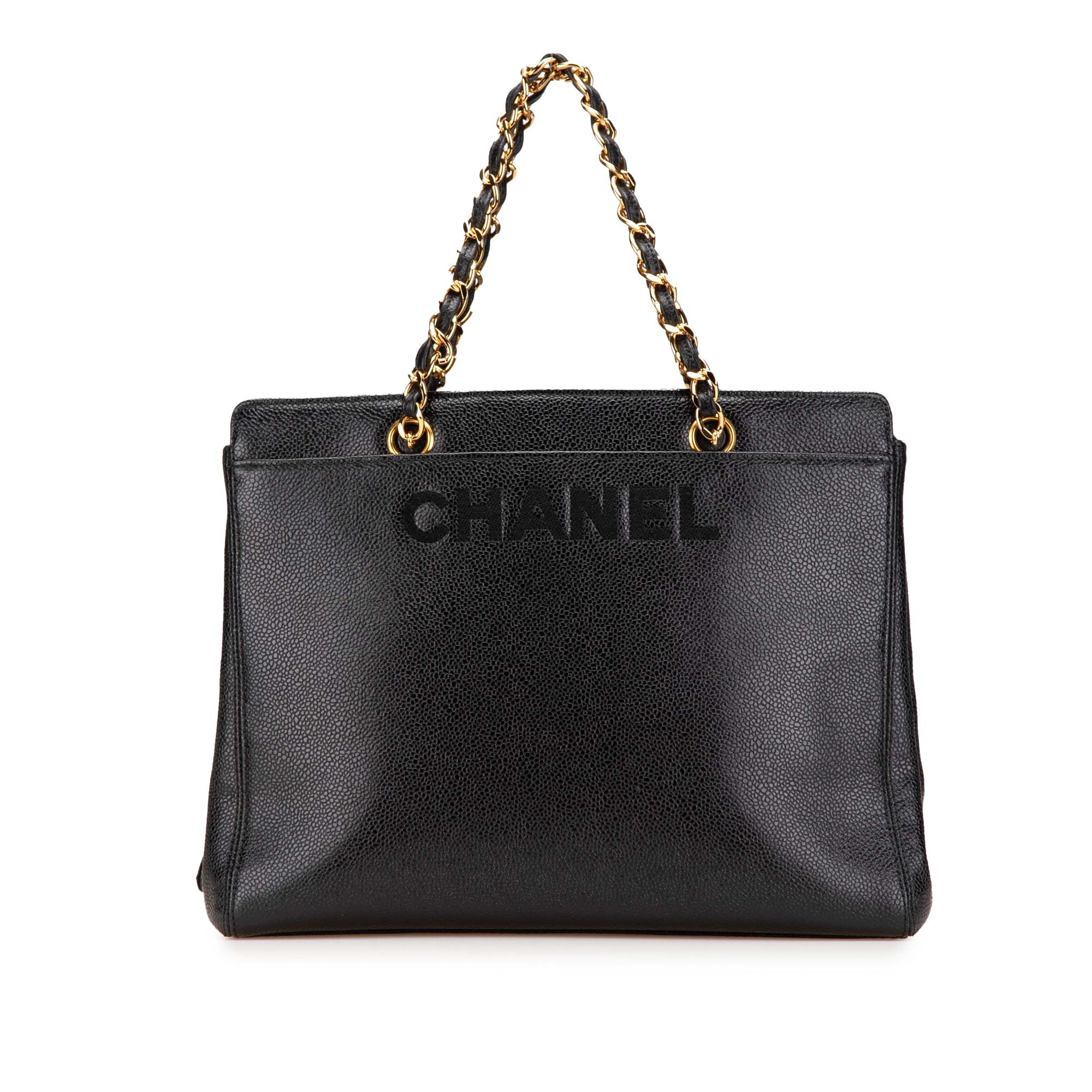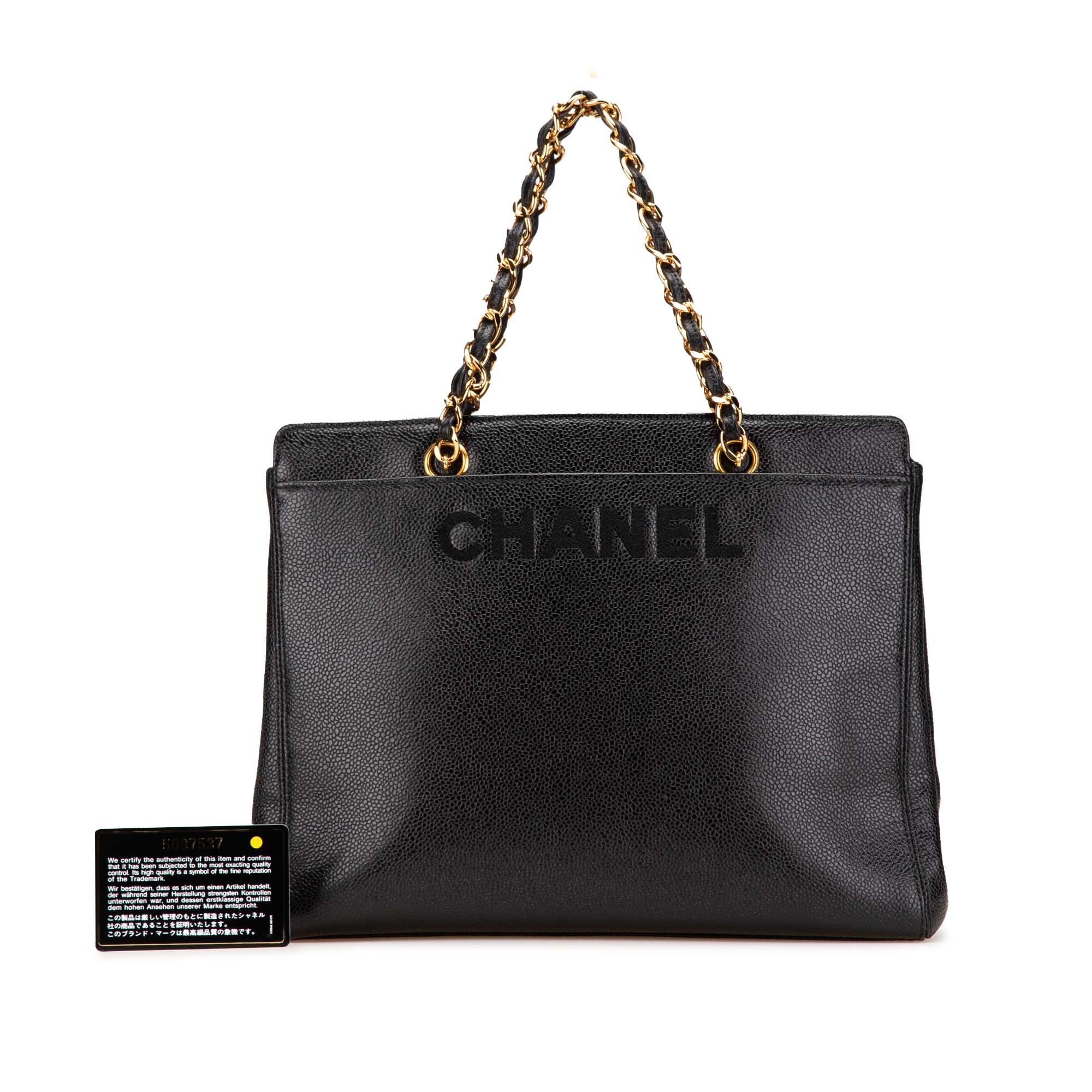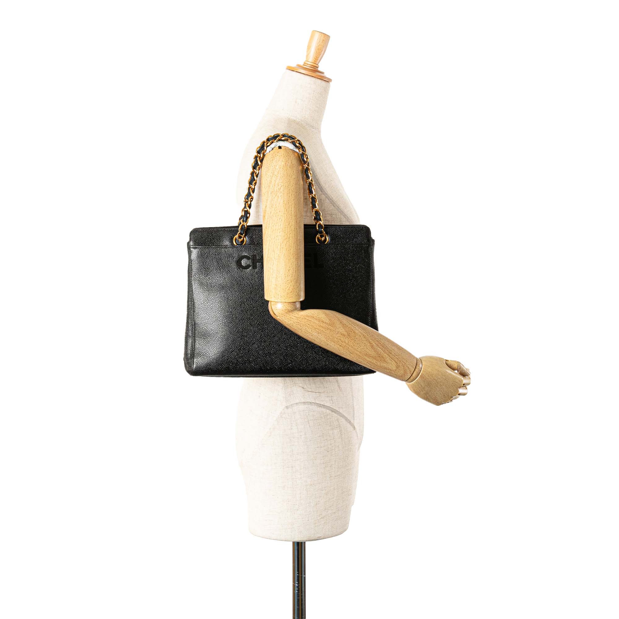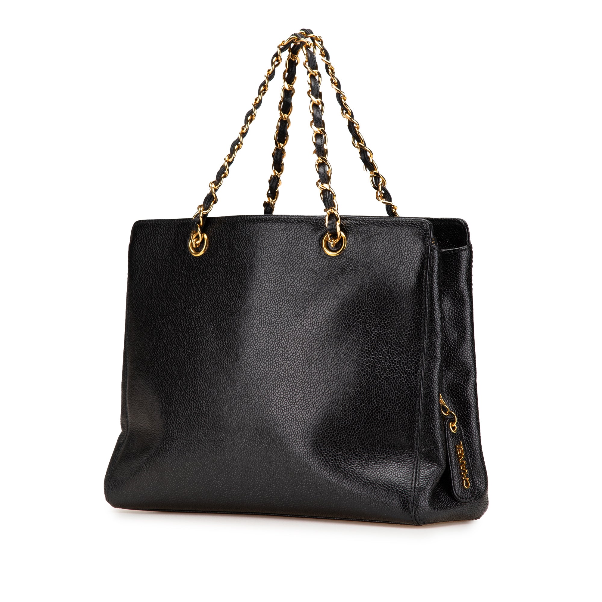 This tote bag features a caviar leather body, leather woven chain link straps, an open top, an interior zip compartment, an exterior front slip pocket, and an interior zip pocket. Inclusion: authenticity card. Retail Price: 3400.00