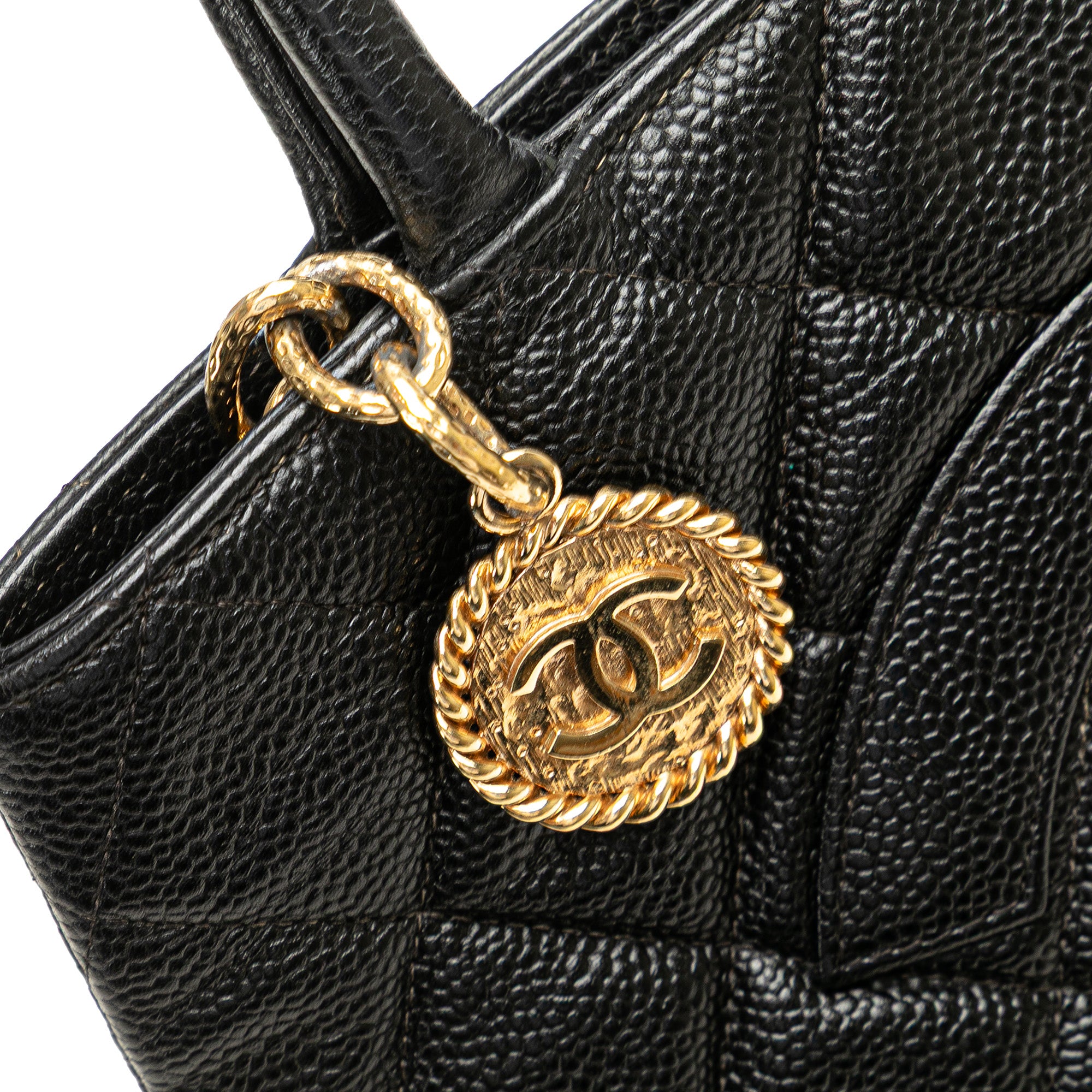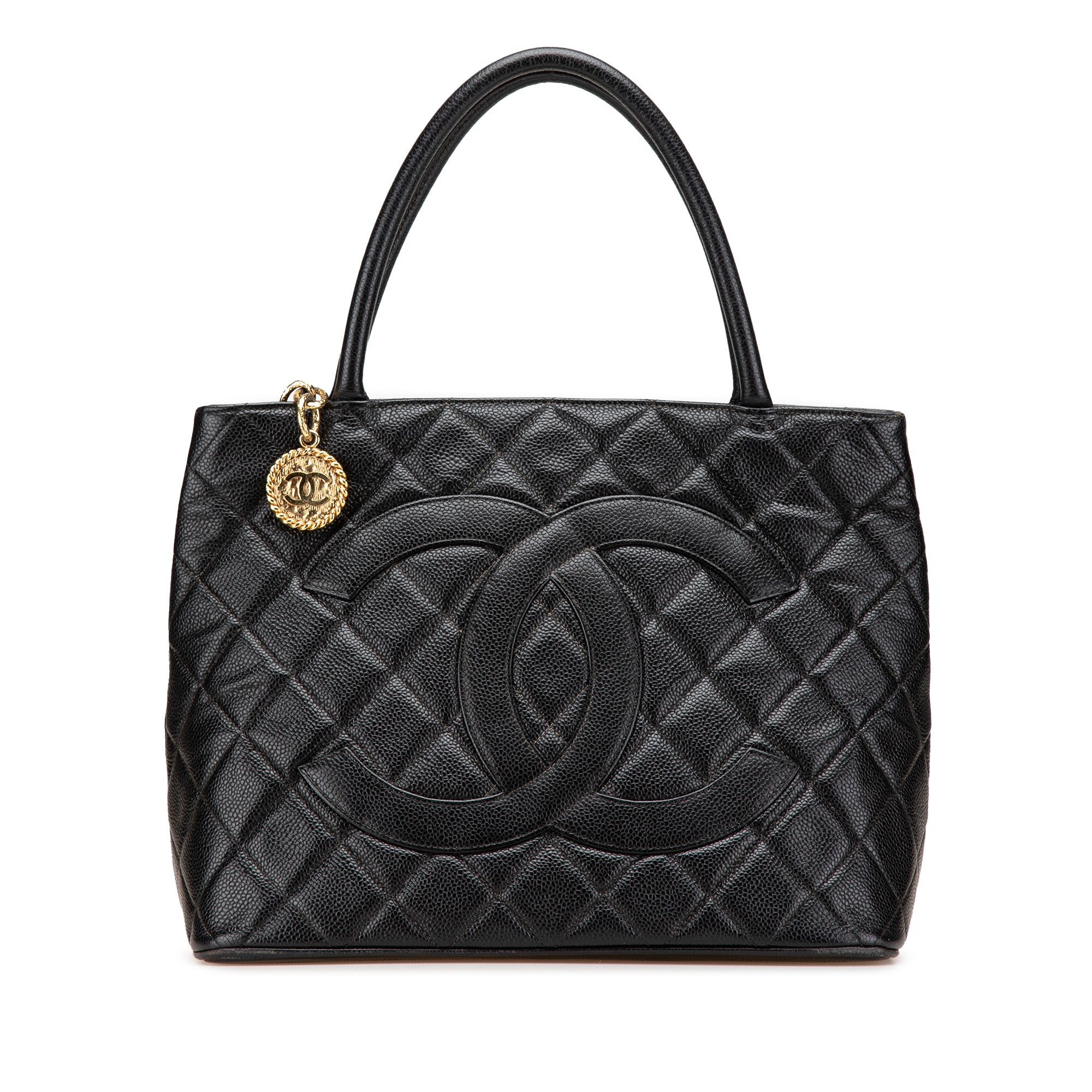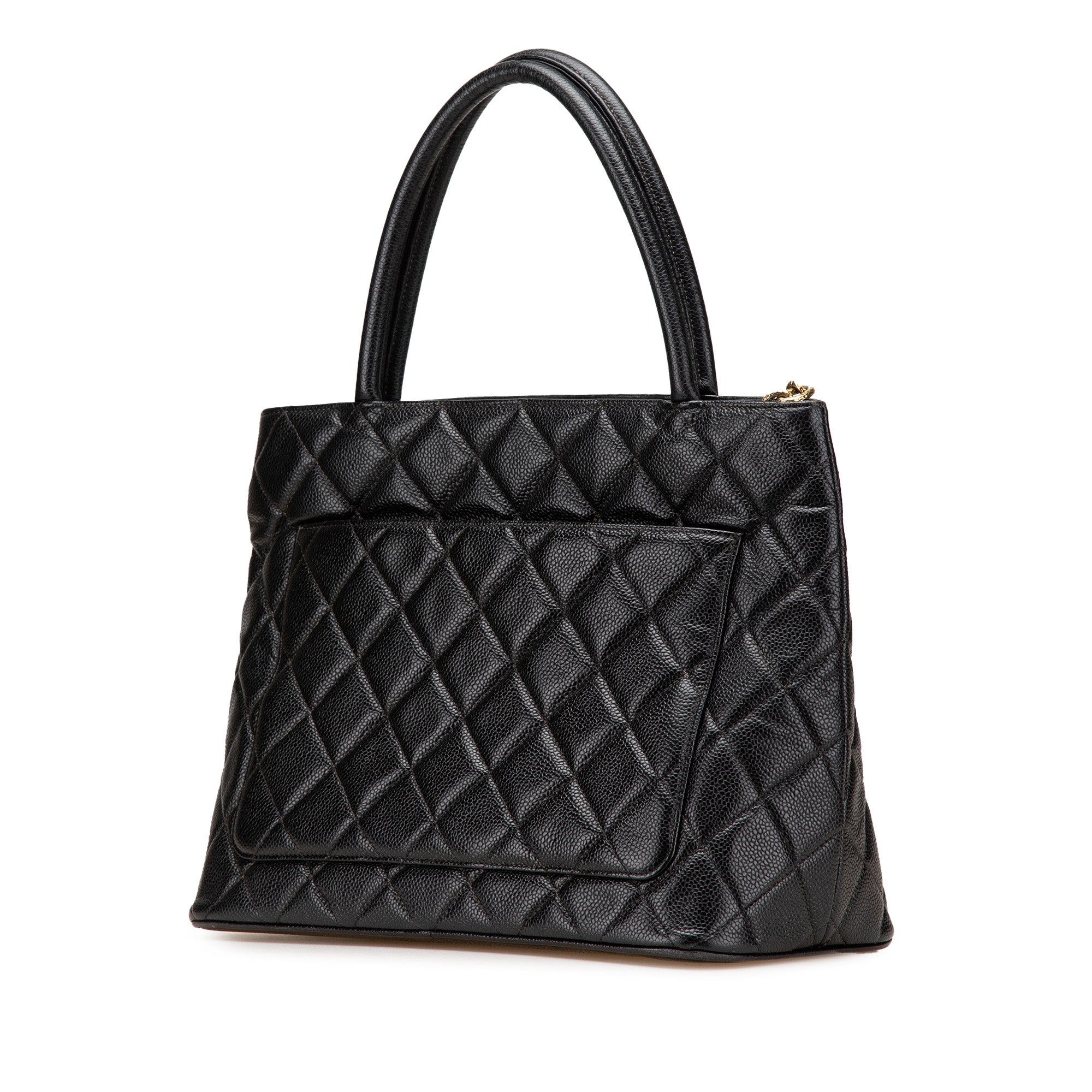 The Medallion tote bag features a quilted caviar leather body, rolled leather handles, a top zip closure, an exterior back slip pocket, and interior zip and slip pockets. Retail Price: 2400.00