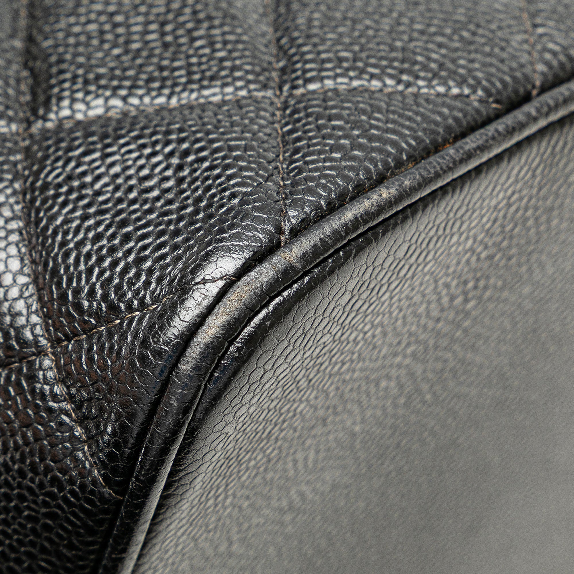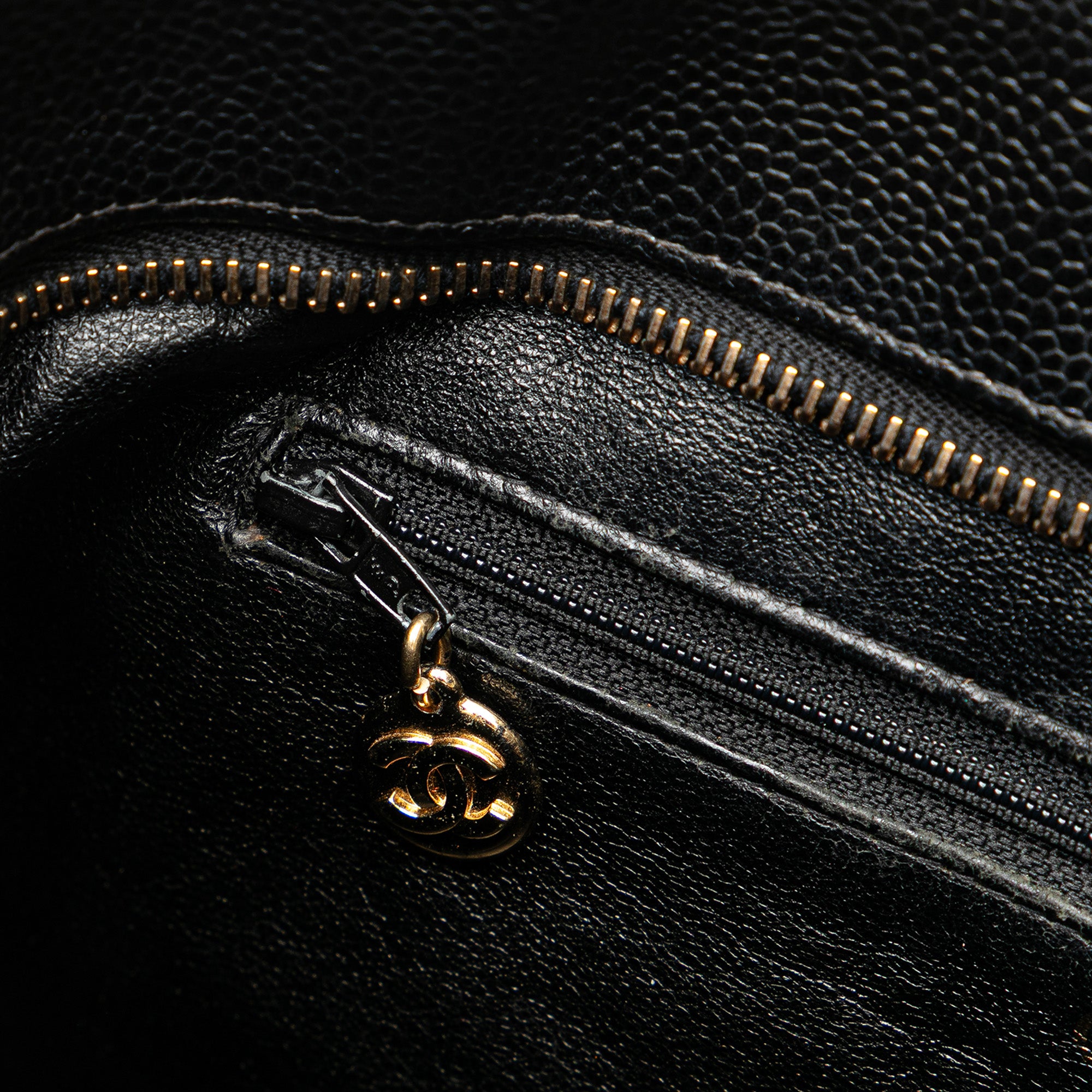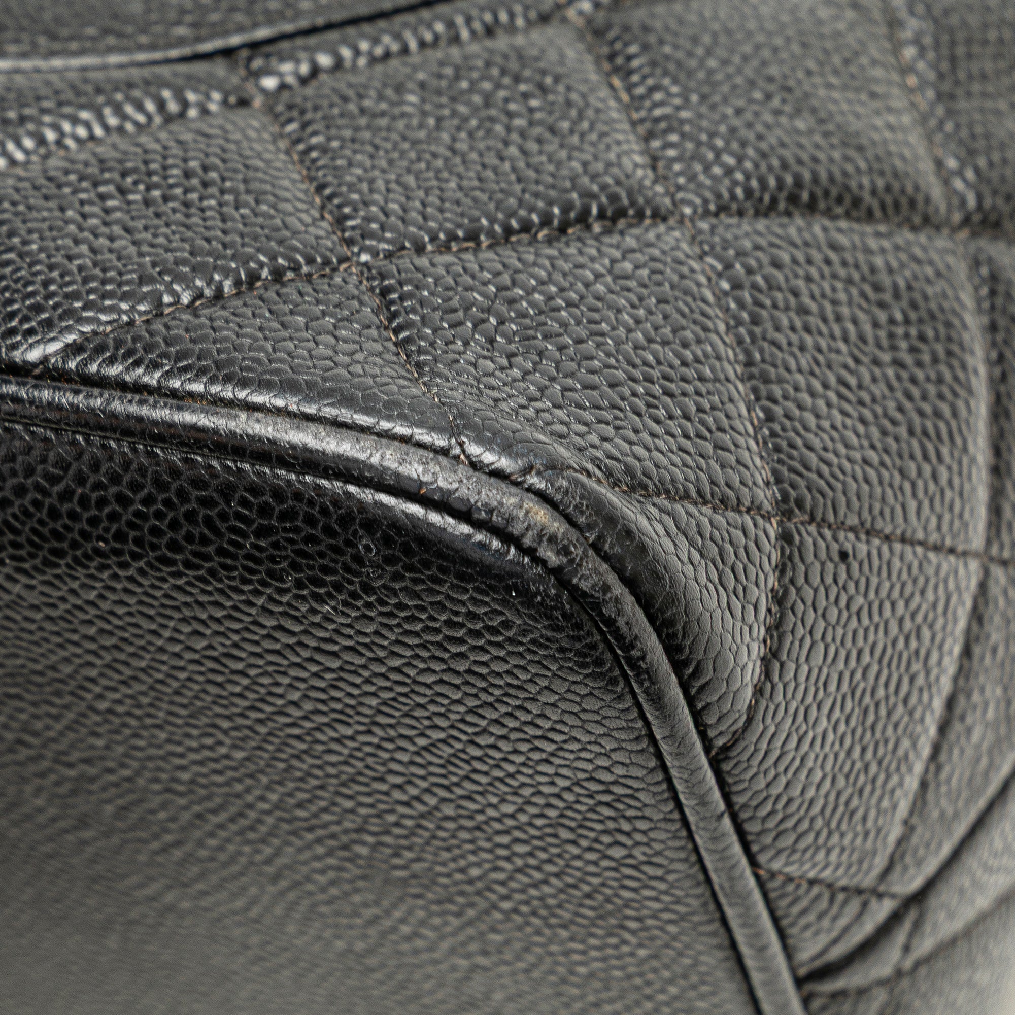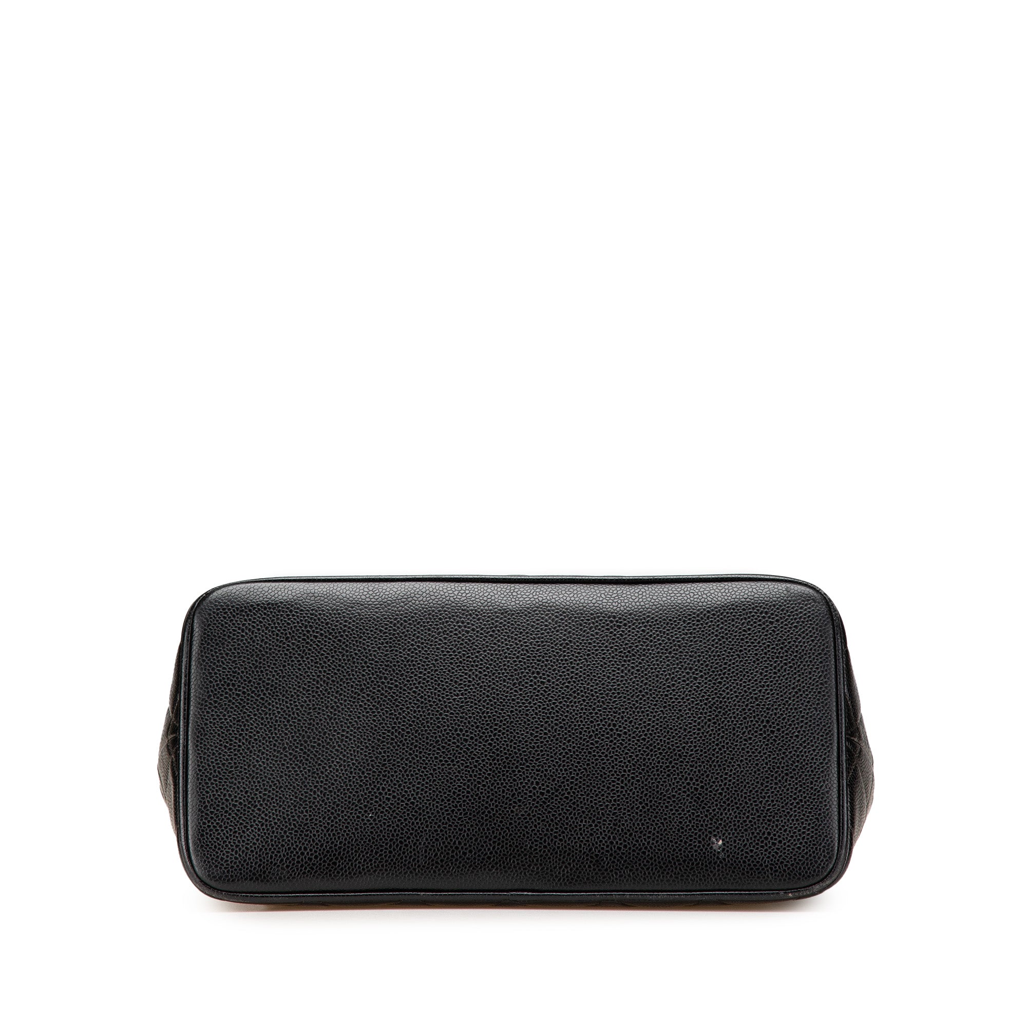The Medallion tote bag features a quilted caviar leather body, rolled leather handles, a top zip closure, an exterior back slip pocket, and interior zip and slip pockets. Retail Price: 2400.00