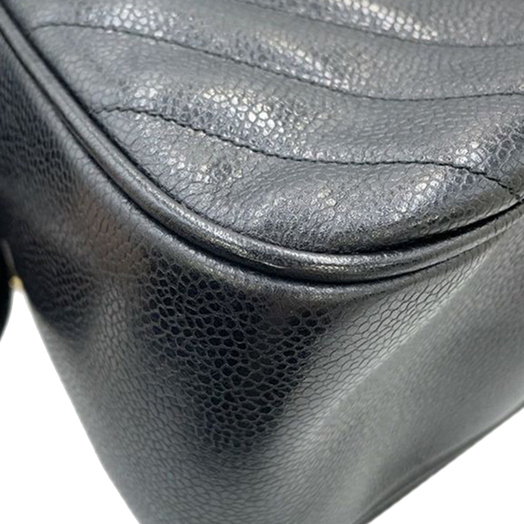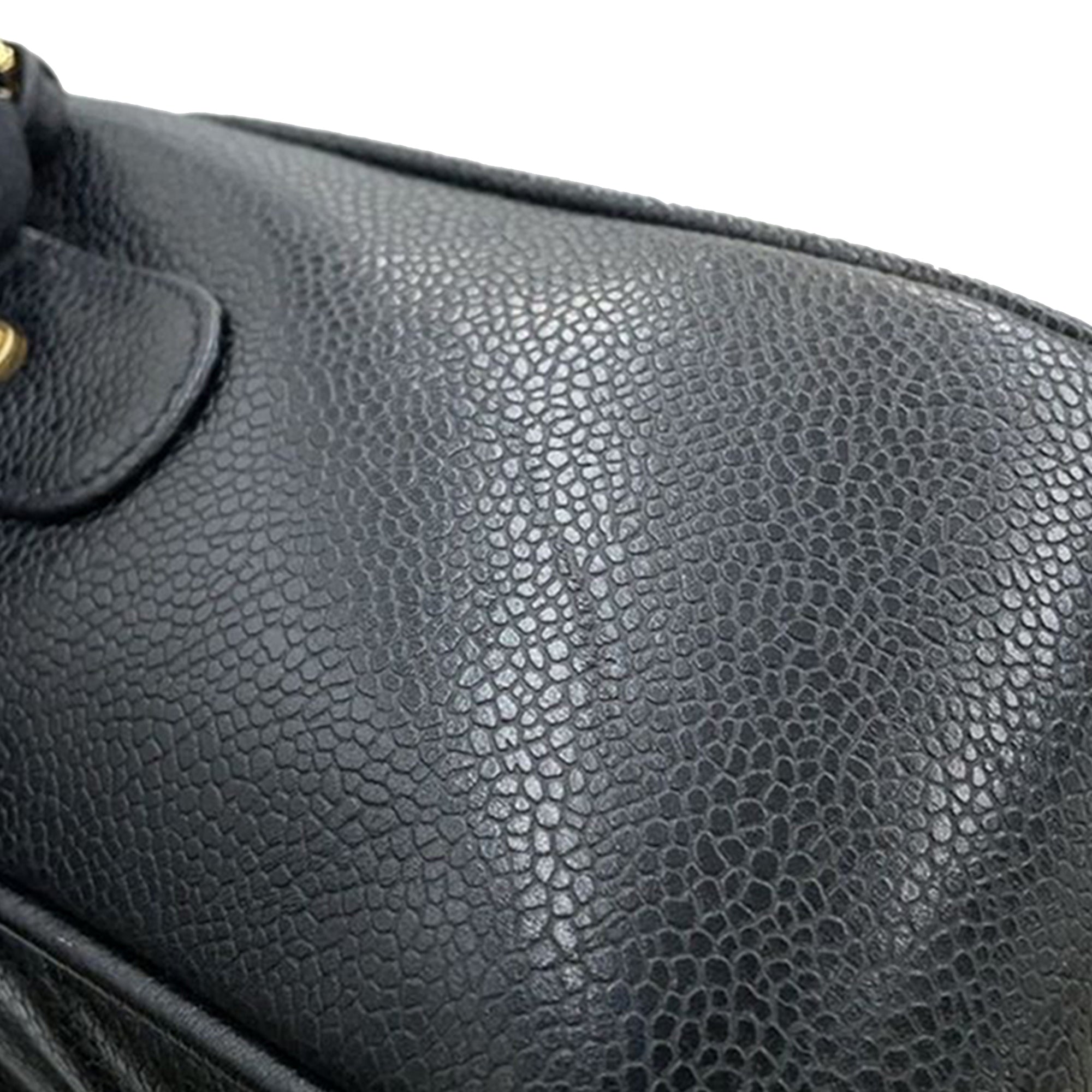 This crossbody features a quilted caviar leather body, a leather woven chain strap with leather guard, a zip around closure, and interior zip pockets. Inclusion: Dust bag, authenticity card. Retail Price: 3500.00