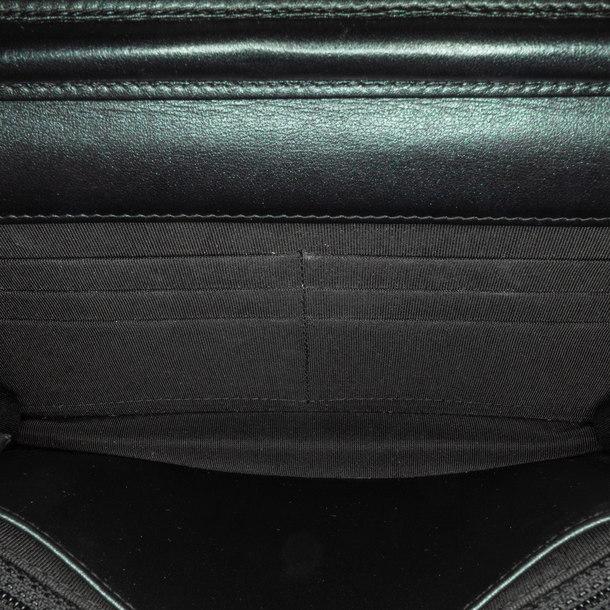 This wallet on chain features a crumpled quilted calf leather body, a leather woven chain link strap, a front flap with magnetic snap button closure, an interior zip compartment, and interior slip and zip pockets. Retail Price: 3550.00
