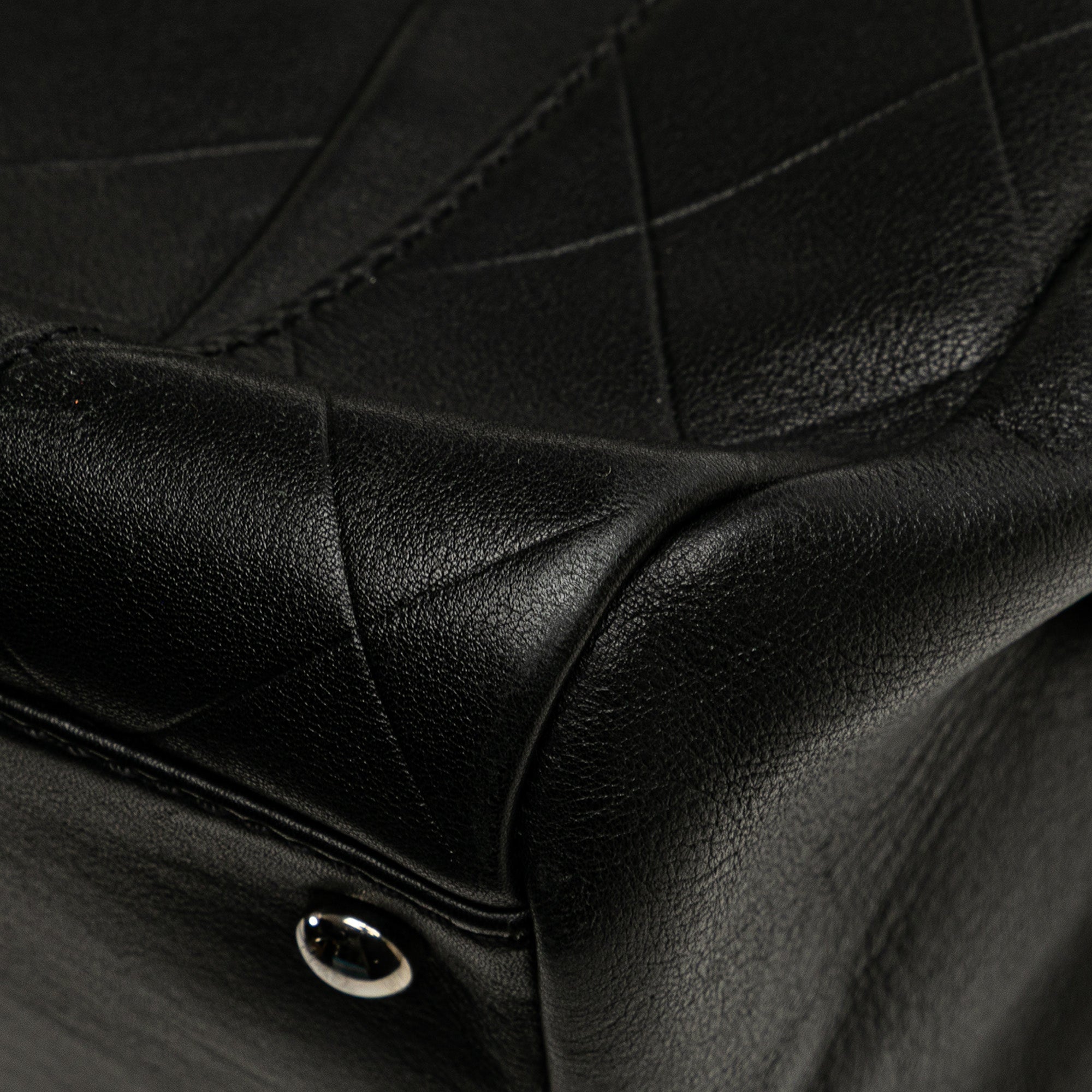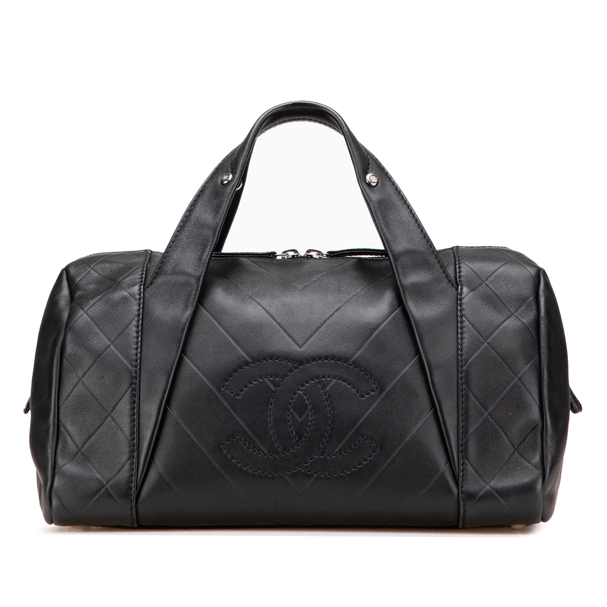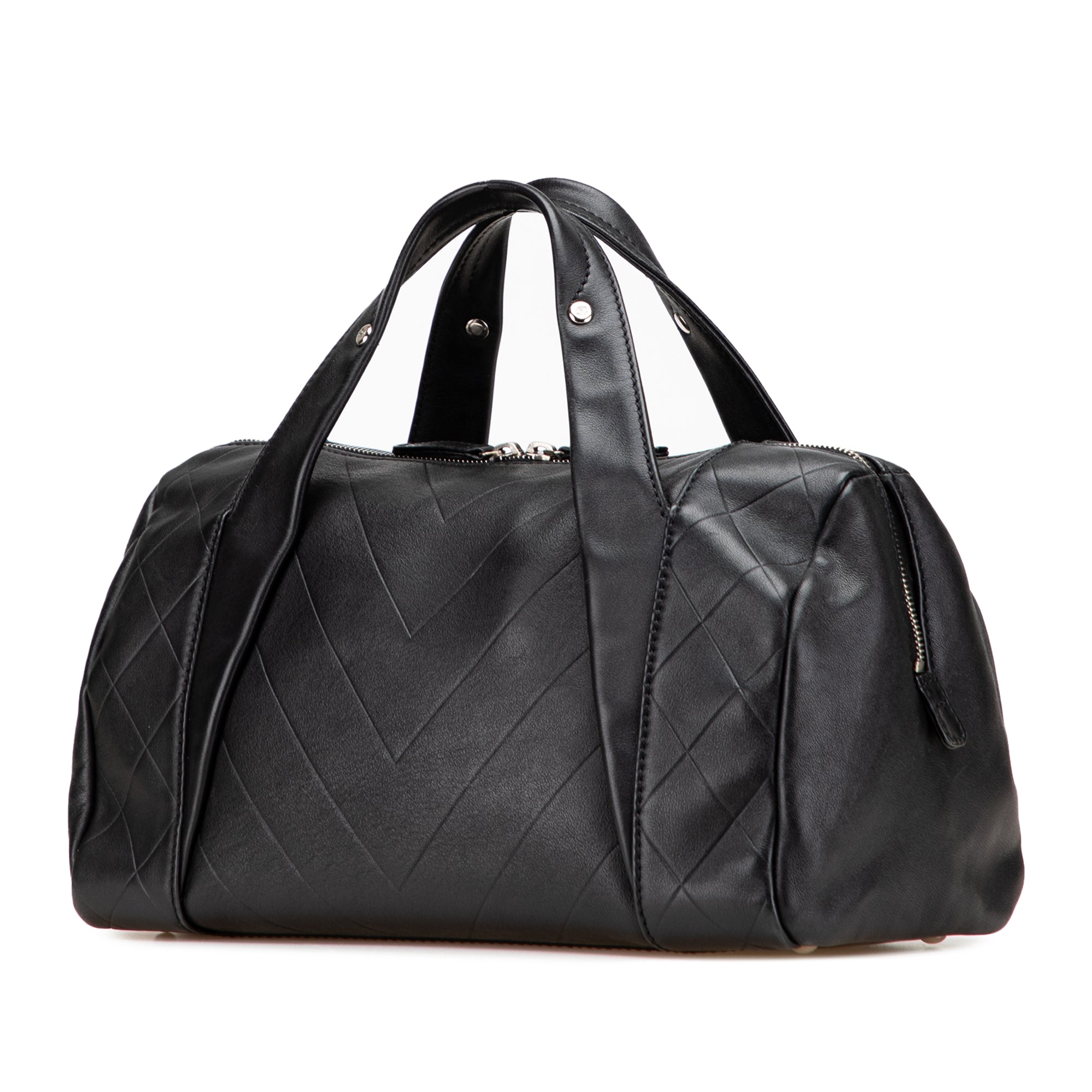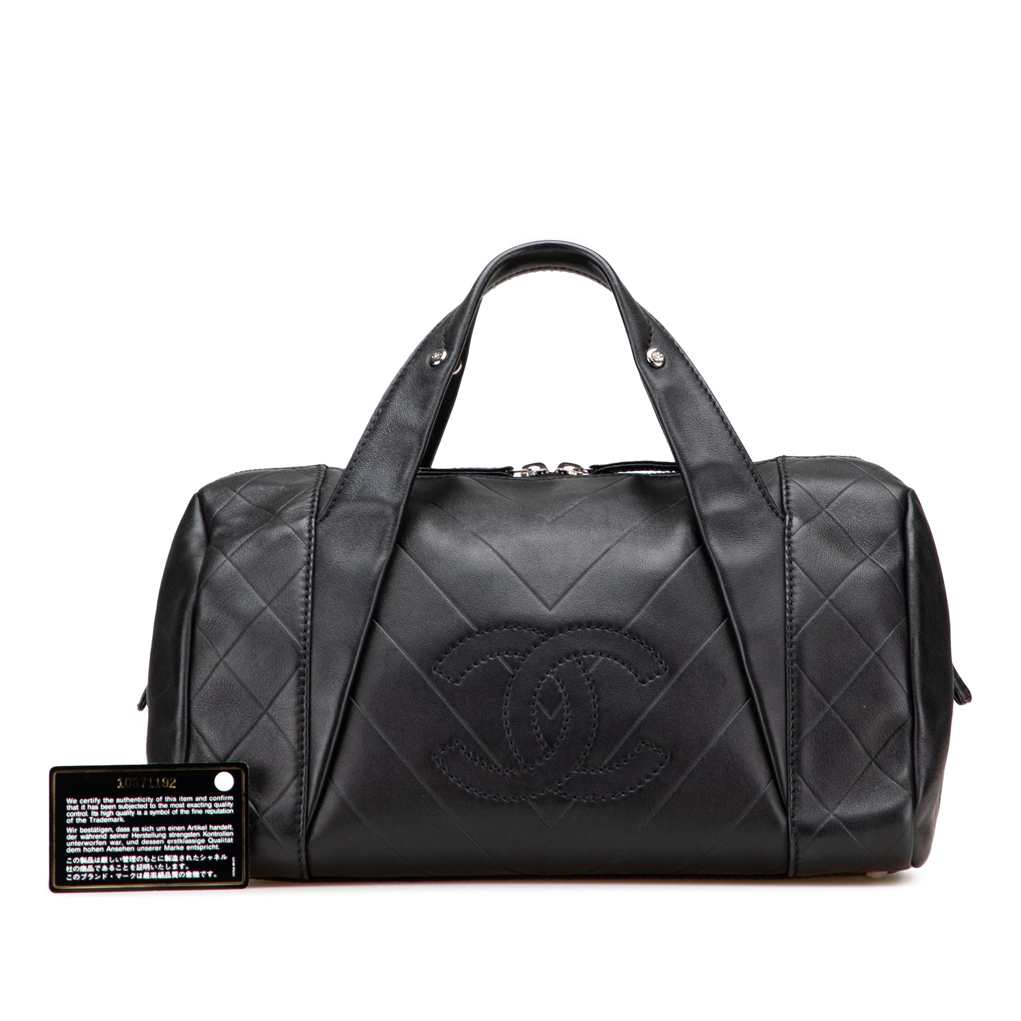 This boston bag features a quilted lambskin leather, flat leather straps with silver hardware, top zip closure, and interior zip and slip pockets. Inclusion: authenticity card. Retail Price: 2600.00
