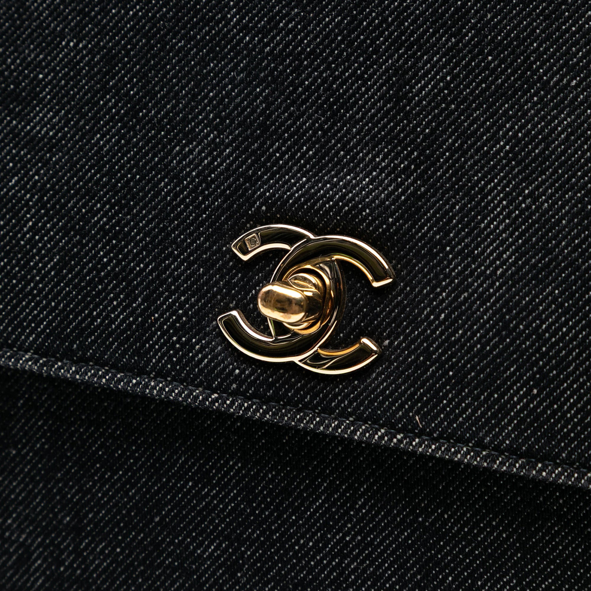 The Kelly handbag features a denim body, a rolled top handle, a top flap with CC turn lock closure, an exterior back slip pocket, and interior slip pocket. Retail Price: 4700.00