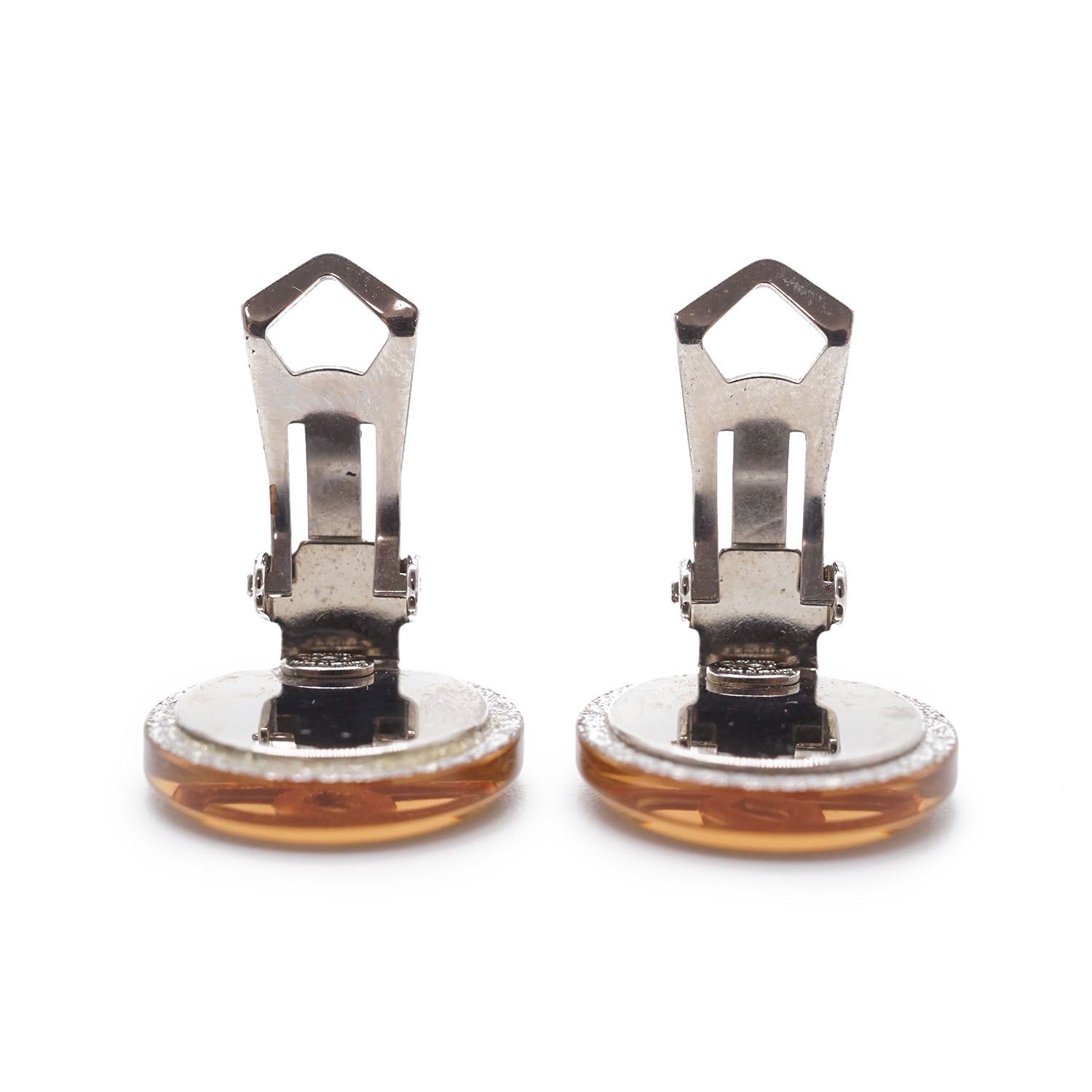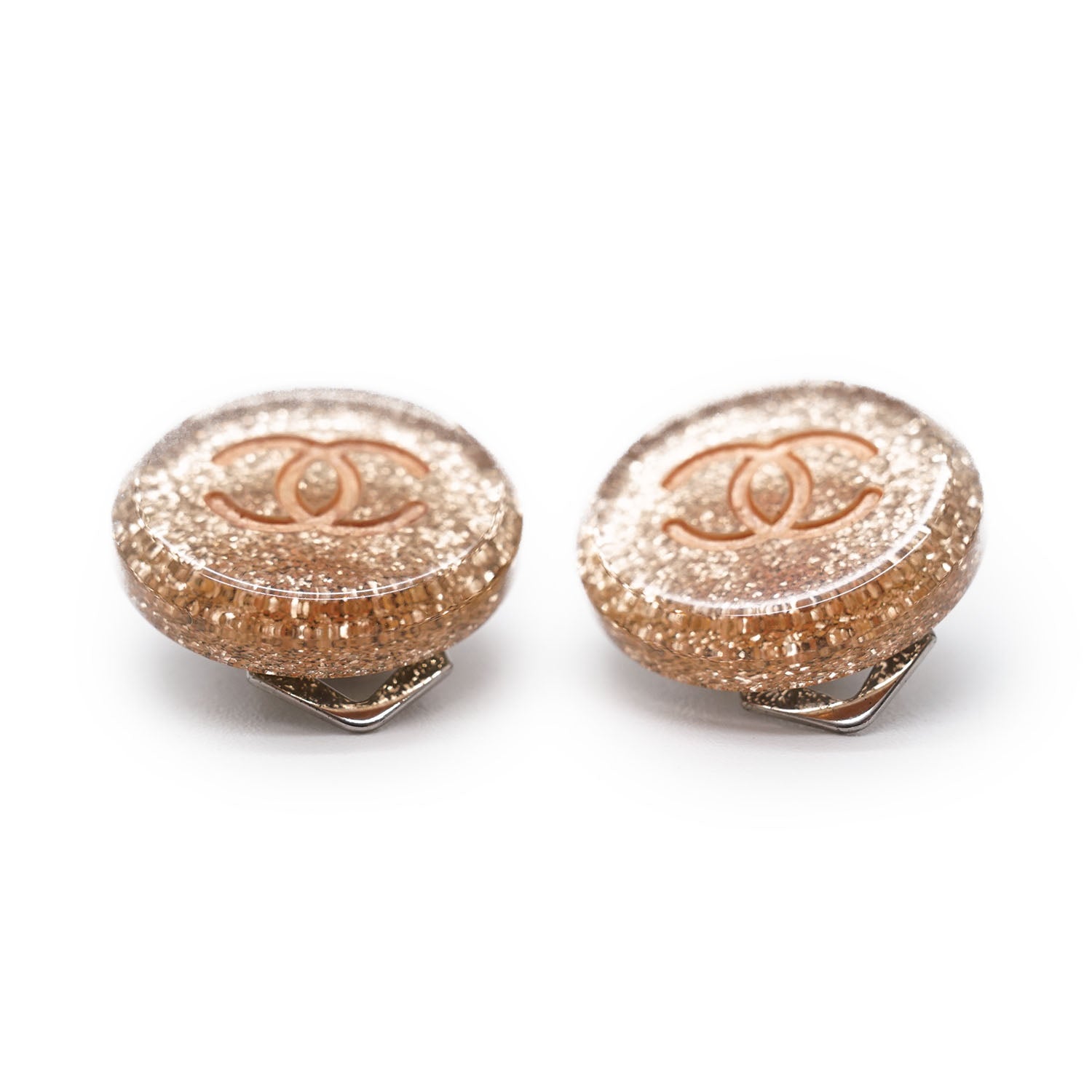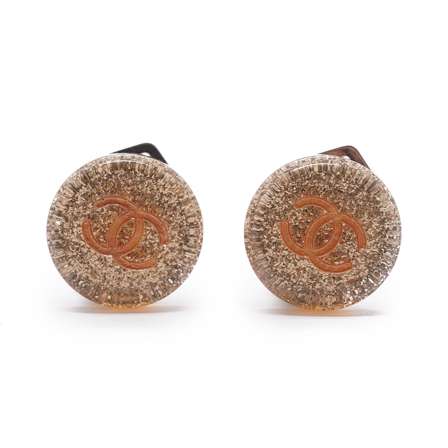 CC Logo Glitter Round Clip-On Earrings Champagne Brass, ResinDepth: 0.3cmHeight: 1.6cmWidth: 1.7cmDiscoloration: Slight tarnish on the back of both earringsScratch: Some scratches on the clasp of one earringSerial code: 00A