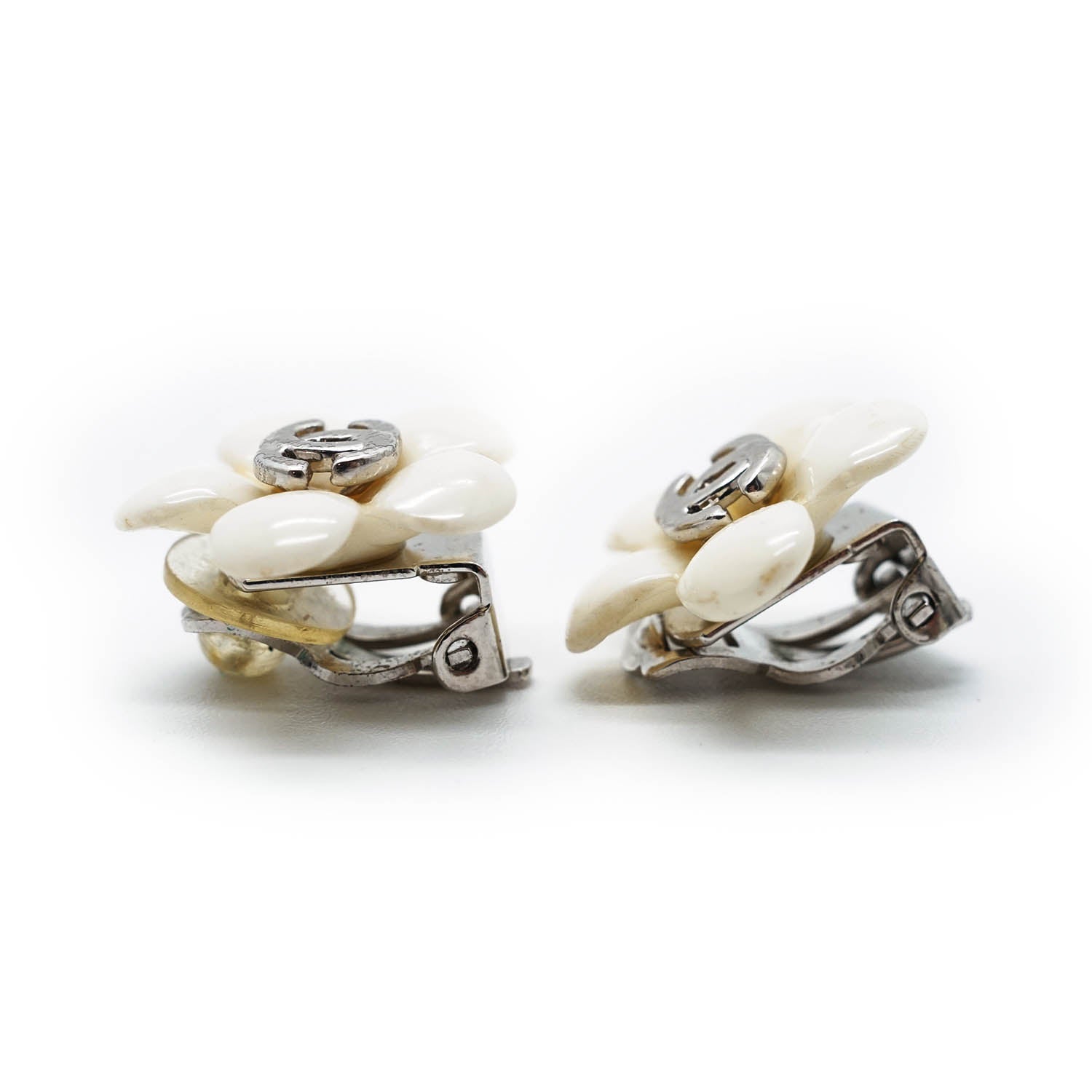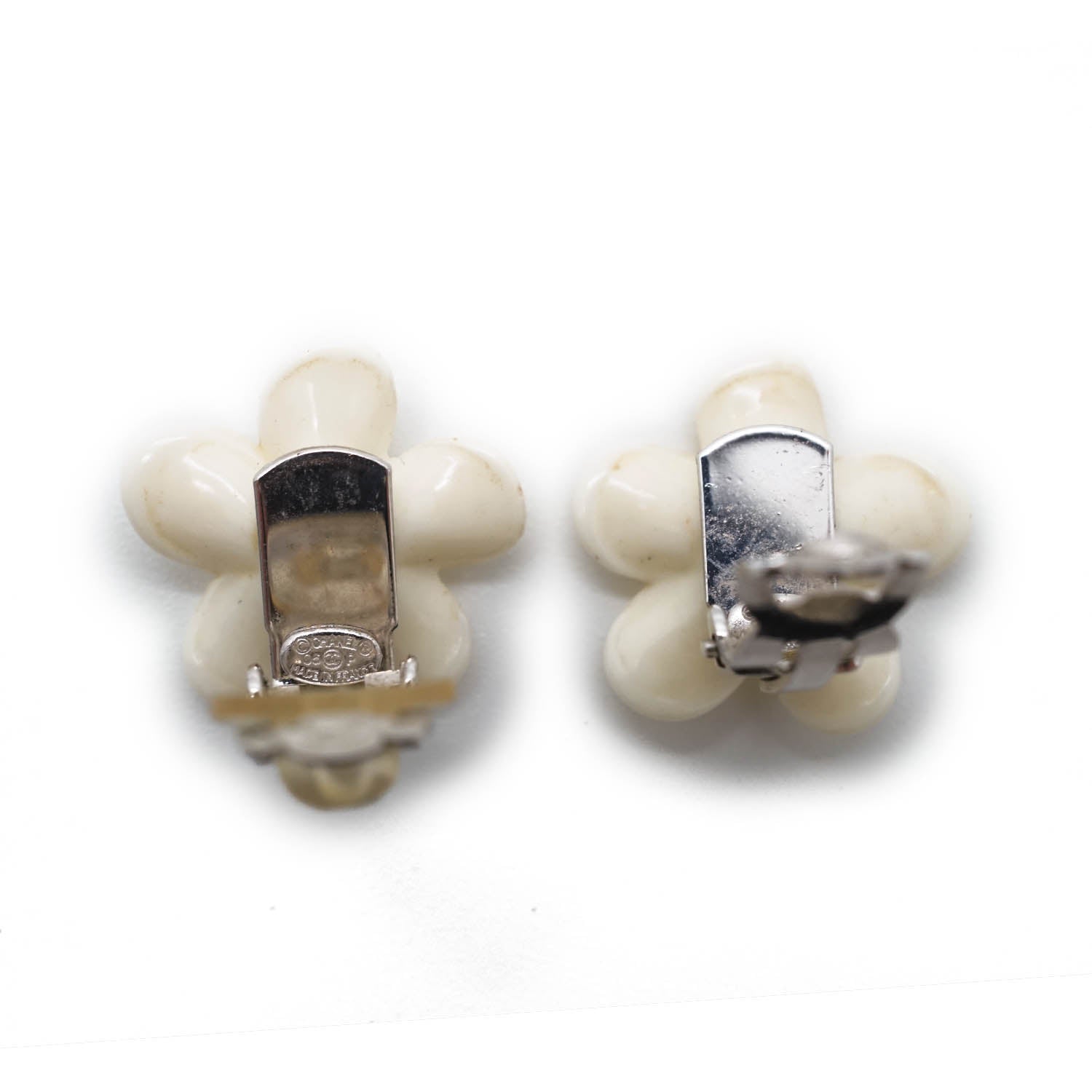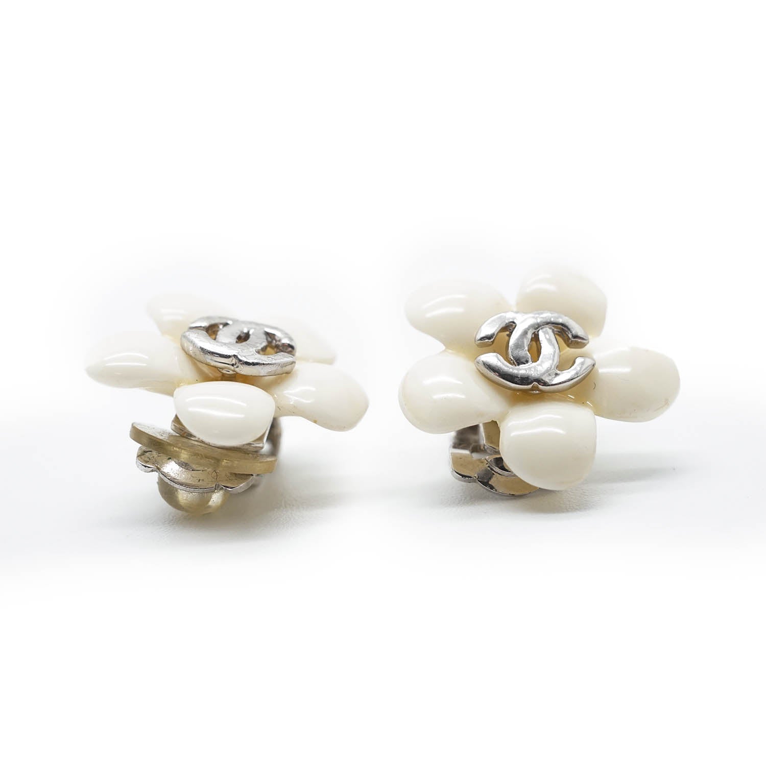CC Logo White Flowers Clip Earrings White MetalDepth: 0.4cmHeight: 1.7cmWidth: 1.7cmStain: Minor stains/discoloration on the back of both earringsDiscoloration: Some metal tarnishingMissing: Earring pad missing on the clasp of one of the earringsComments: The clasp missing the earring pad is slightly looseSerial code: 05P