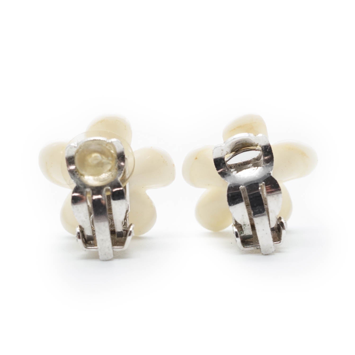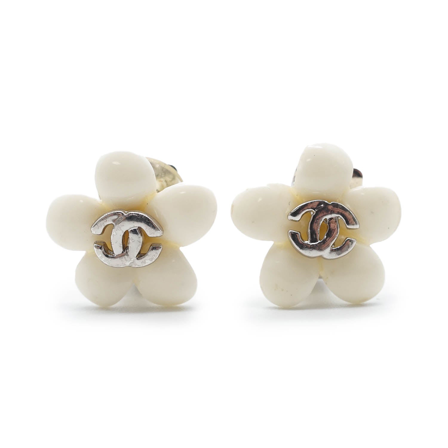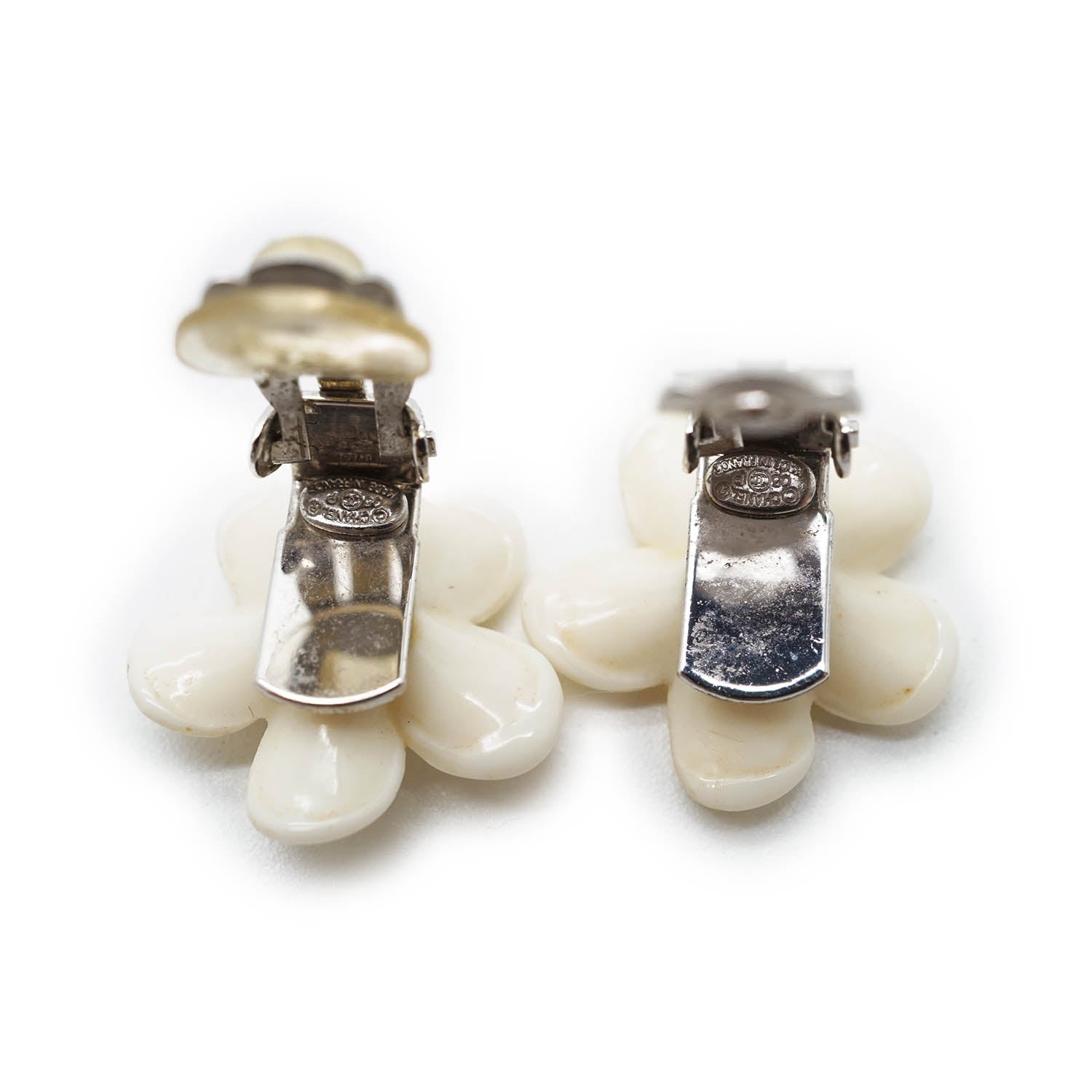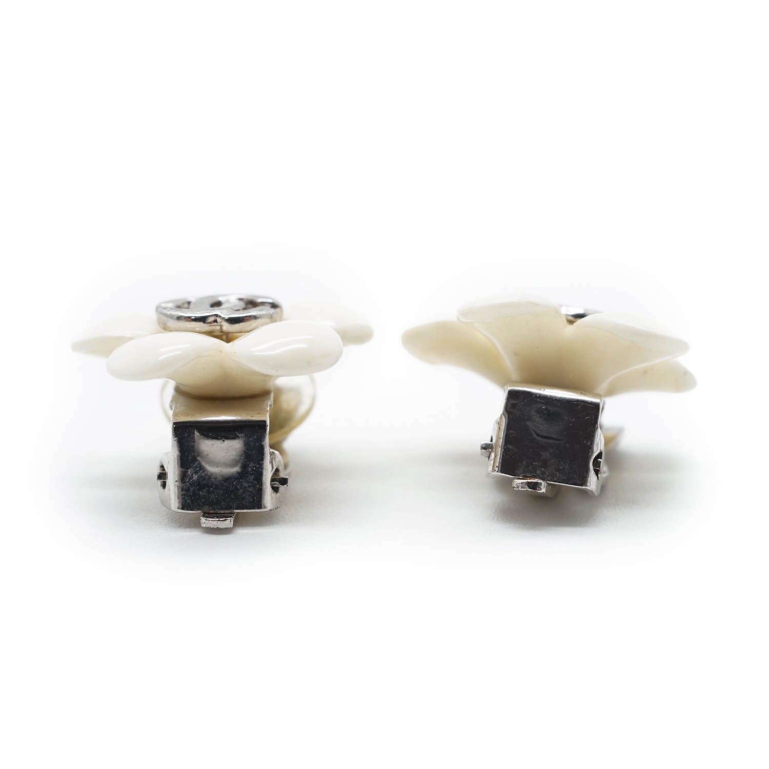 CC Logo White Flowers Clip Earrings White MetalDepth: 0.4cmHeight: 1.7cmWidth: 1.7cmStain: Minor stains/discoloration on the back of both earringsDiscoloration: Some metal tarnishingMissing: Earring pad missing on the clasp of one of the earringsComments: The clasp missing the earring pad is slightly looseSerial code: 05P