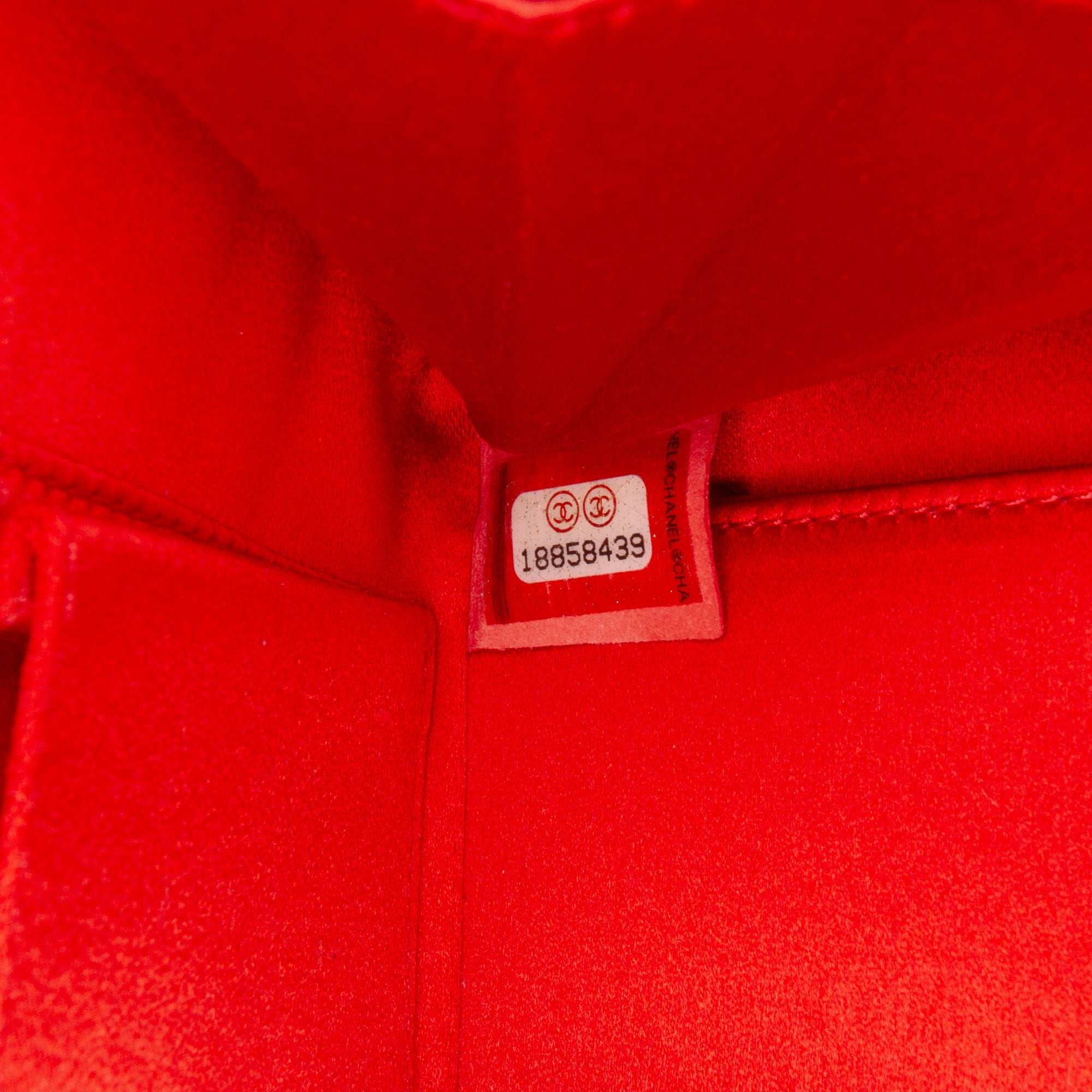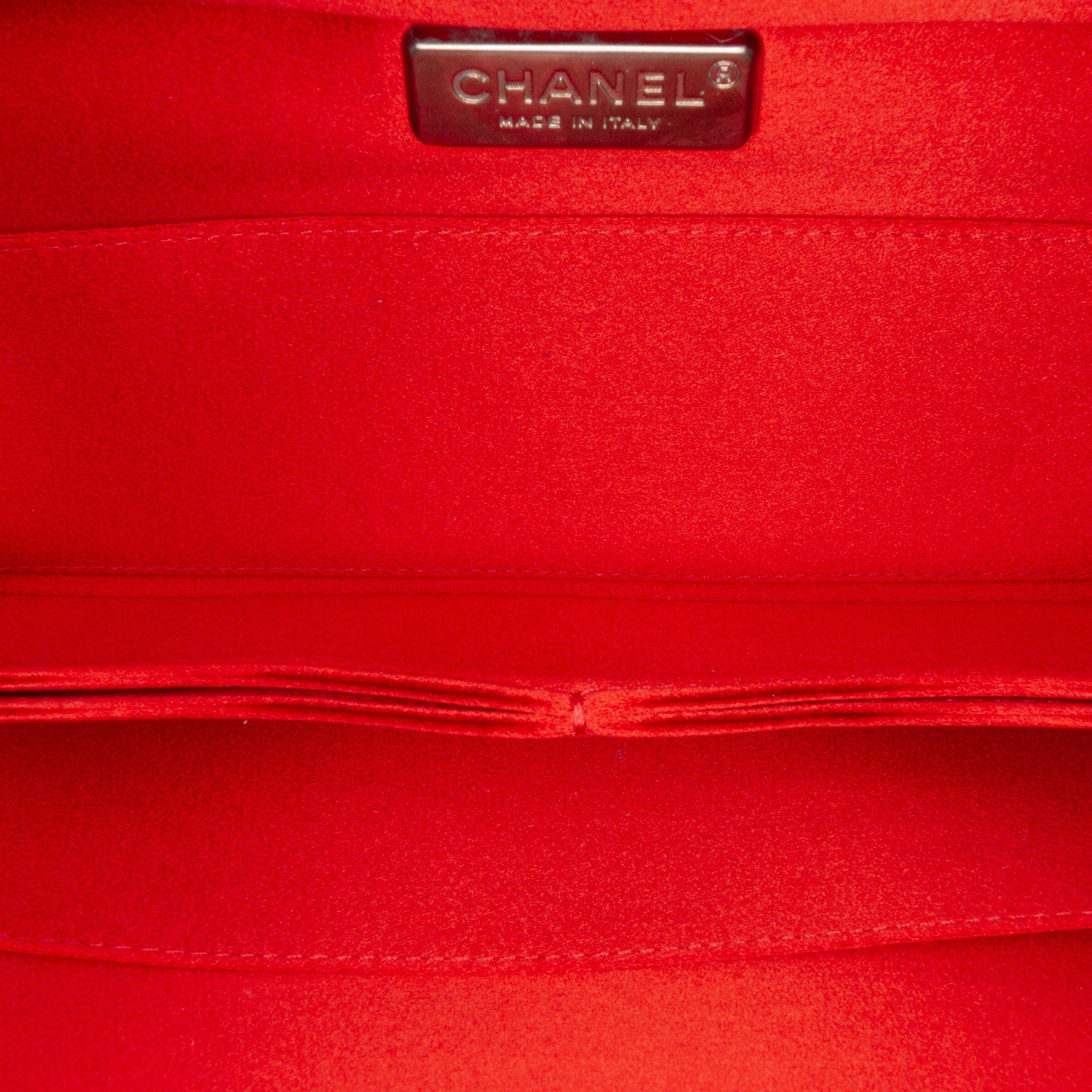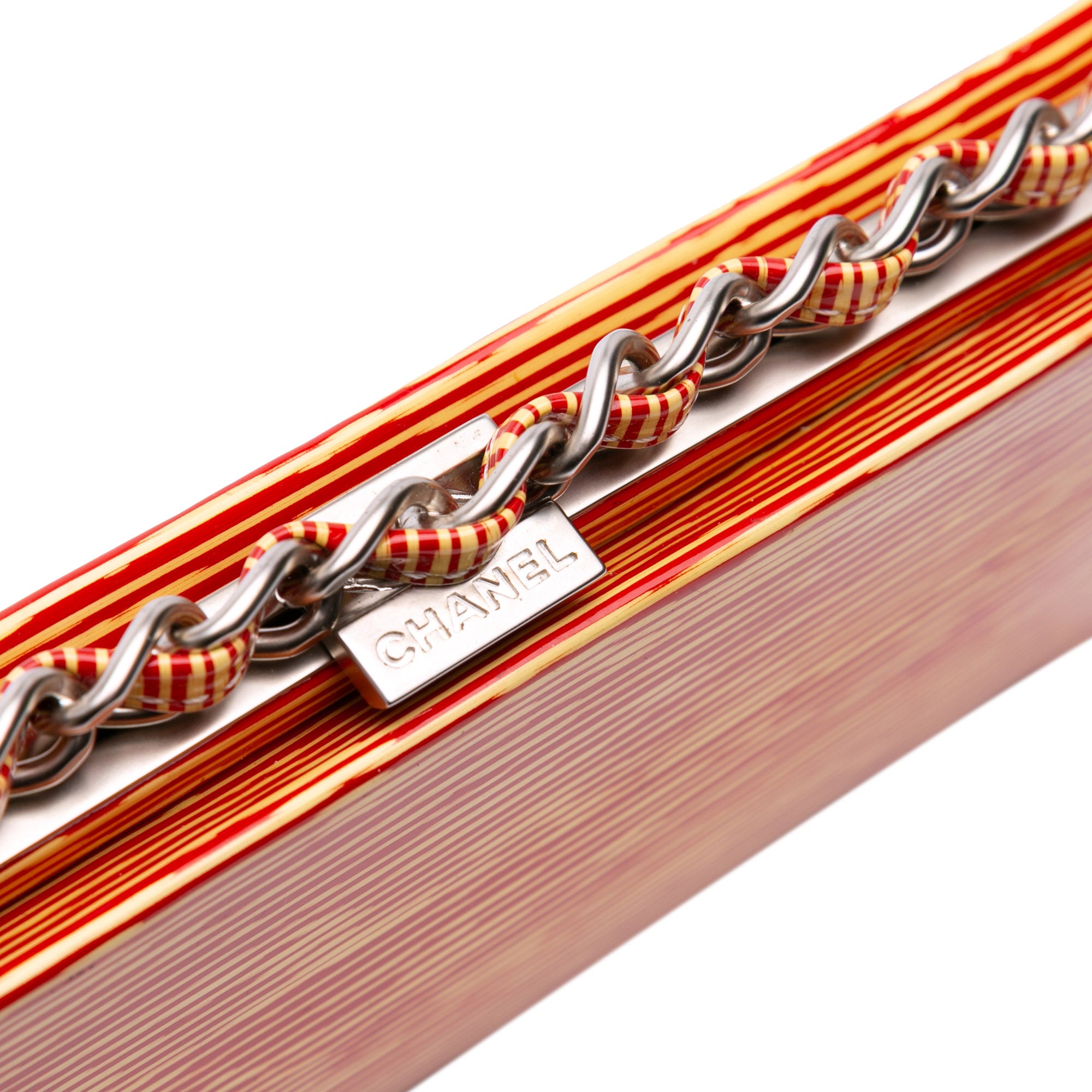 This clutch bag features a patent leather body with chain details, a top metal clasp closure, and interior slip pockets. Retail Price: 3000.00