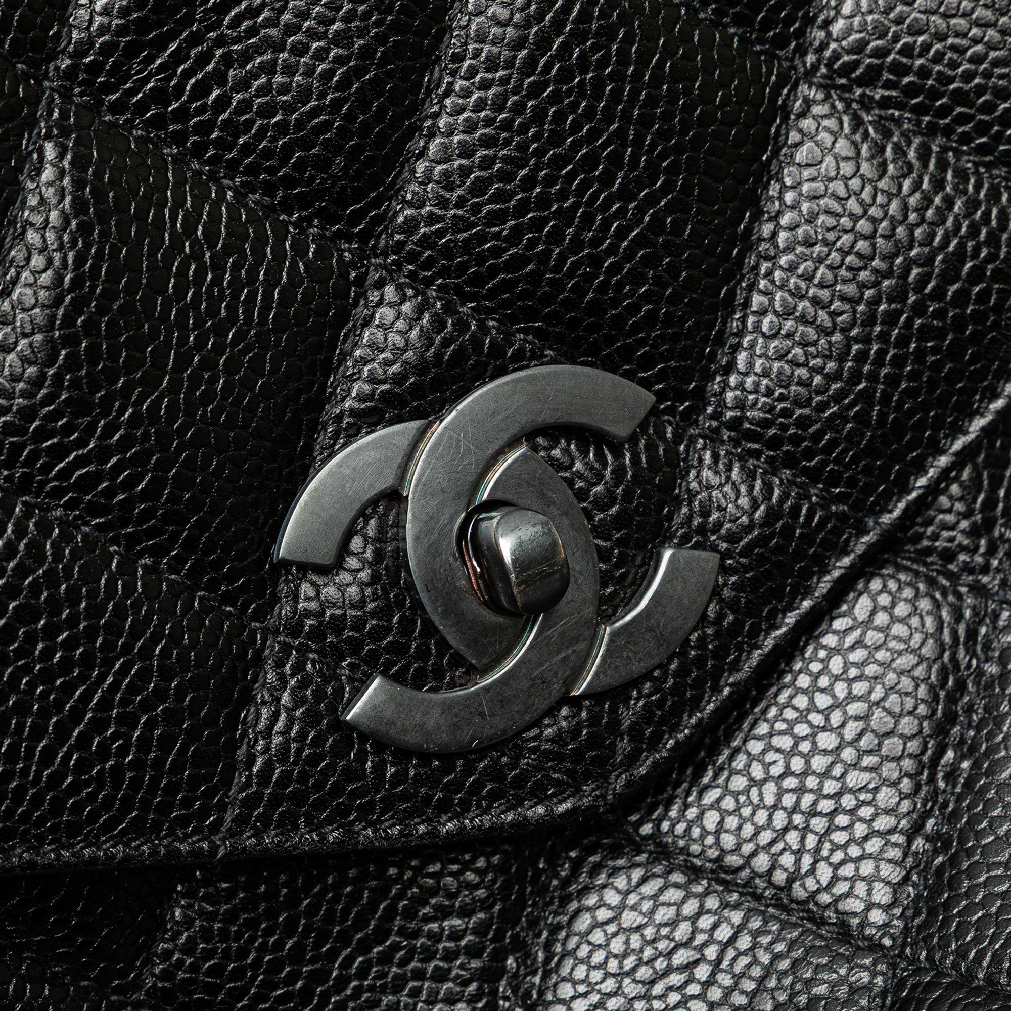 This shoulder bag features a caviar leather body, leather woven chain link straps with leather guard, a top zip closure, an exterior front flap pocket with interlocking Cs and twist lock closure, and interior zip pockets. Inclusion: authenticity card. Retail Price: 2400.00