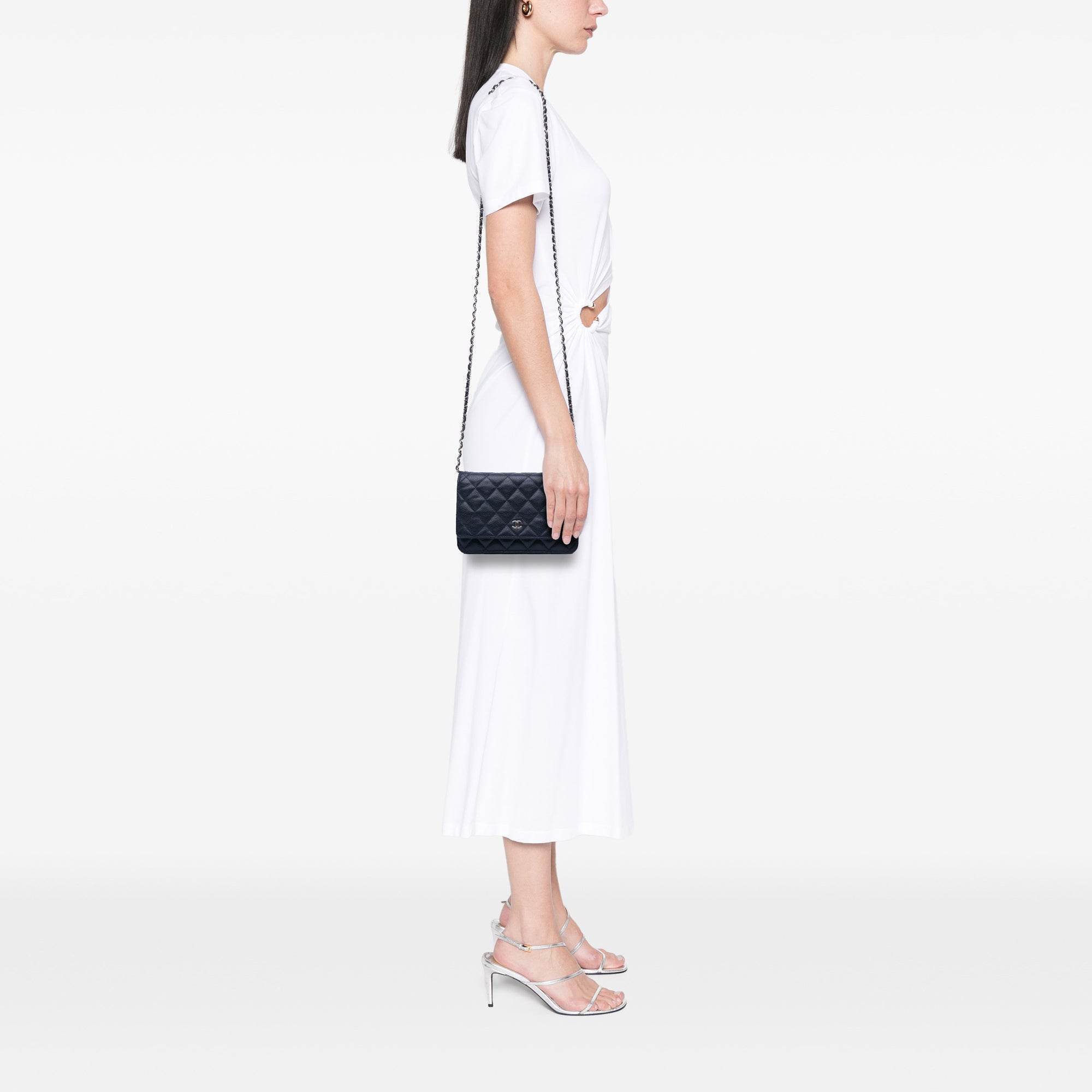 This wallet on chain features a quilted caviar leather body, a silver-tone woven chain link shoulder strap, a front flap with magnetic snap closure, an interior zip compartment, and interior slip pockets. Inclusion: authenticity card. Retail Price: 3580.00