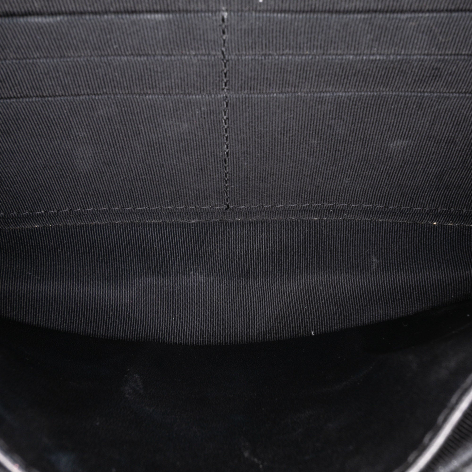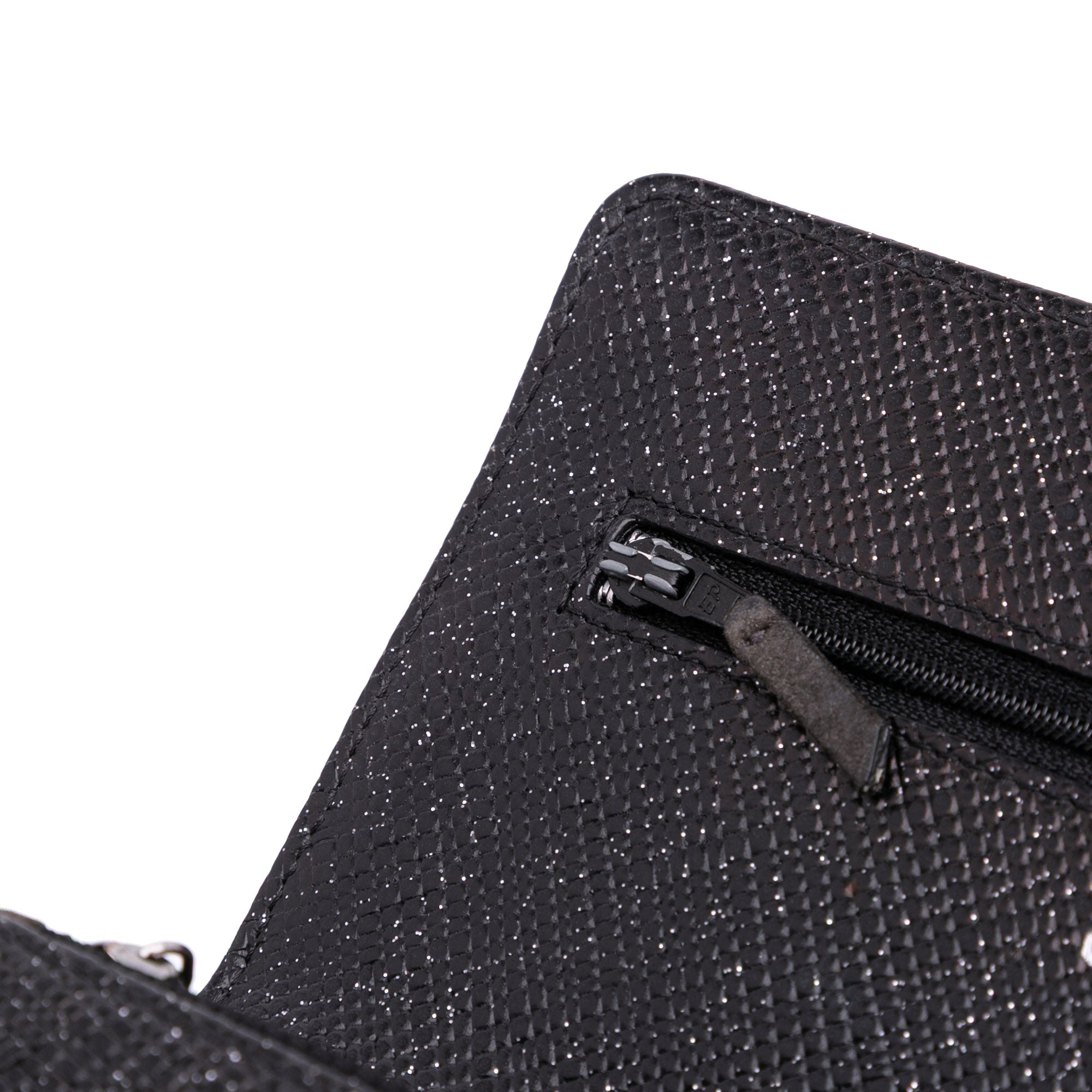 This wallet on chain features a quilted glittered calfskin leather body, a leather woven chain link shoulder strap, a flap with magnetic snap closure, and interior zip and slip pockets. Retail Price: 2500.00