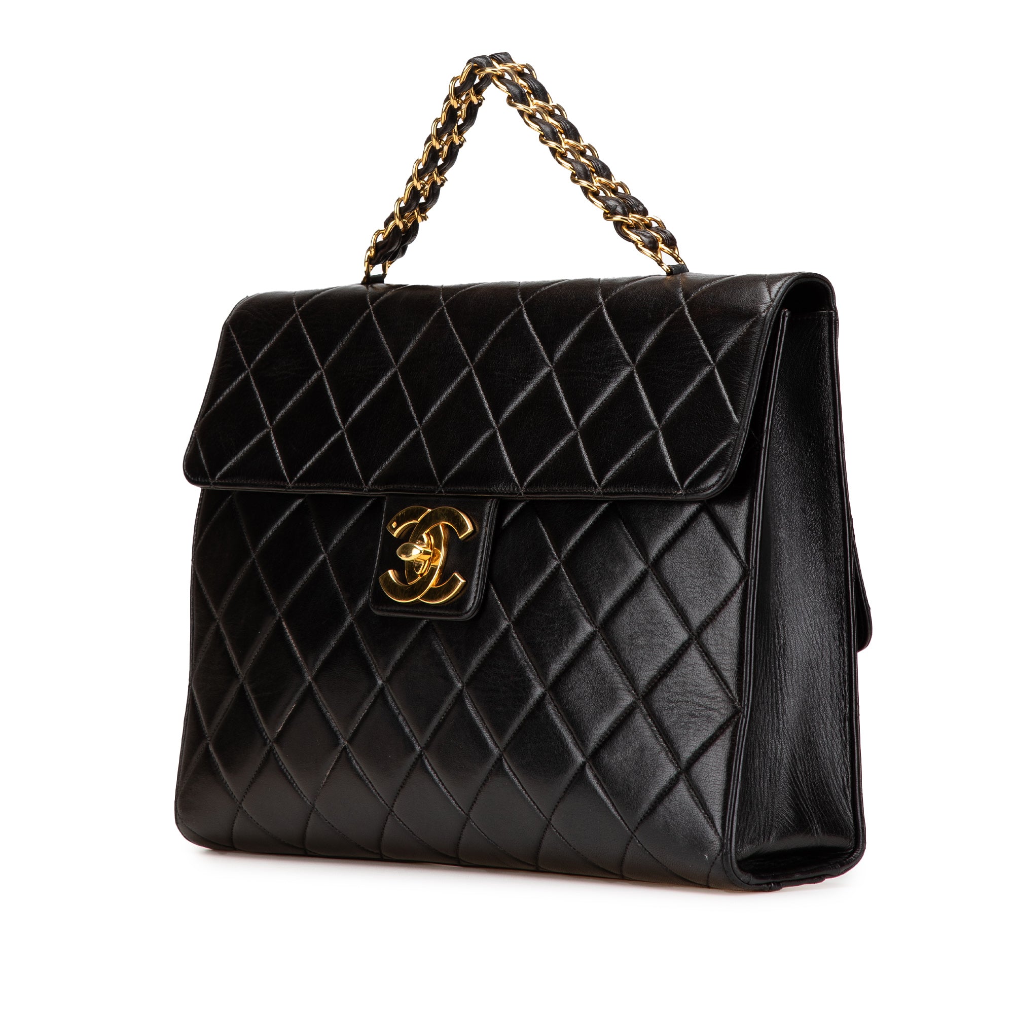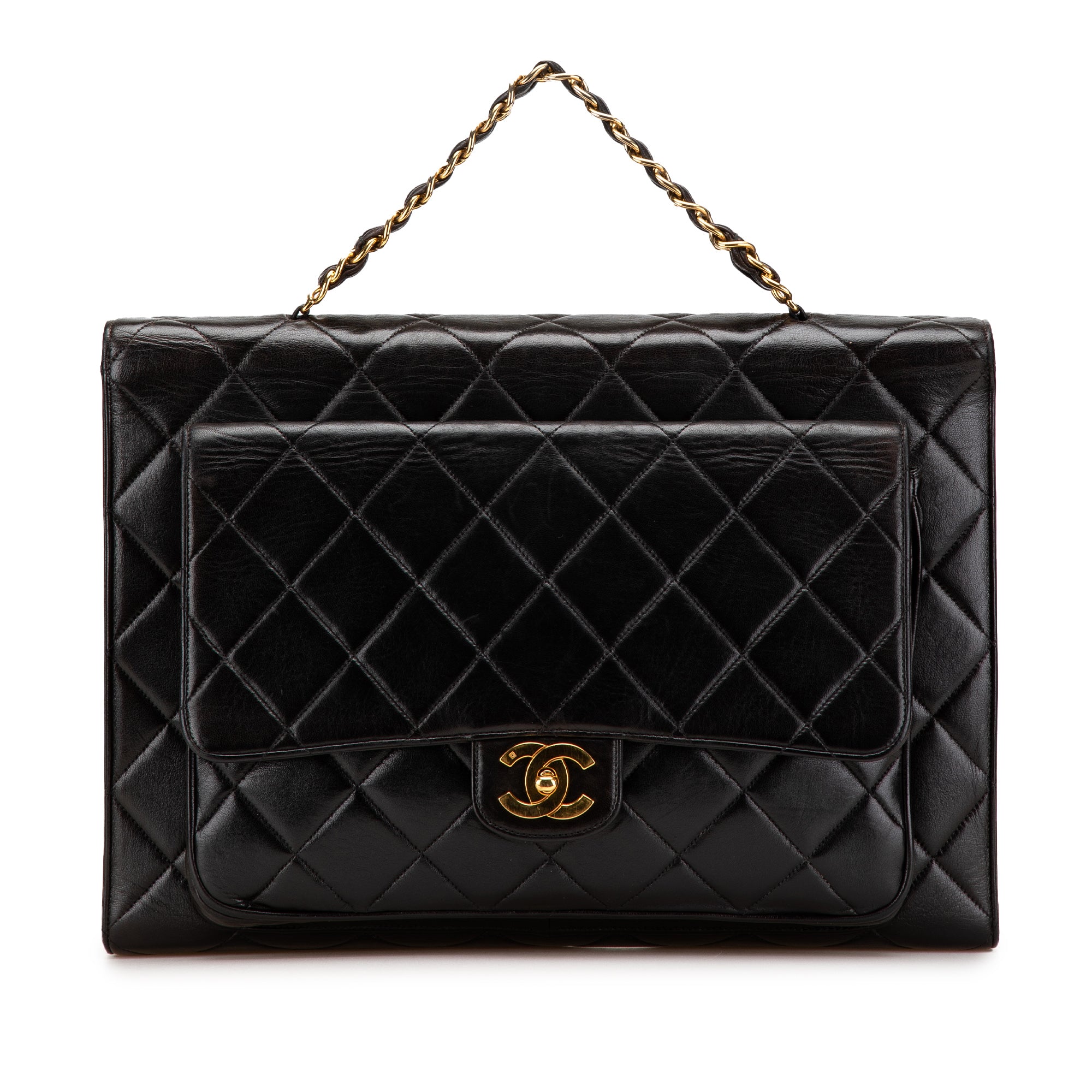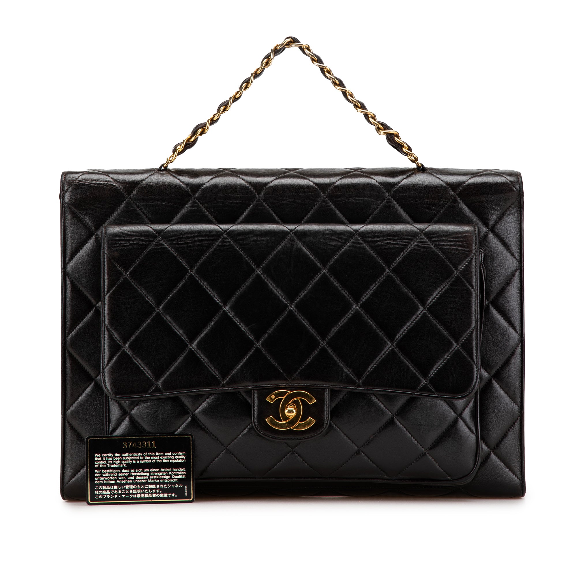 This business bag features a quilted lambskin leather body, leather-woven chain handles, double sided flaps with CC turn lock closure, and interior zip and slip pockets. Retail Price: 7344.00