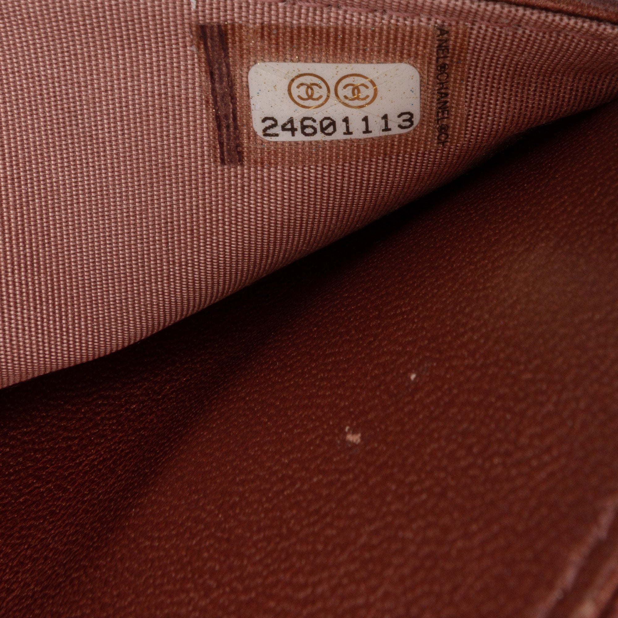 This wallet on chain features a quilted lambskin leather body, a leather woven chain shoulder strap, a front flap with enamel CC and magnetic closure, and interior zip and slip compartments. Retail Price: 3350.00