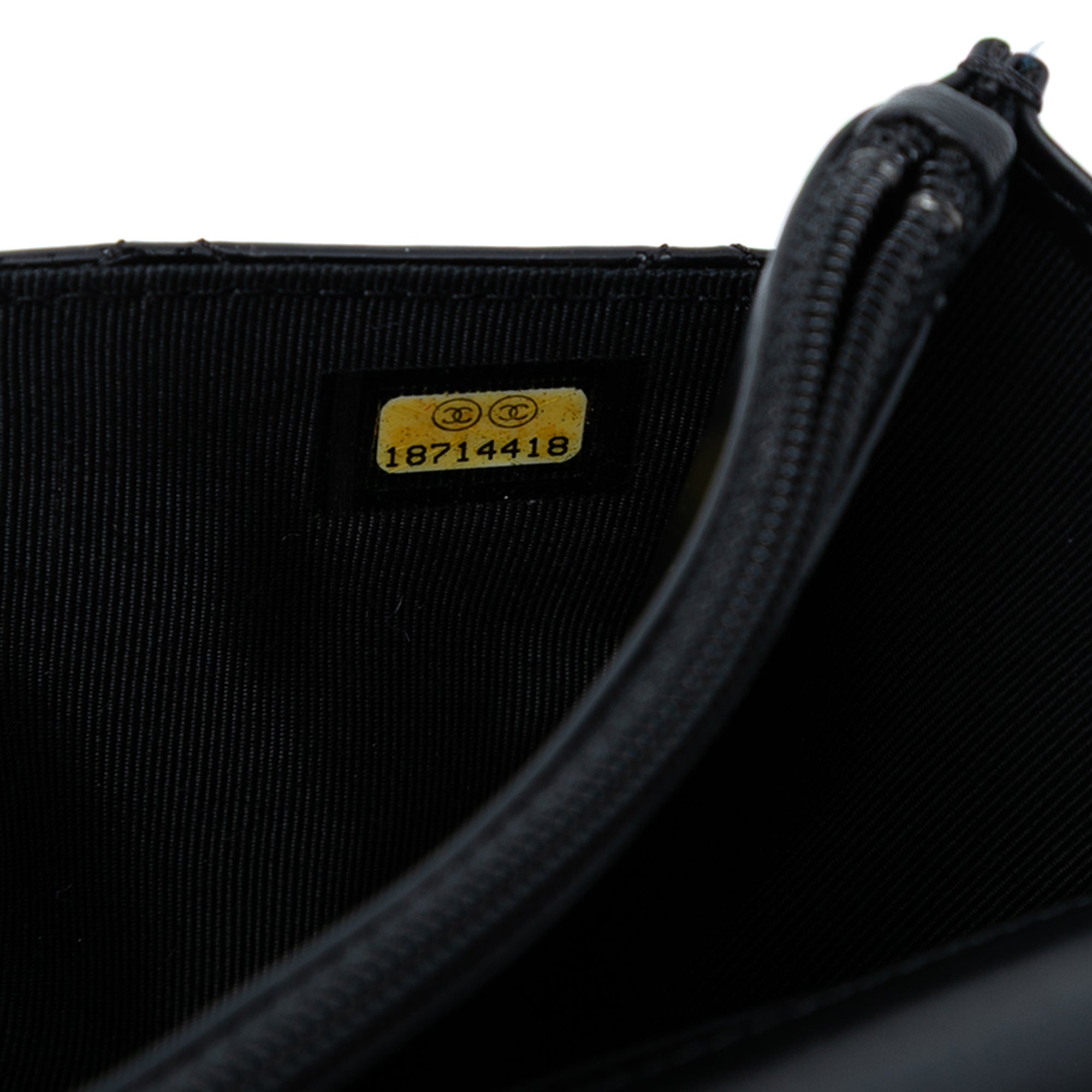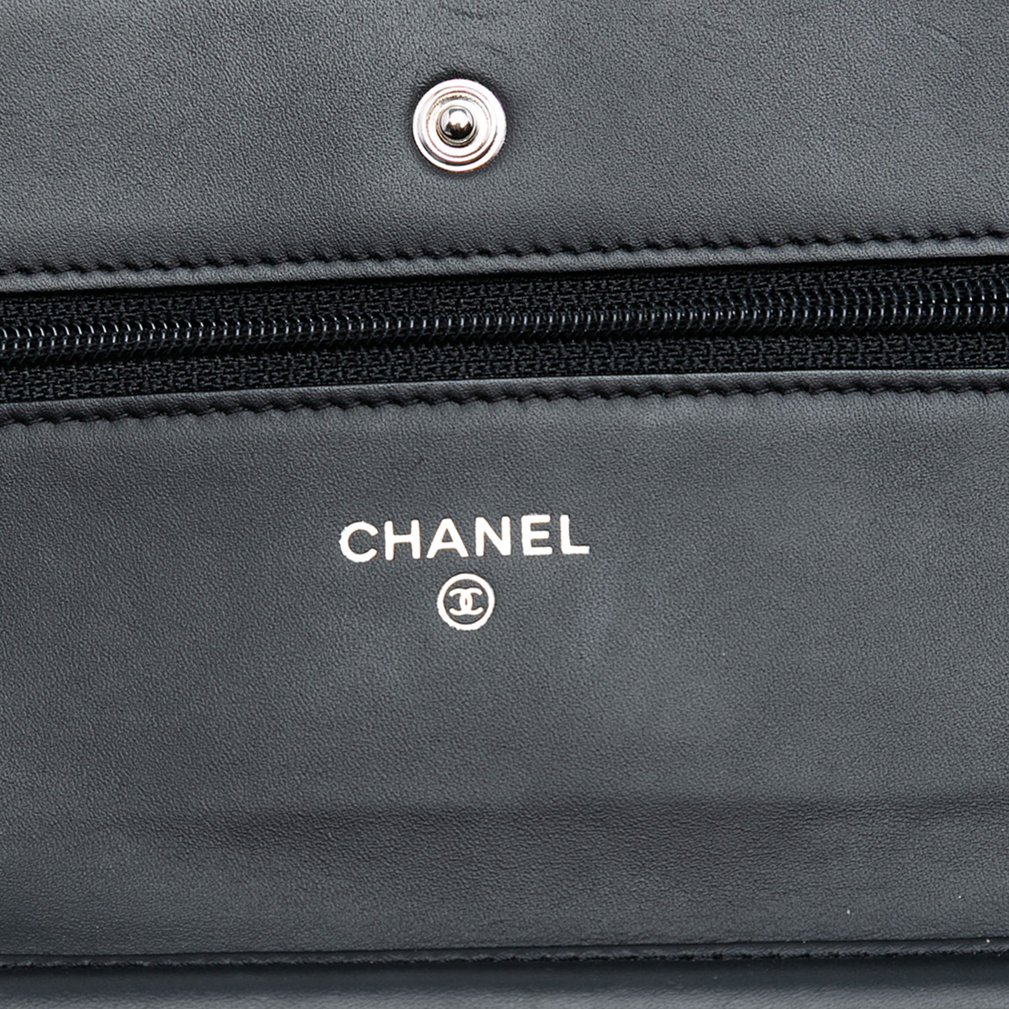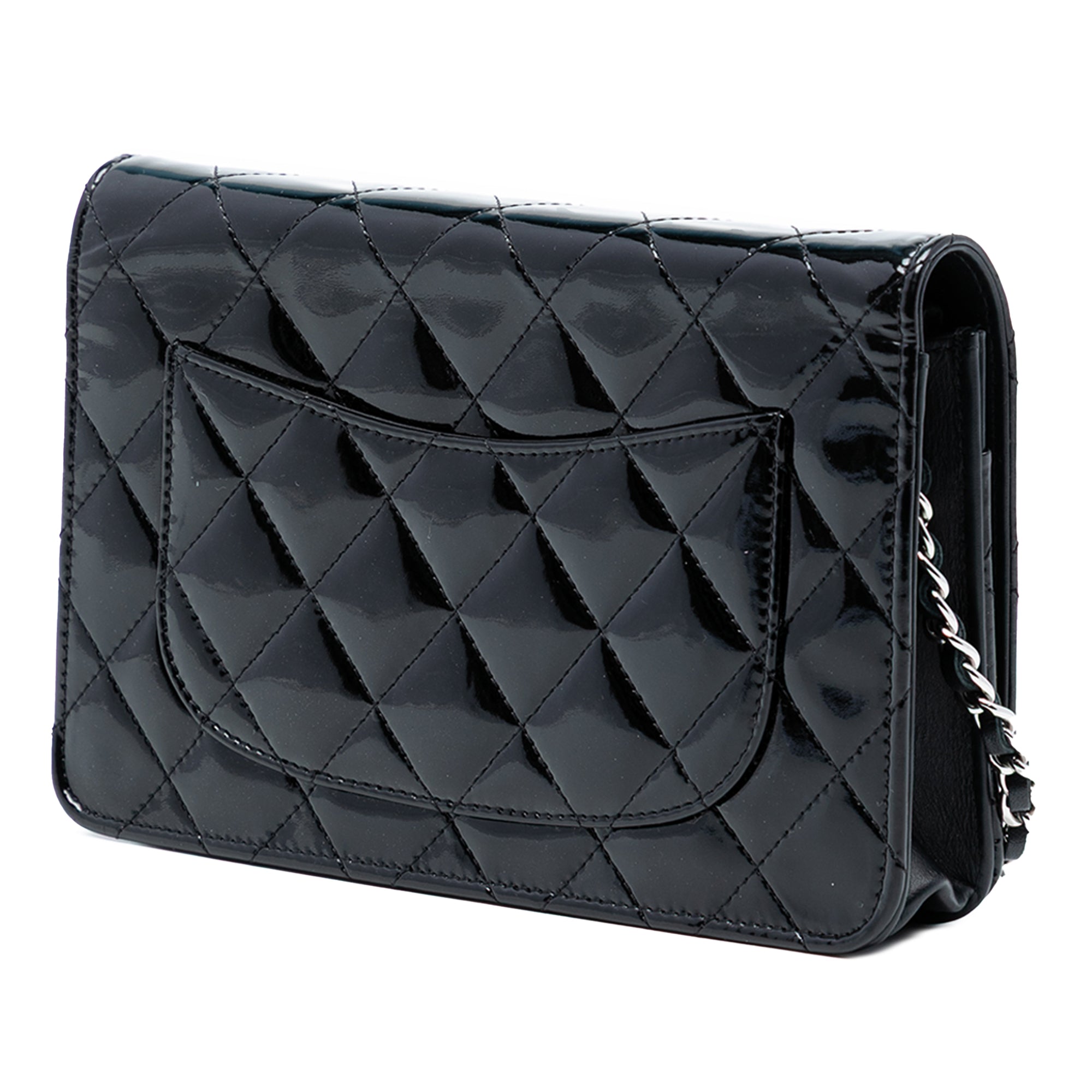 This wallet on chain features a quilted patent leather body, a leather woven chain link strap, a front flap with snap closure, an interior zip compartment, and interior zip and slip pockets. Inclusion: authenticity card. Retail Price: 2450.00