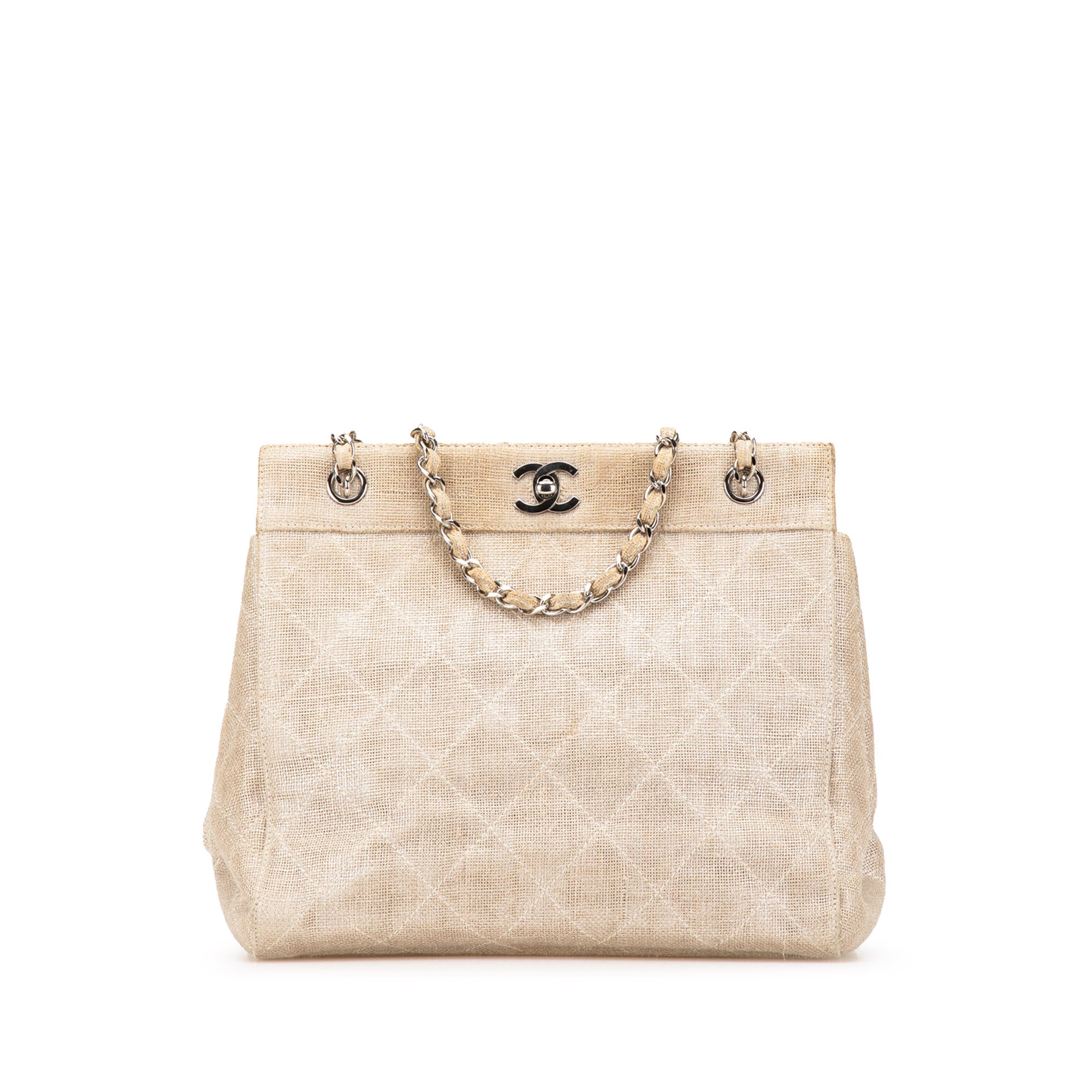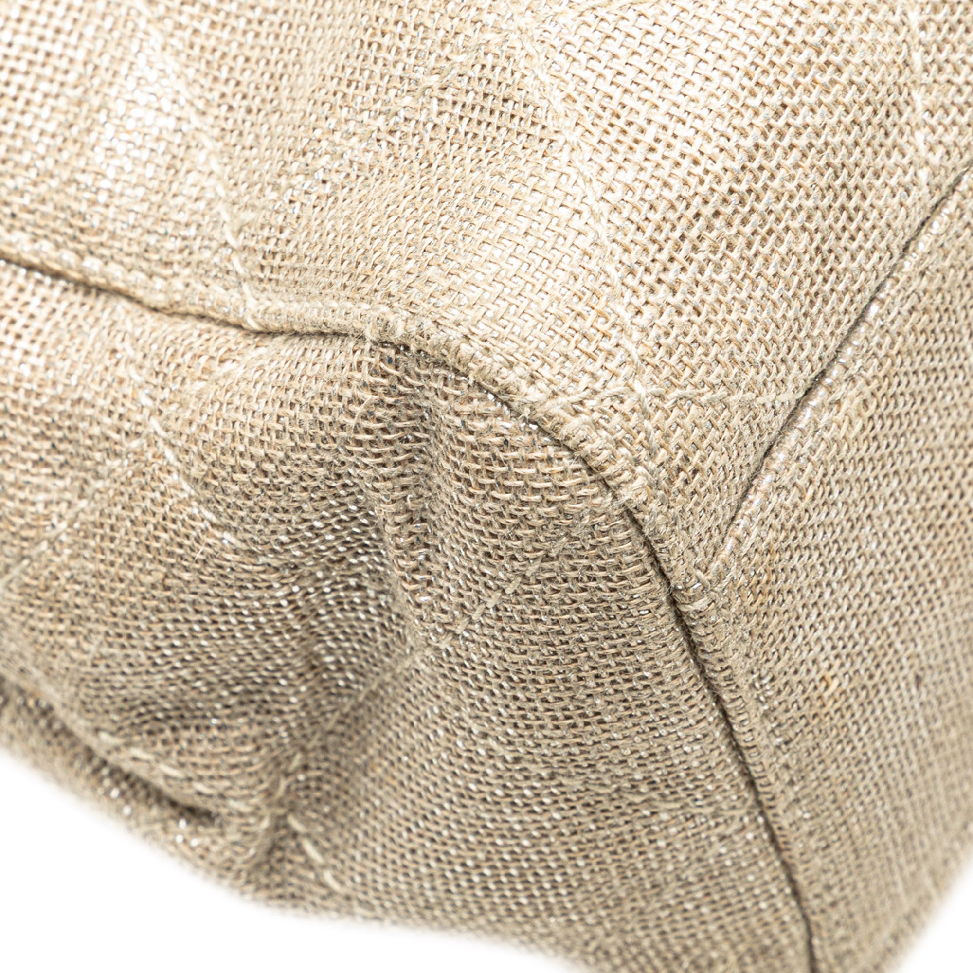 This tote features a stitched linen body, linen-woven chain straps, a top CC turn lock closure, and interior zip and slip pockets. Retail Price: 1800.00