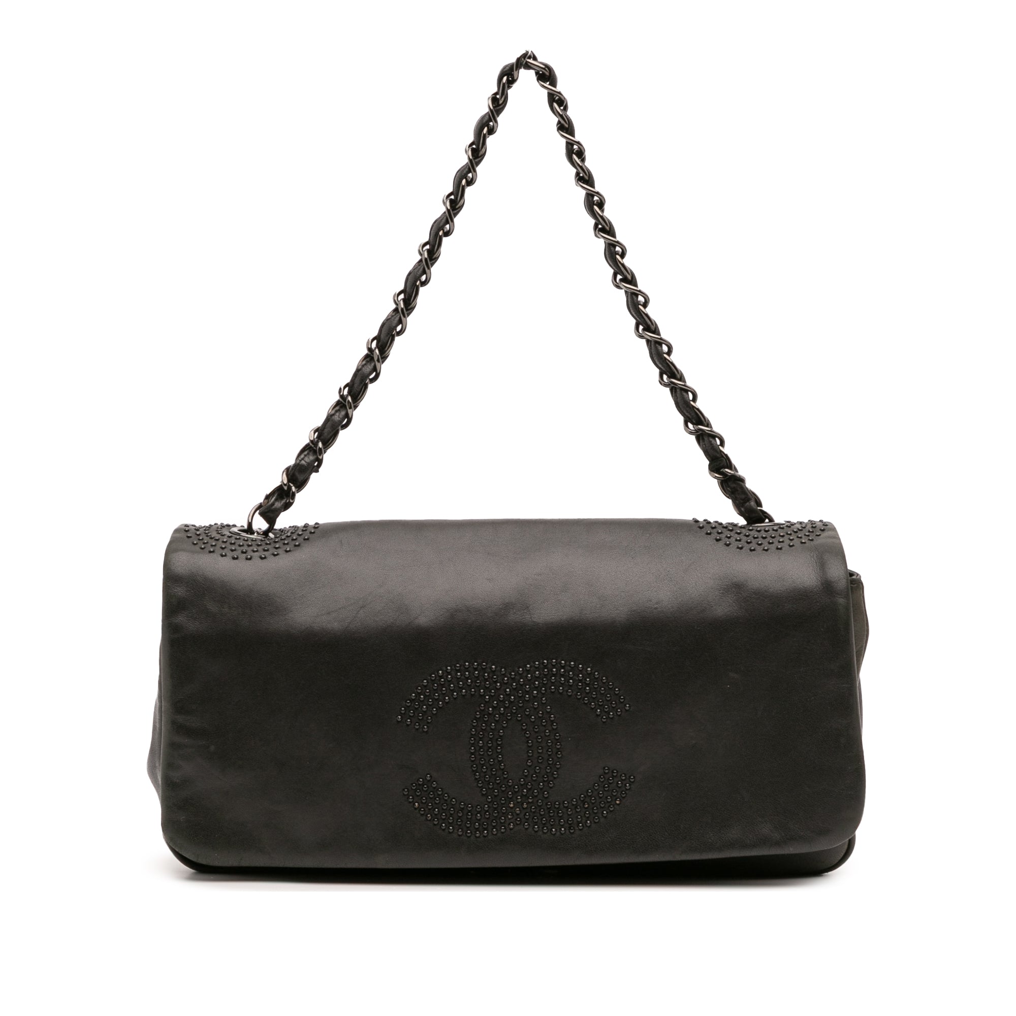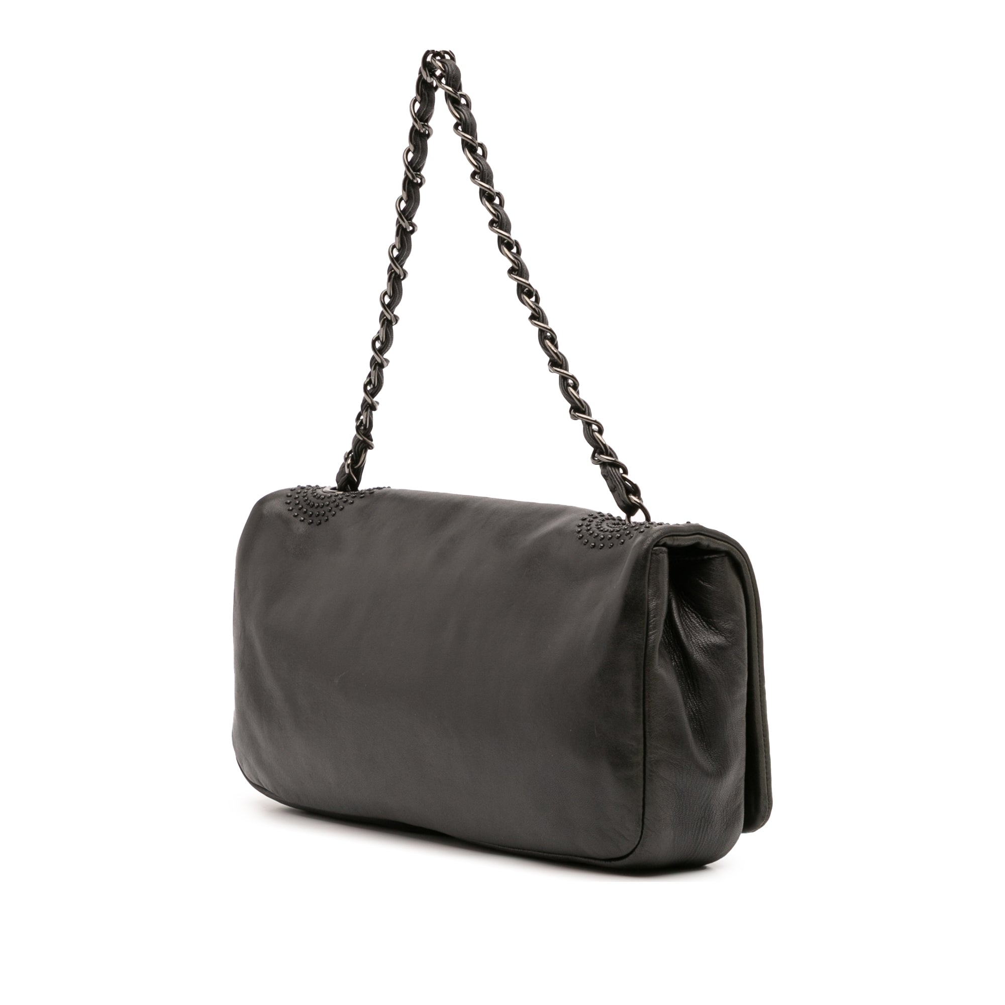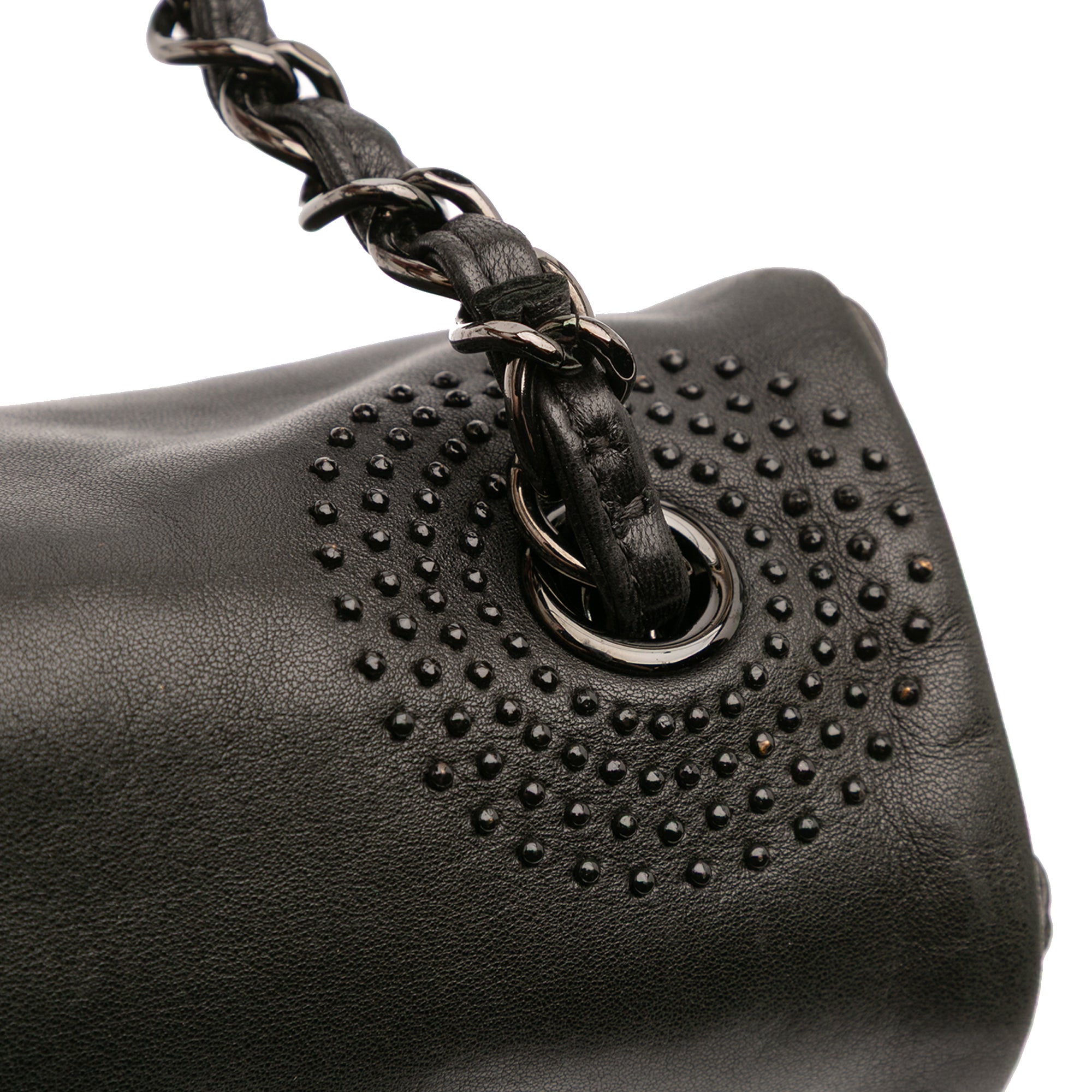 This shoulder bag features a studded lambskin leather body, a leather woven chain strap, a front flap with magnetic closure, and an interior zip pocket. Retail Price: 2750.00