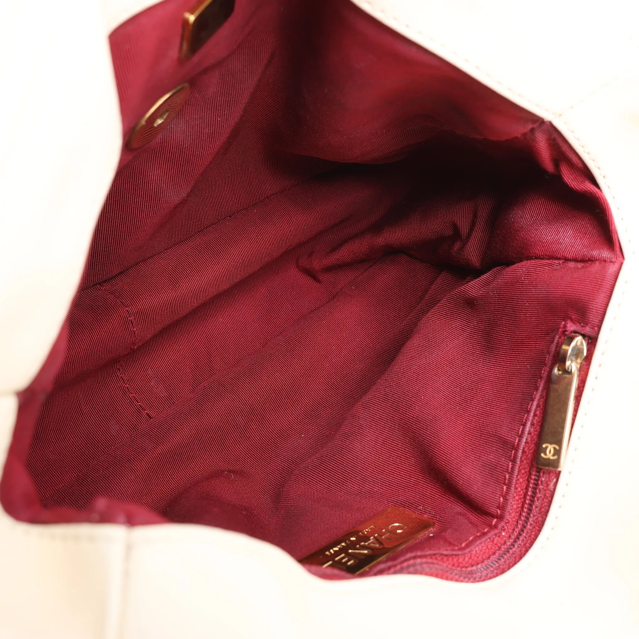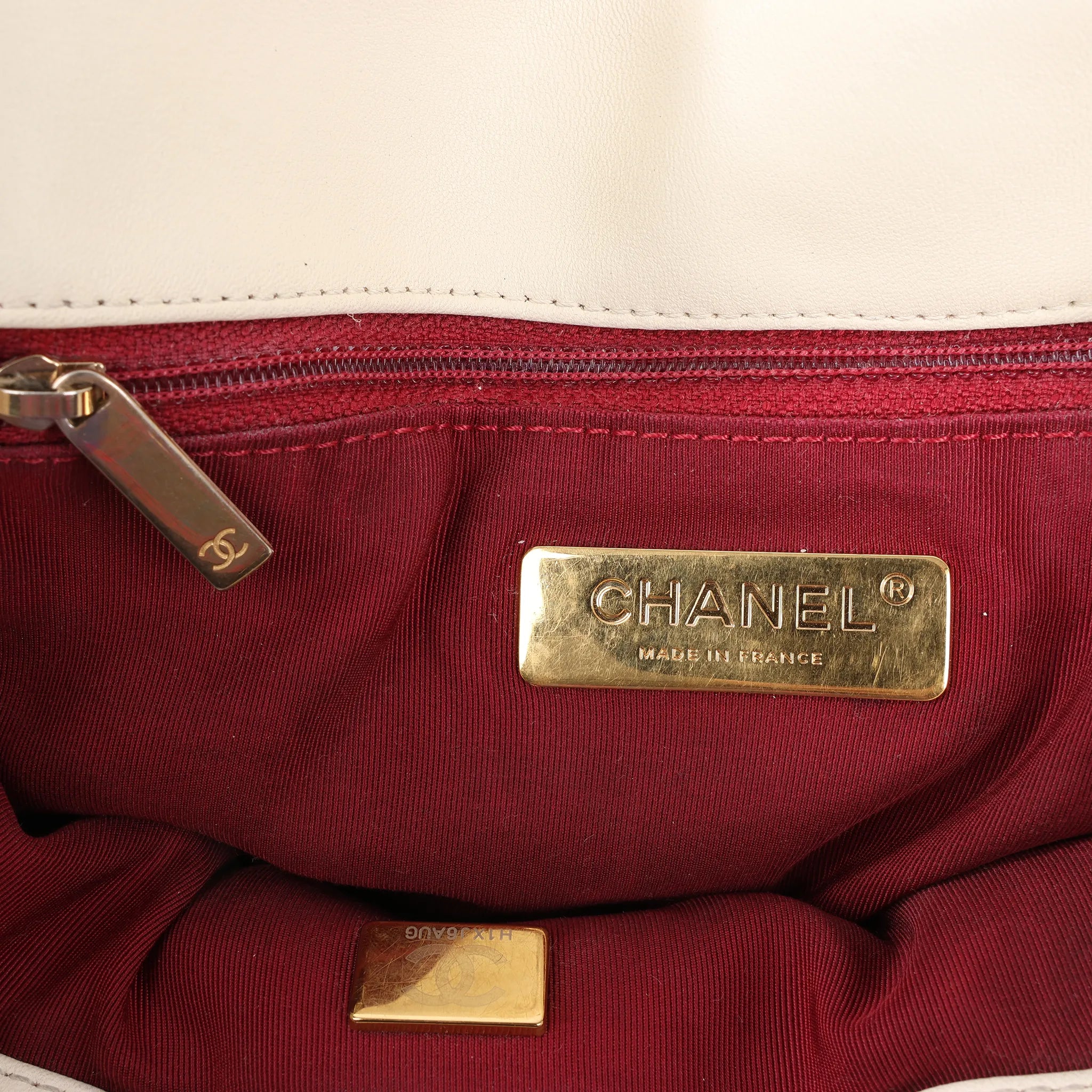 Brand: Chanel Model: Chanel 19Size: LargeWidth: 25 cmHeight: 18 cmExterior Condition: ExcellentInterior Condition: ExcellentCondition Details: The exterior leather is clean and in great condition, the color was restored. The hardware chain and turn lock is still bright and crisp with some seamless surface scratches. The interior lining is in excellent condition, except some small stains. Date code: H1XJ6AUGColour: EcruInterior Colour: RedHardware Colour: Gold, SilverMaterial: LeatherComes With: Box, dustbag, brand care guidline