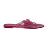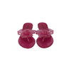 The Chanel Jelly Camellia Flip-Flop is designed with a glitter finish, boasting a camellia flower and a signature gold-tone CC logo emblem. Its pink jelly PVC construction is complemented by a quilted sole, complete with an interlocking CC logo at the heel.